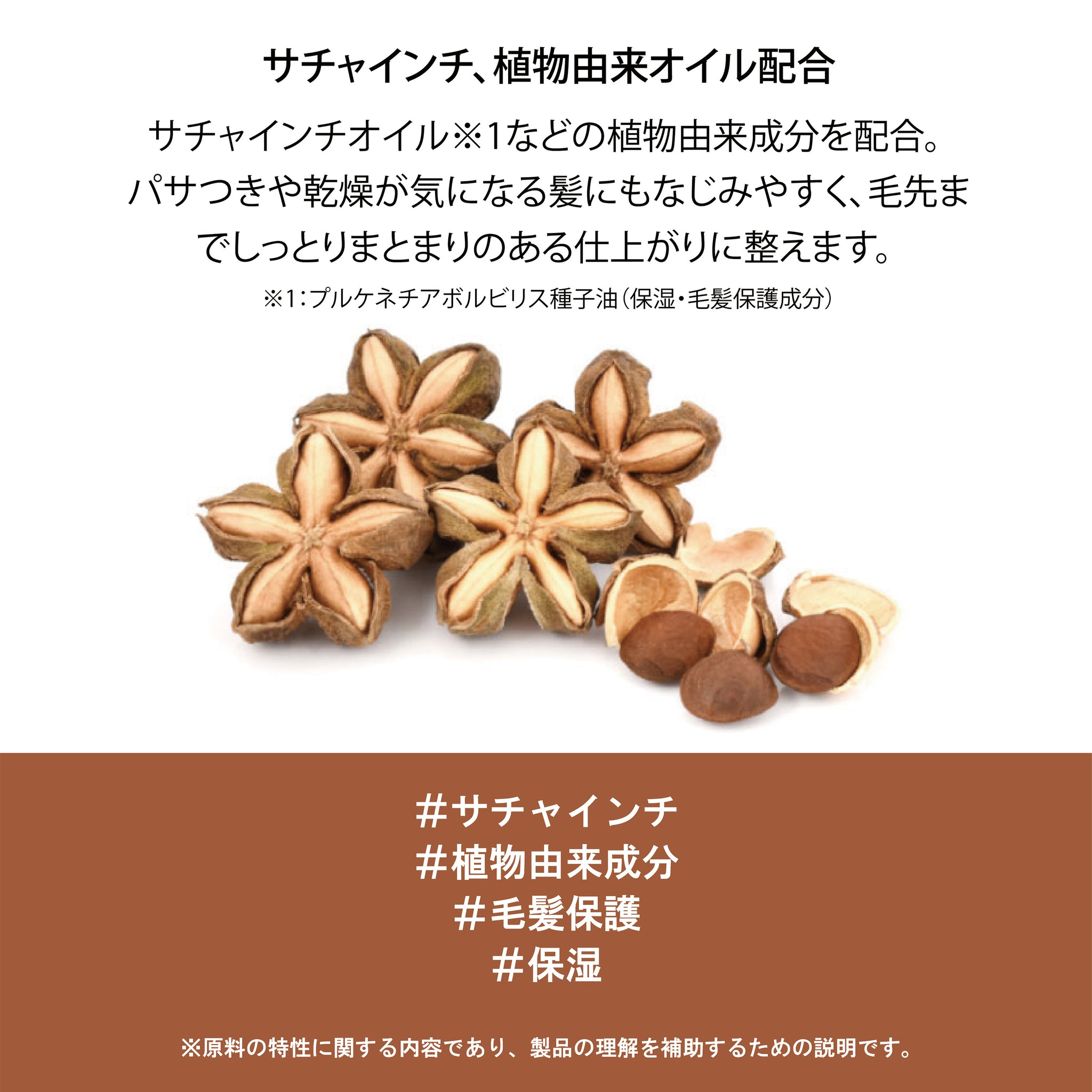 サチャインチオイル※1、アルガンオイル※2配合で、毛先までしっとりまとまりのある、つややかな印象に整えます。