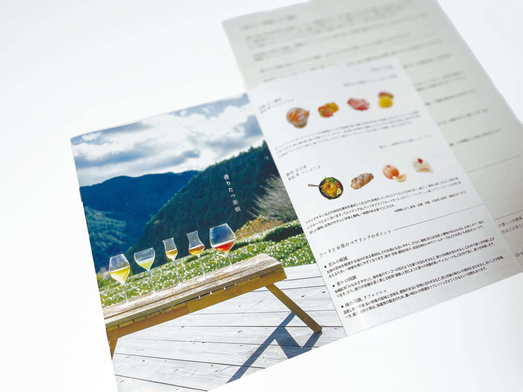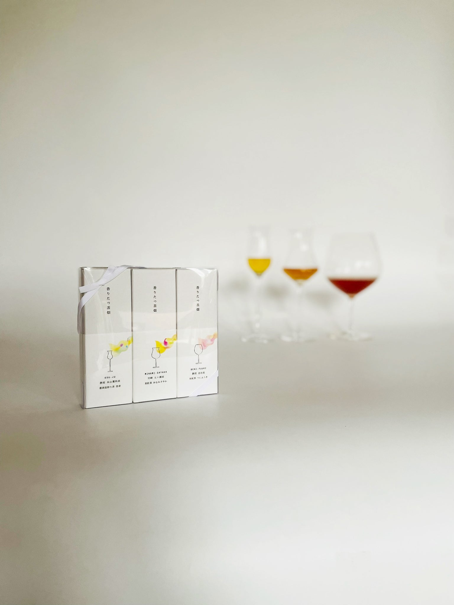 3つの紙箱をクリアボックスに入れた状態で白リボン包装。お茶の紹介、フードペアリングを記載したB6サイズのリーフレット、お湯・水出しの飲み方案内書(日本語・英語1枚ずつ、B5サイズの和紙の3つ折)付。