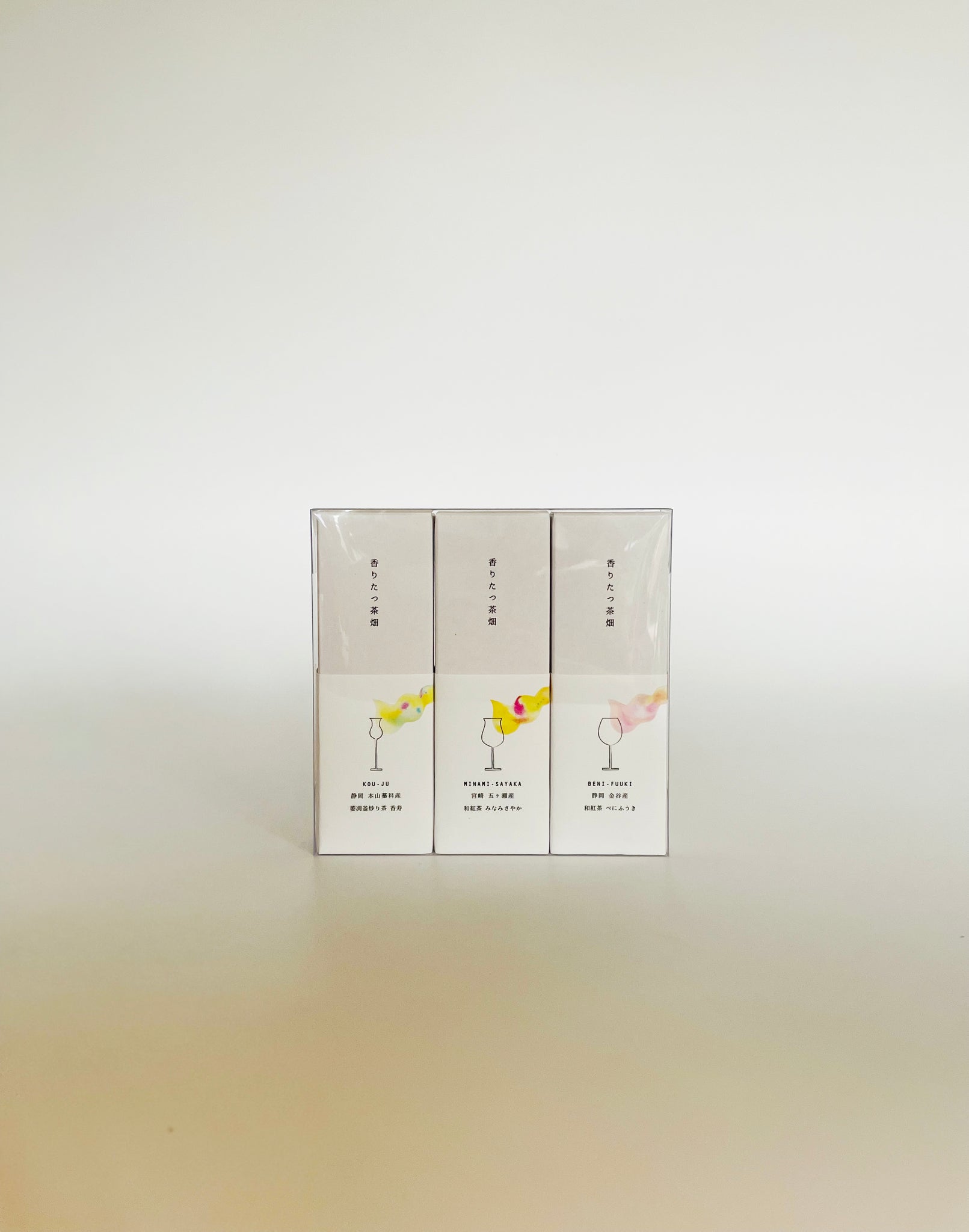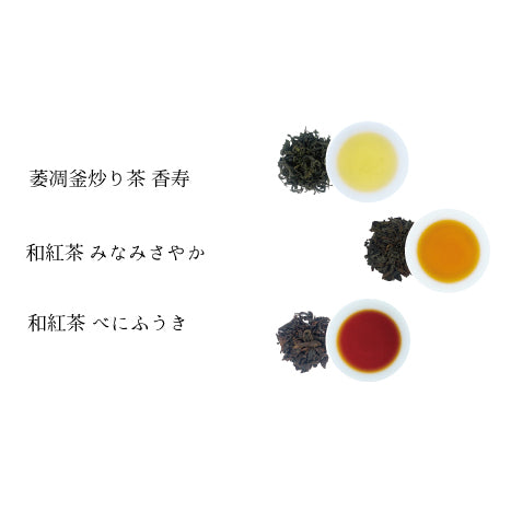 市場でほぼ出回らない高級シングルオリジン日本茶(煎茶・萎凋釜炒り茶・和紅茶)のティーバッグ茶葉商品5品種セット「香りたつ茶畑」のうち3種類、「萎凋釜炒り茶香寿」「和紅茶 みなみさやか」「和紅茶 べにふうき」をセットにした商品。