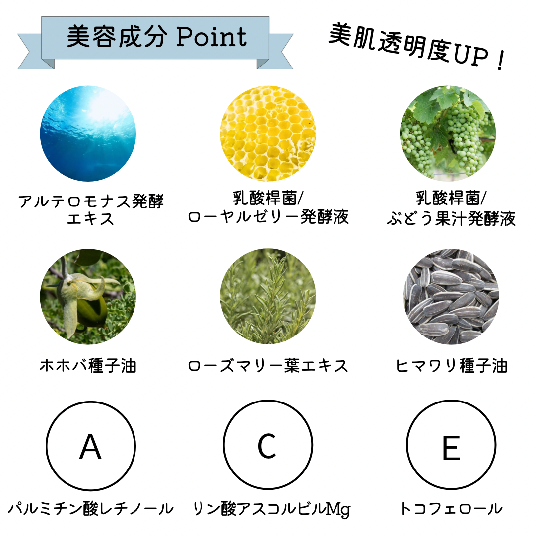 ビタミンエース、美肌菌、オーガニックエキス、サポート成分を独自配合