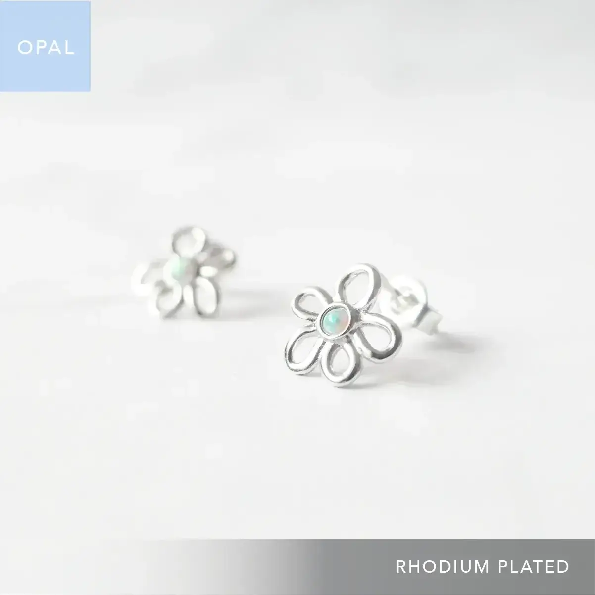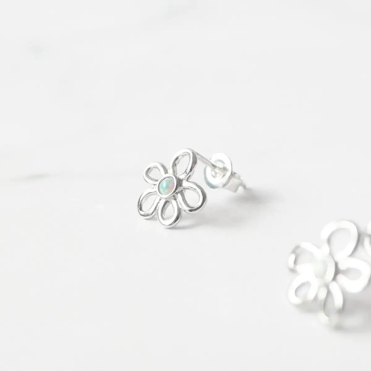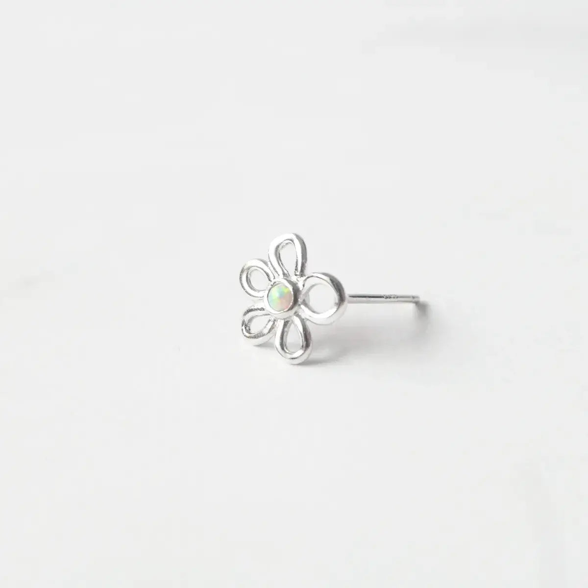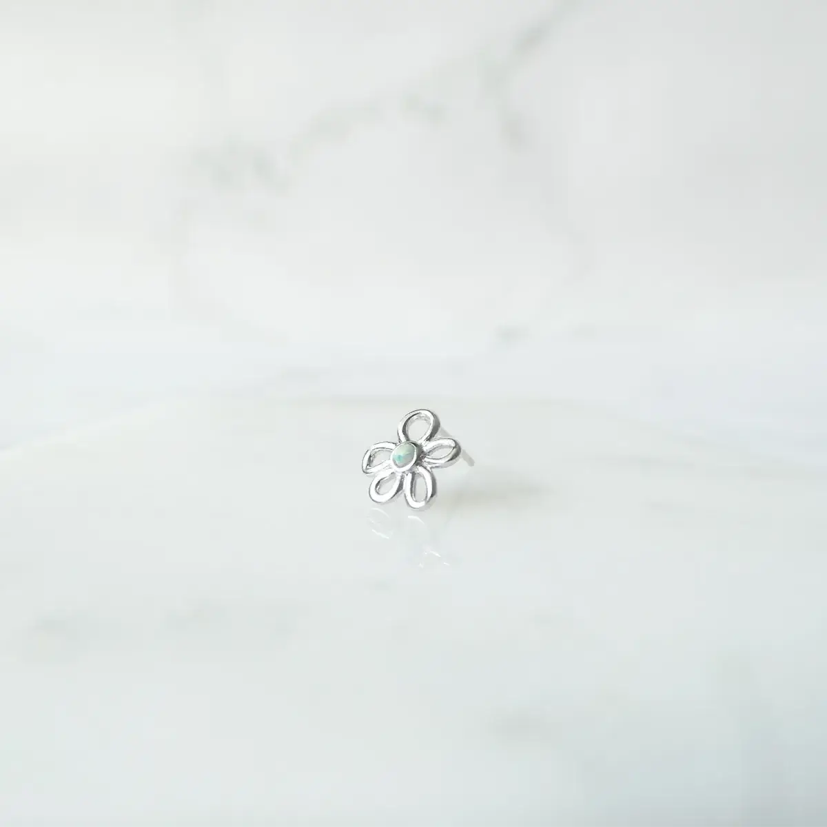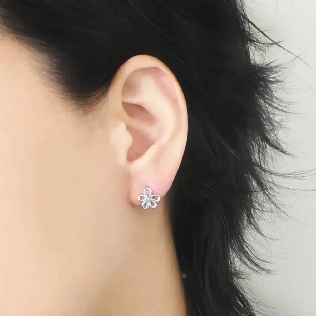 繊細なシルバーラインで描かれた小さな花モチーフの中心に、天然オパールがやさしく輝くスタッドピアスです。