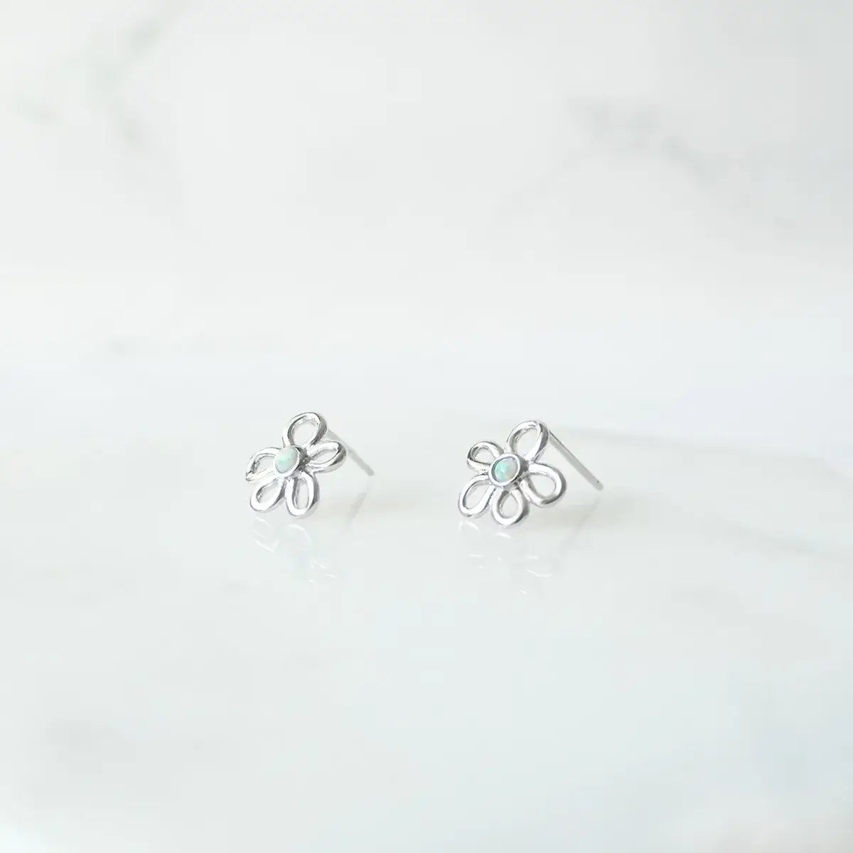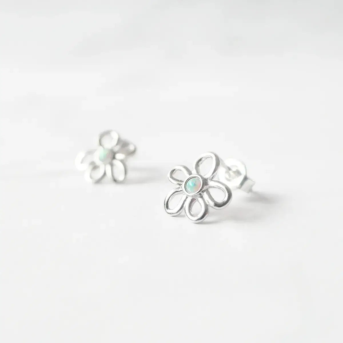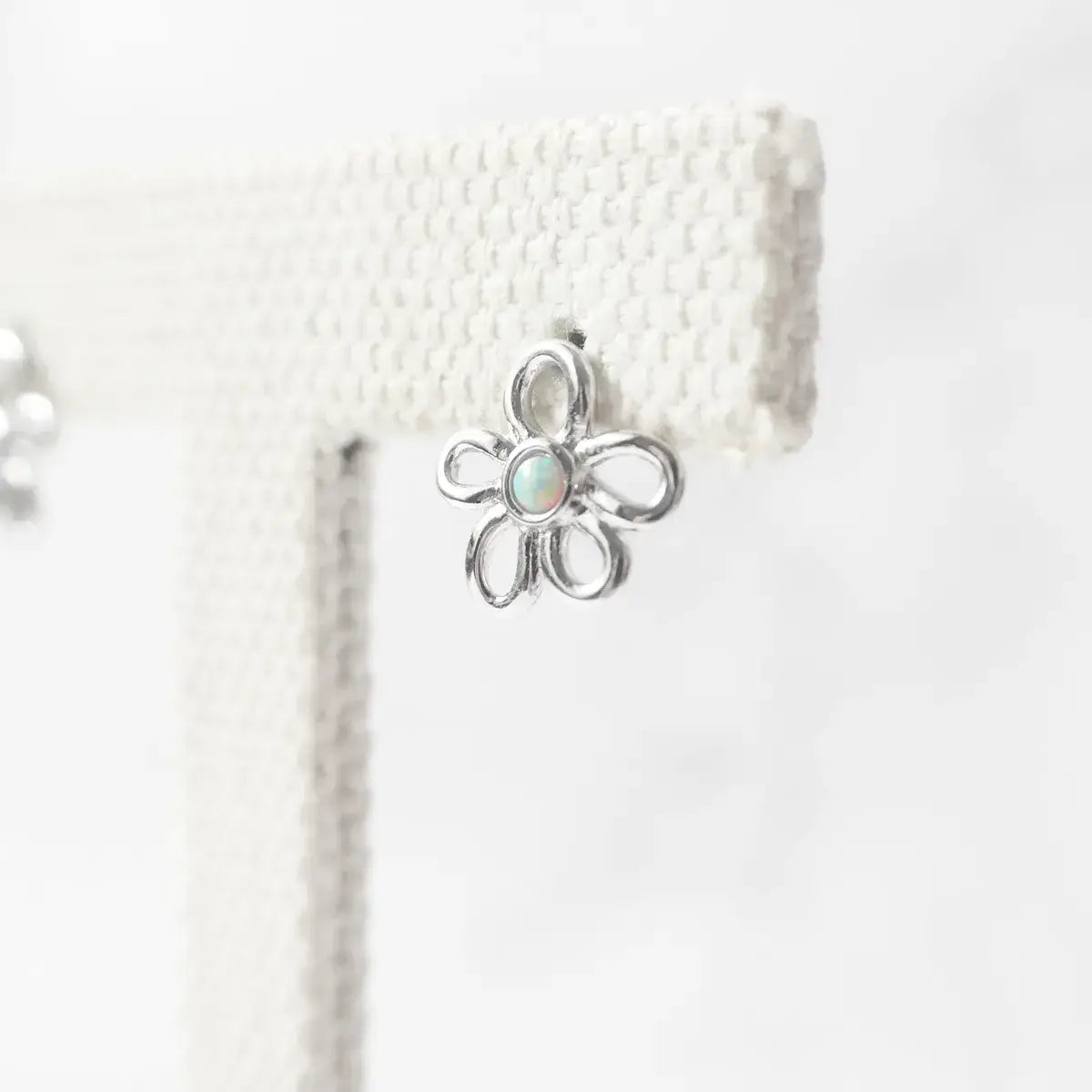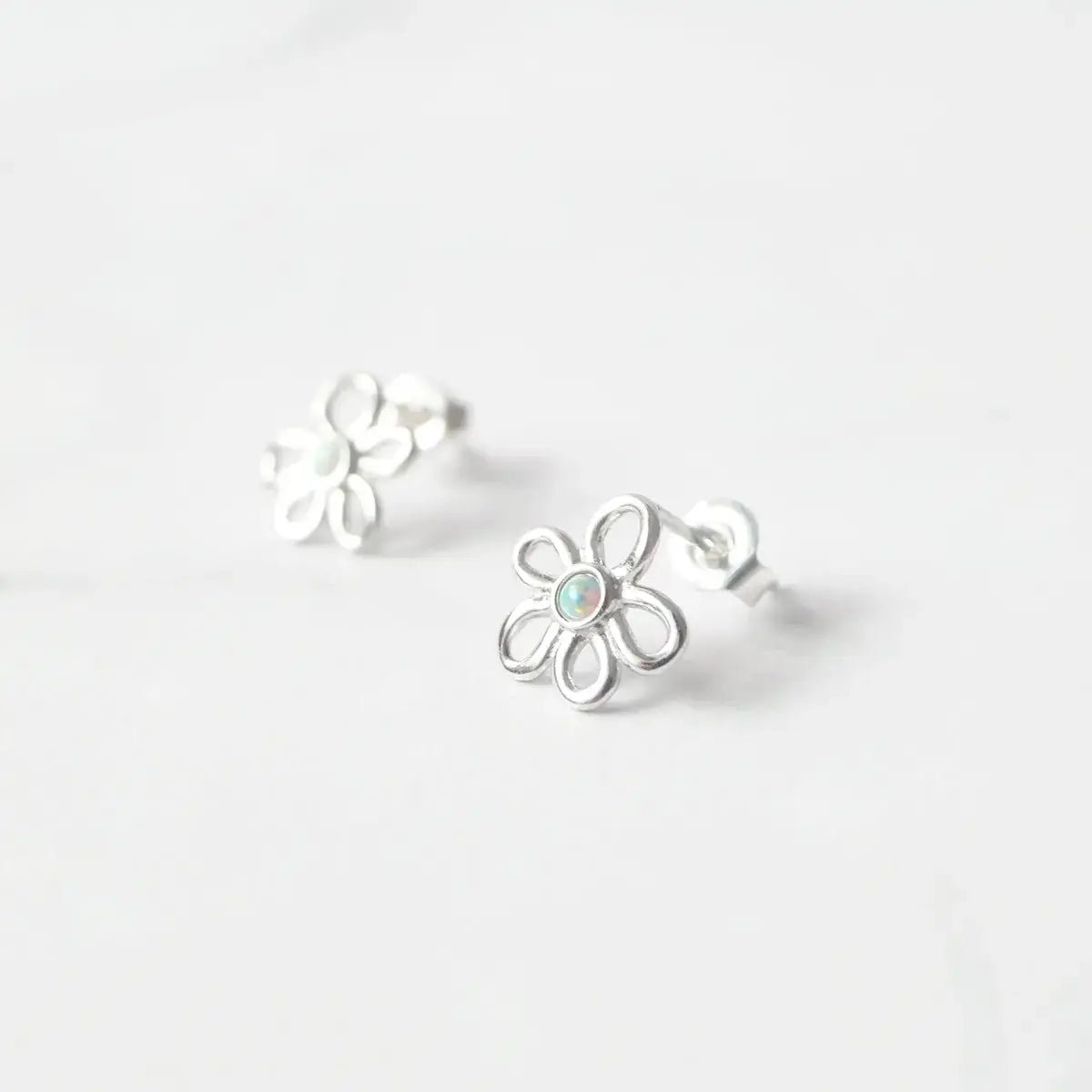 繊細なシルバーラインで描かれた小さな花モチーフの中心に、天然オパールがやさしく輝くスタッドピアスです。