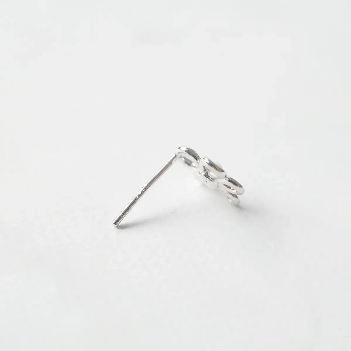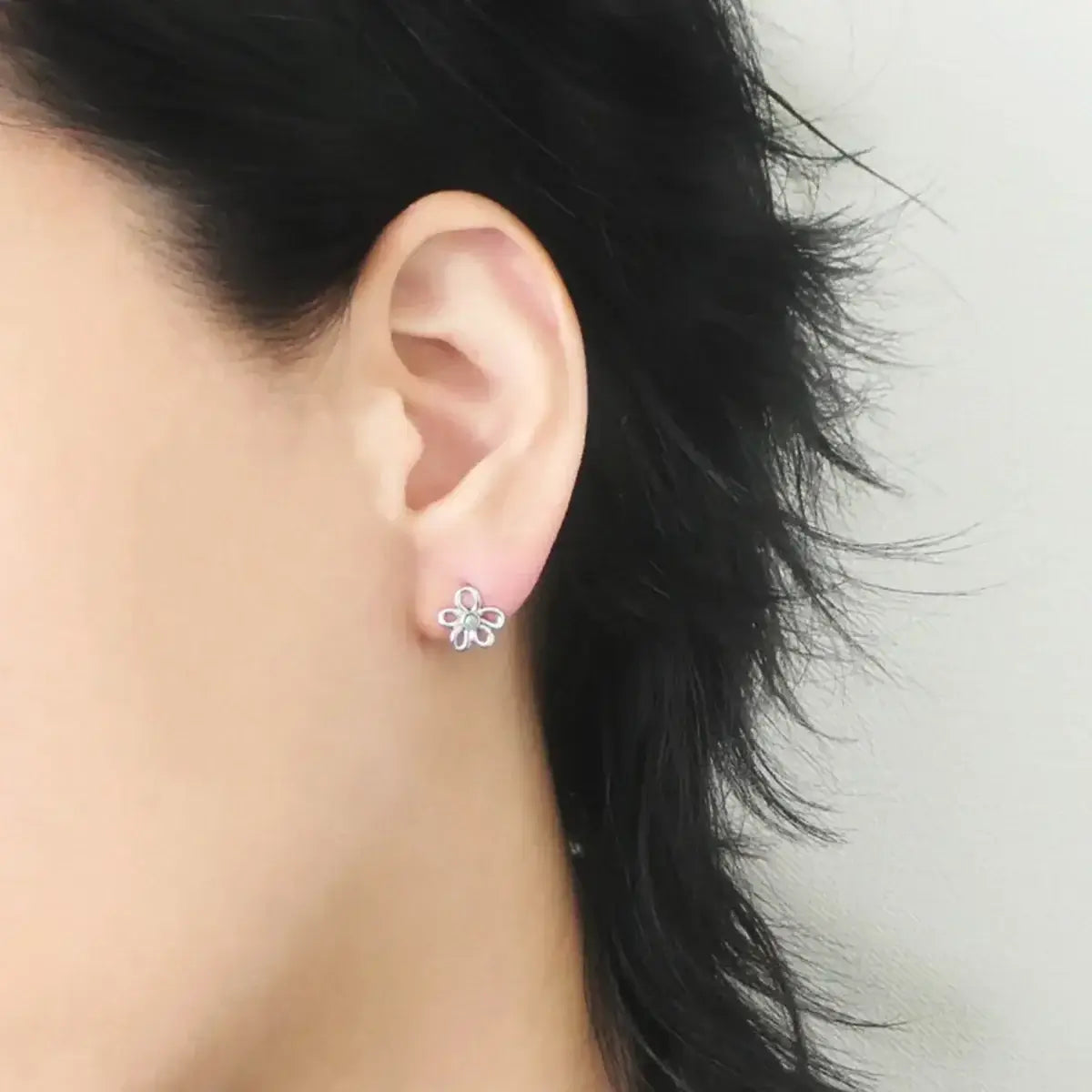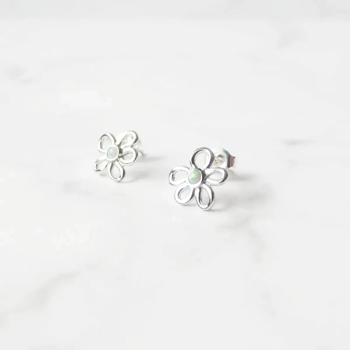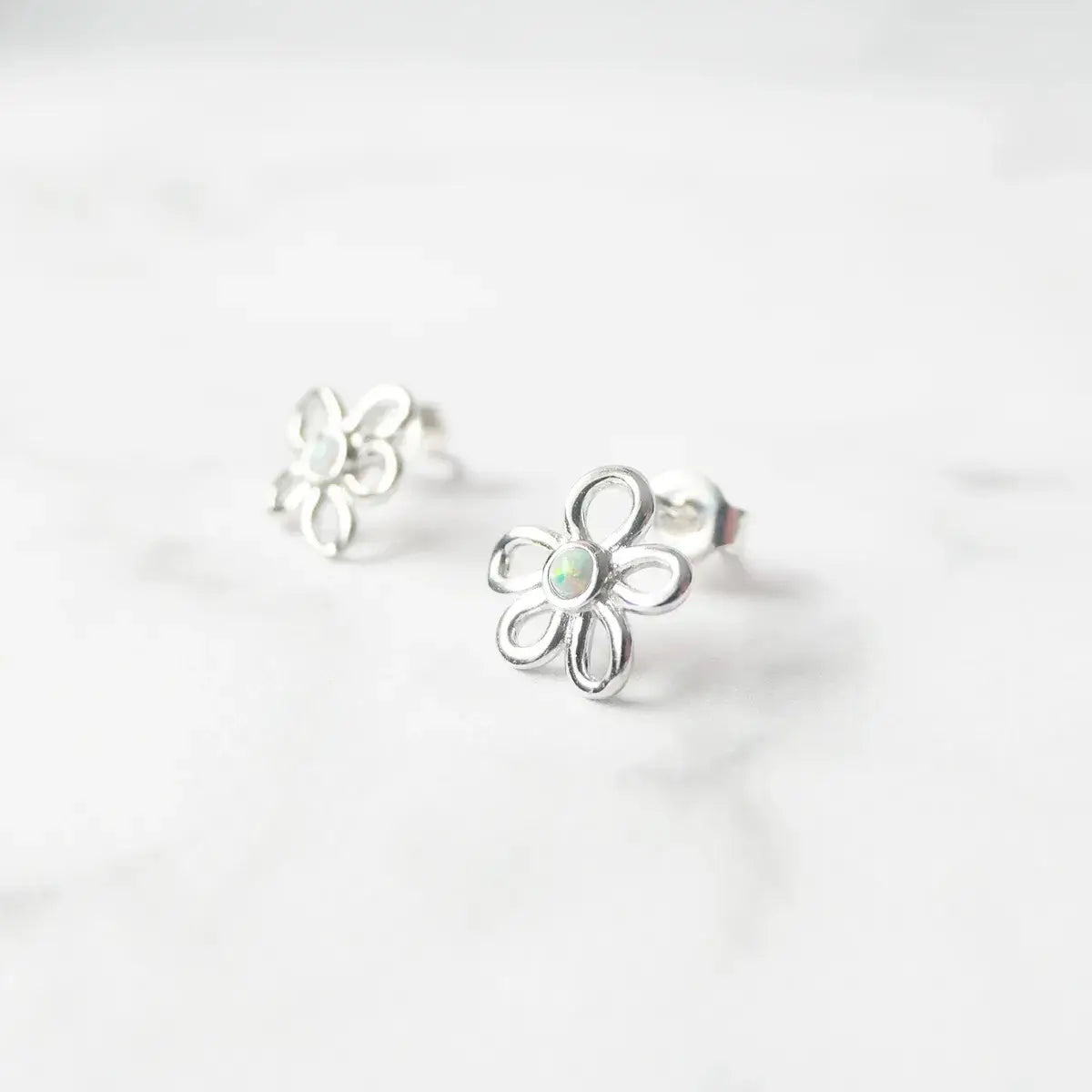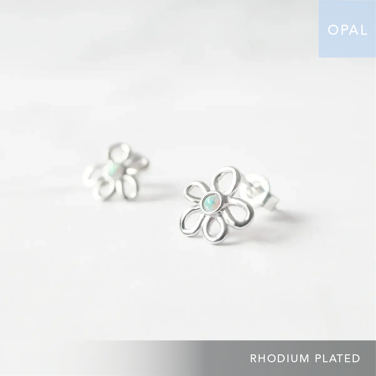 繊細なシルバーラインで描かれた小さな花モチーフの中心に、天然オパールがやさしく輝くスタッドピアスです。