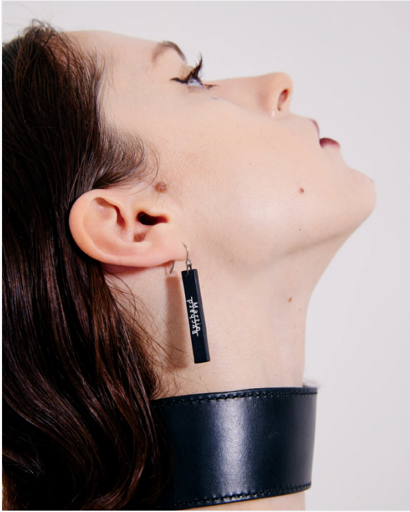 2枚の革が貼り合わせられたブロックに刻印が施された革のピアス。 目立ちすぎず、目立たなすぎず、コーディネートのアクセントになるような存在感。