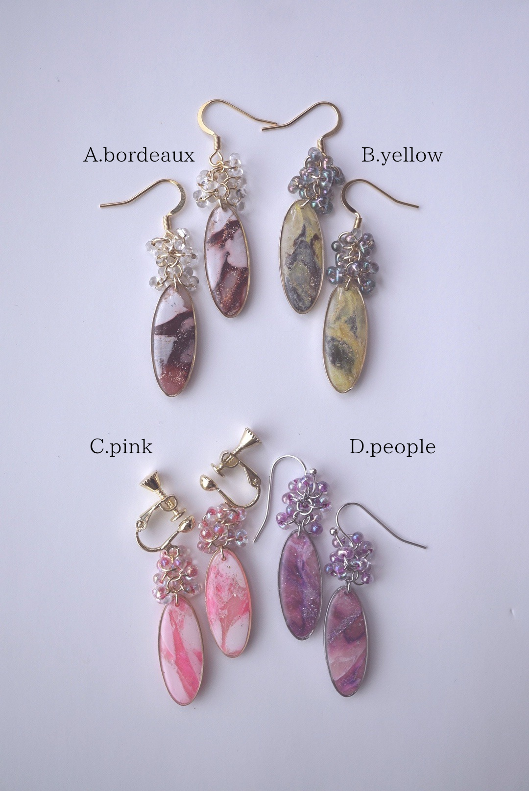 ひとつとして同じ模様のない、マーブル模様のドロップパーツ。