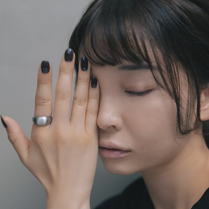 深みのあるチャコールに青いパールを加えた「レイブン」。 落ち着いた色合いと控えめな煌めきで、一色で指先に上品な印象を与えます。