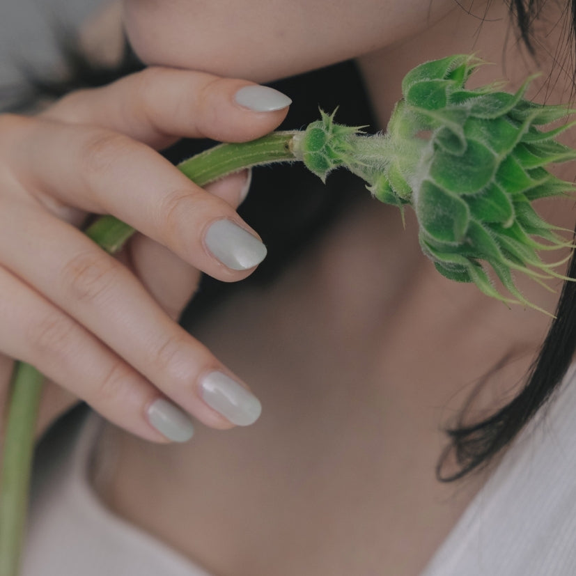 やわらかなライトグリーンに繊細なゴールドのパールをまとった「デュウ」。 清らかな透明感と控えめな輝きが、指先に清楚かつ軽やかな印象を与えます。