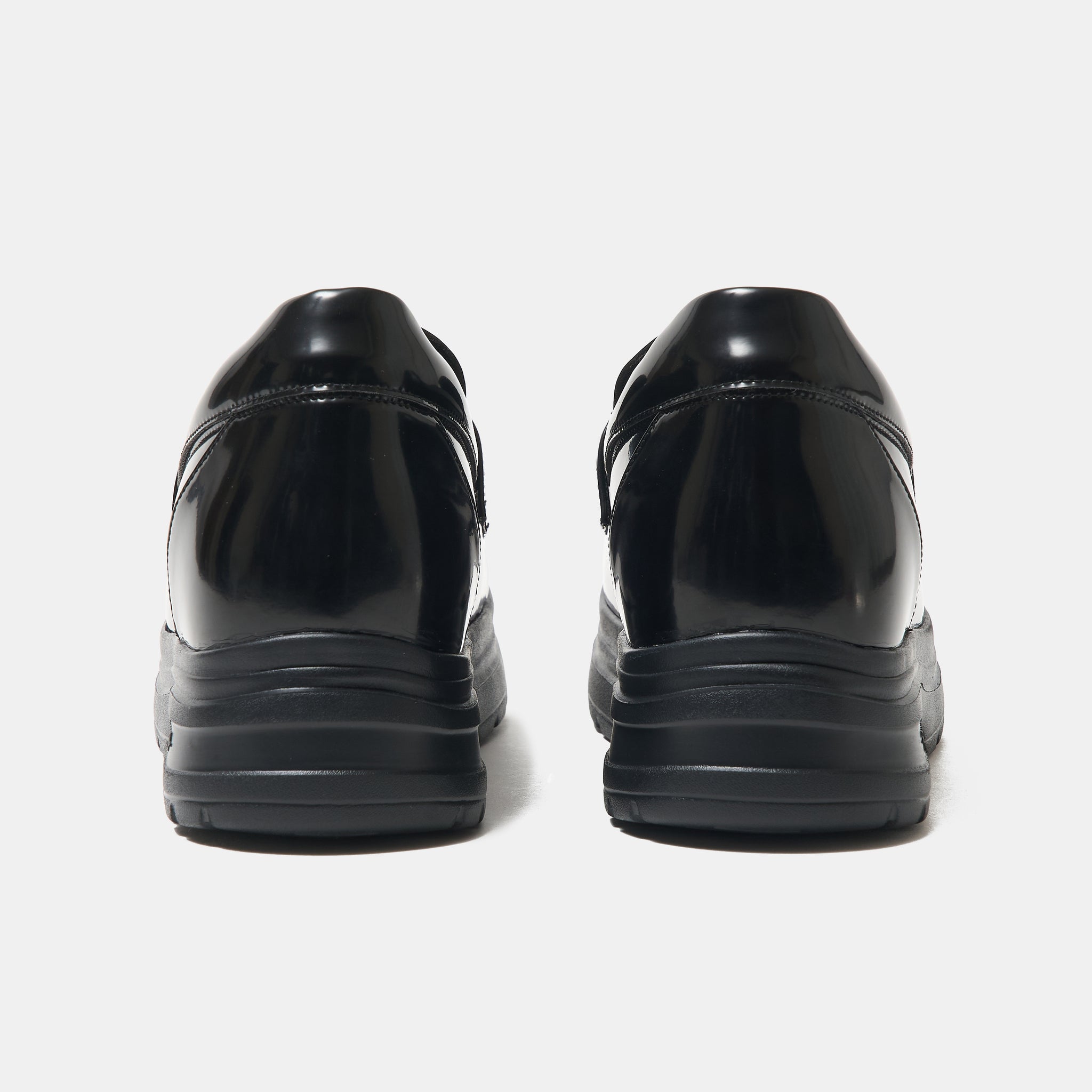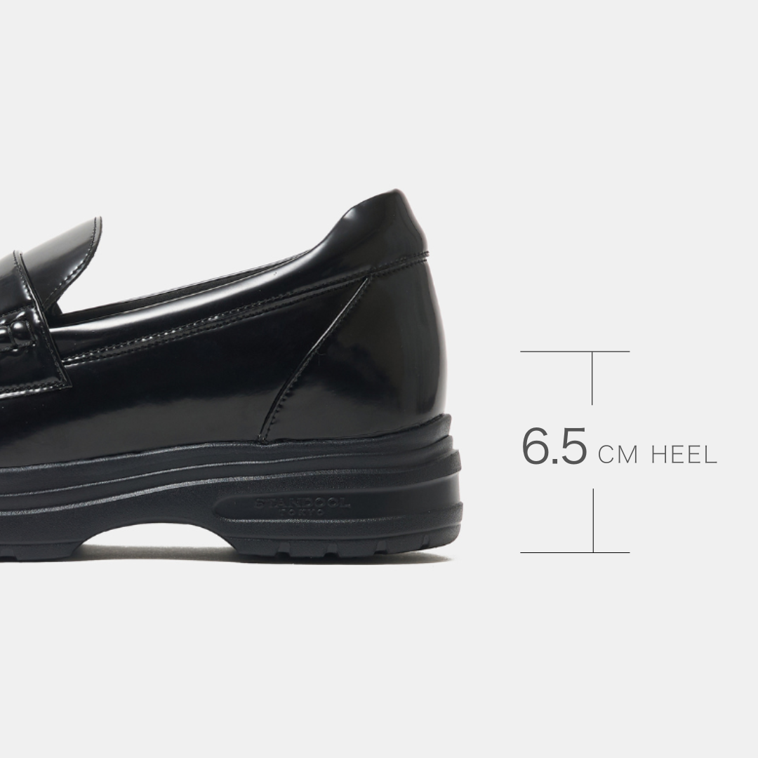 プレーンなローファースニーカーの佇まいの中に、内部にさりげなく高さを仕込んだ構造を備えることで、無理なく自然に6.5cmのスタイルアップを実現。スリムなローファーシルエットが脚のラインをすっきりと整え、足元から全体の印象まで洗練された雰囲気へと引き上げます。