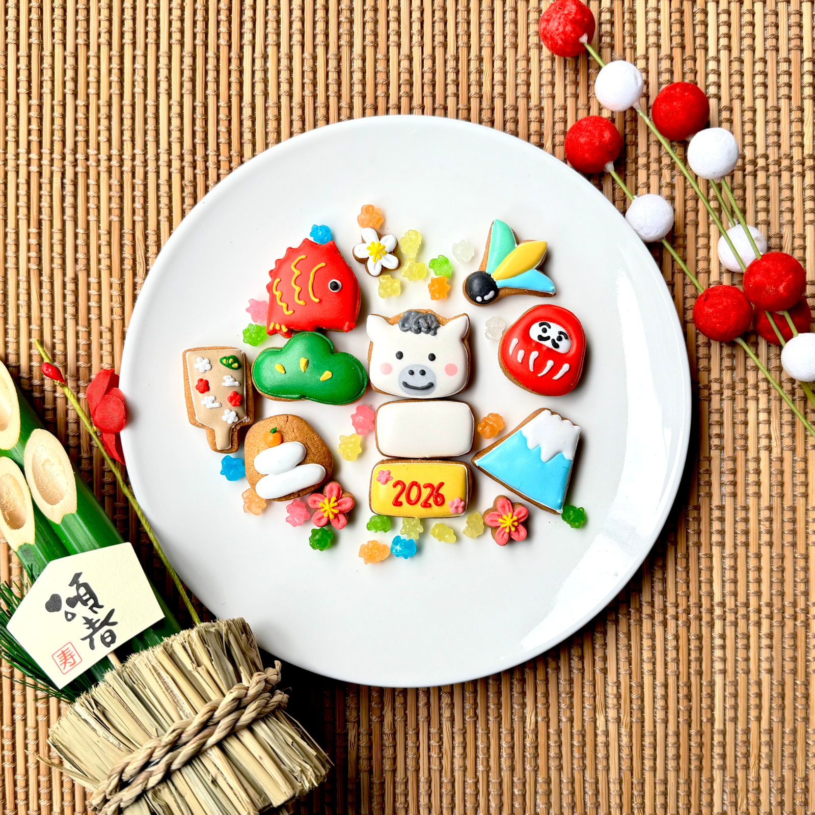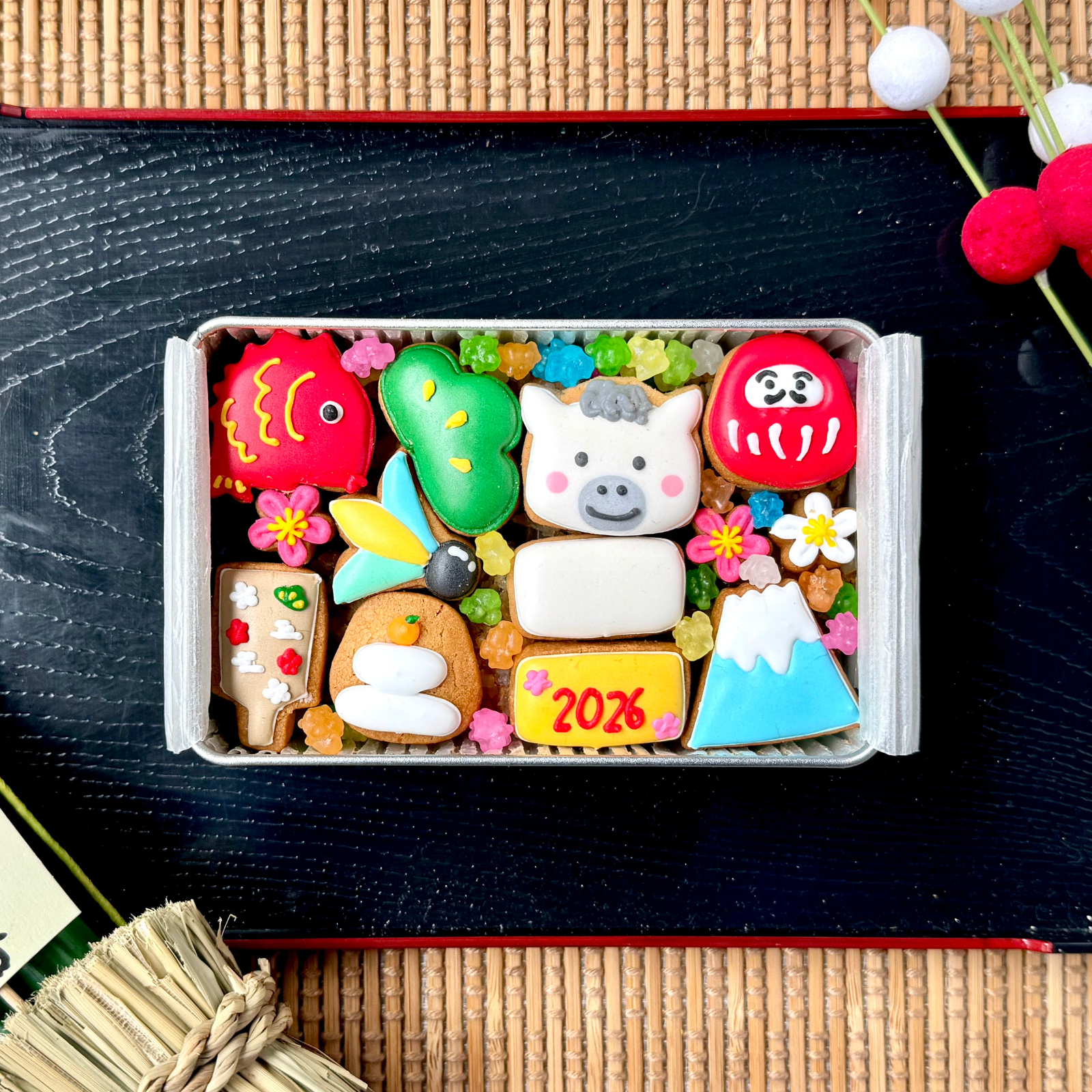 新年の始まりにぴったりな、縁起物をモチーフにしたアイシングクッキーが詰まった特製クッキー缶です。干支、だるま、鯛、富士山、羽子板、松、梅など、日本の伝統的なシンボルがカラフルで可愛らしいデザインで並び、見て楽しい、食べて美味しい一品です。