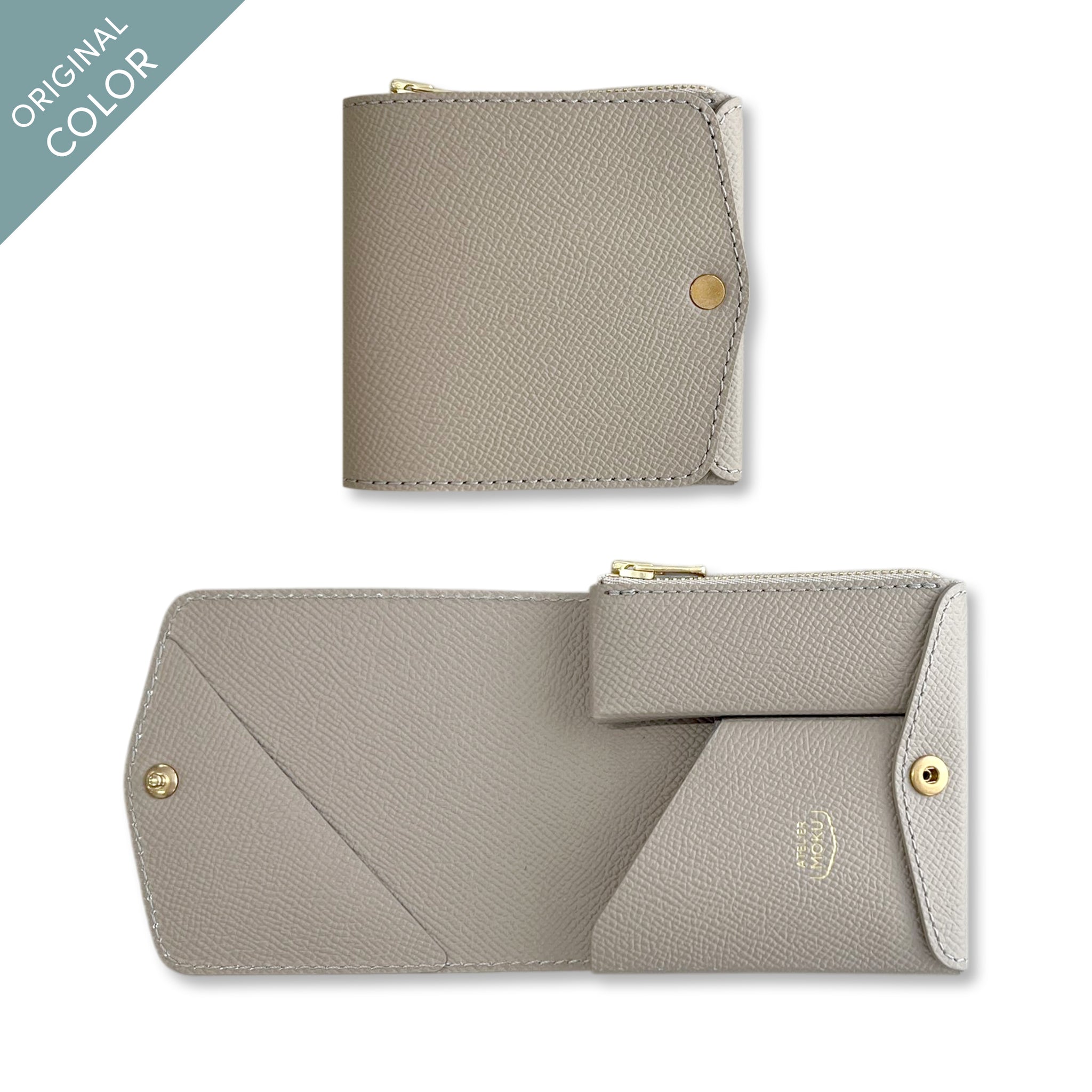 本体カラーに合わせて、ファスナー(引き手を含む)やバネホック(金具部分)の色合いも変更しています。細部まで統一感のある仕上がりで、デザイン性を高めています。