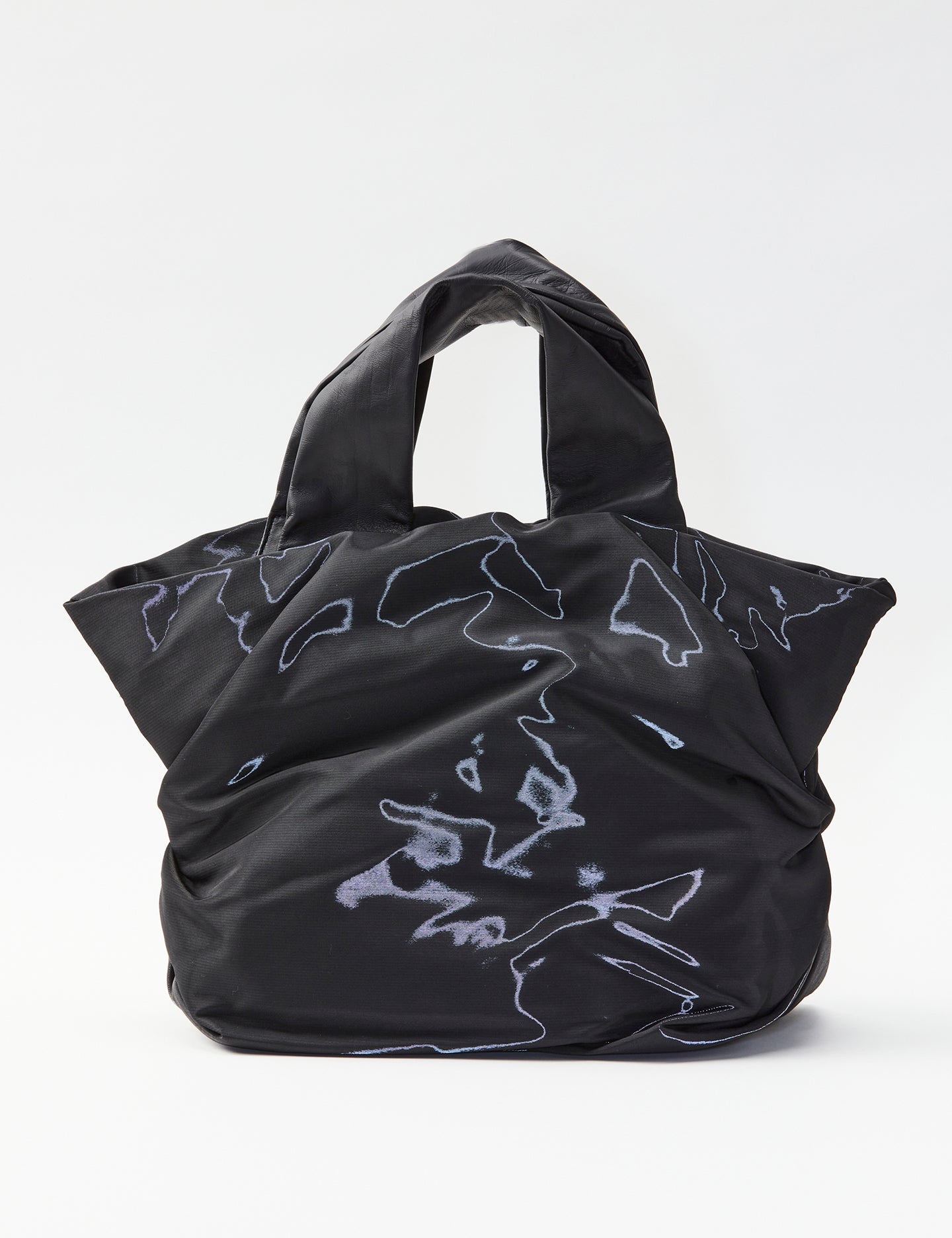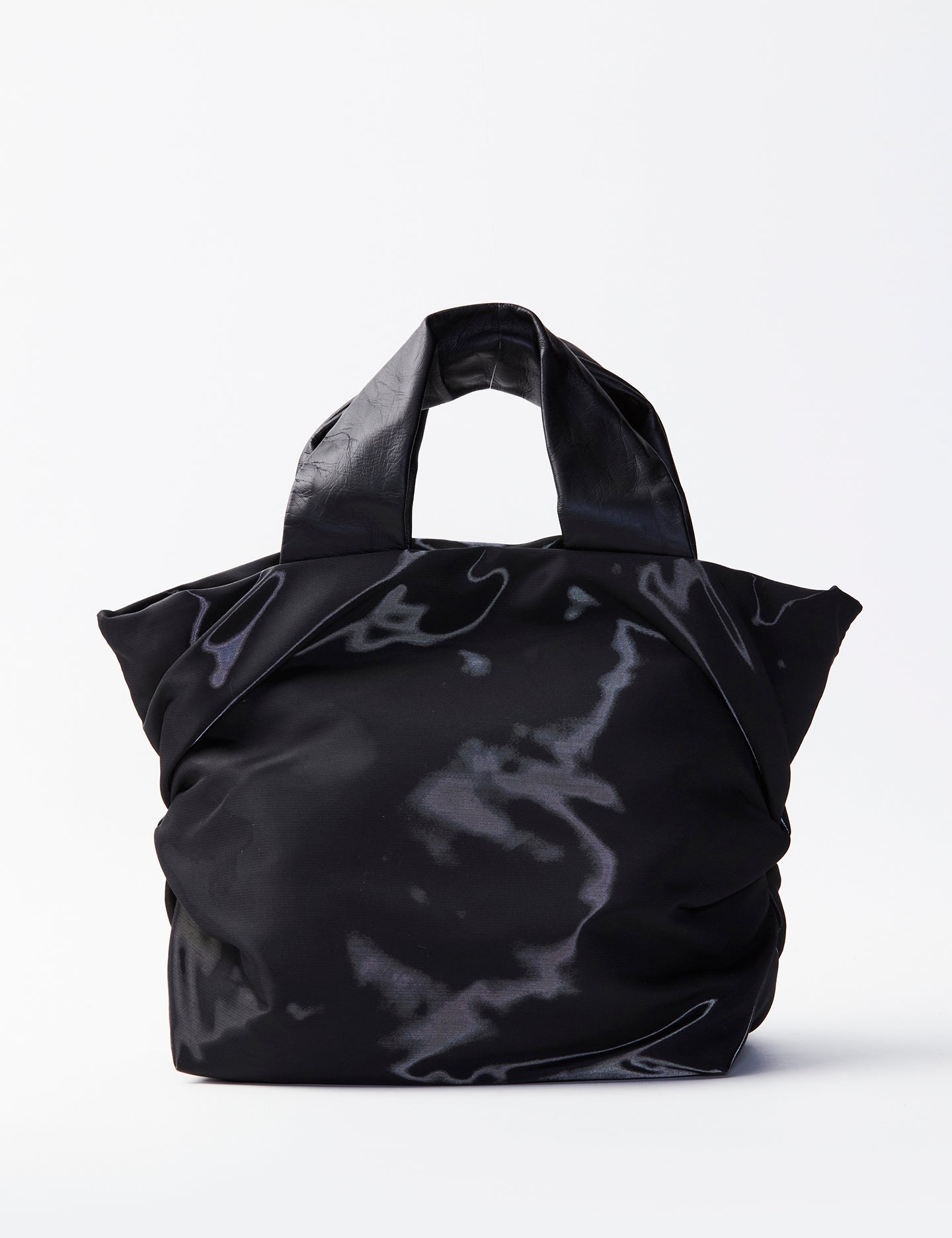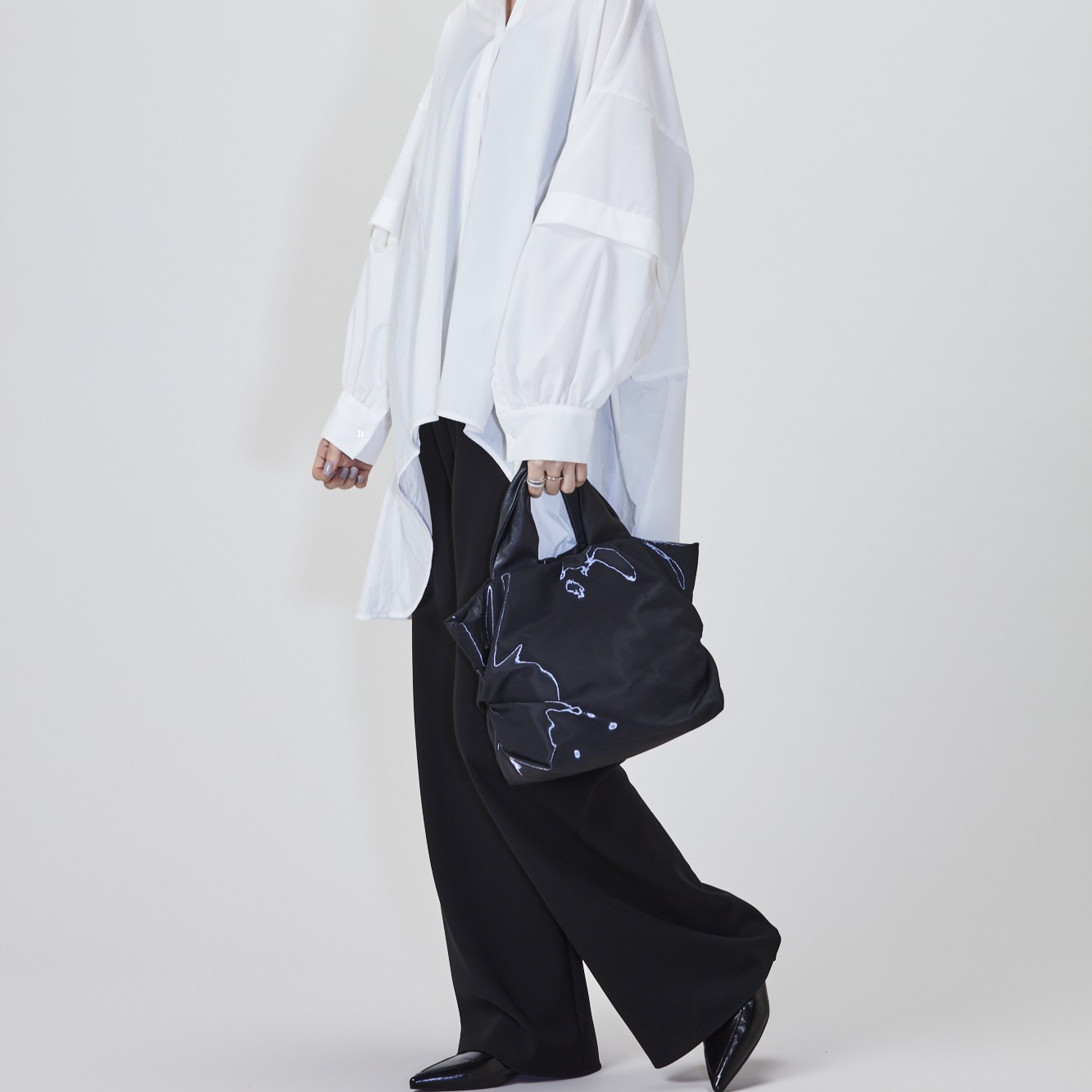光を受けて変化する光沢感は、近未来を思わせるモードさを引き立てる。