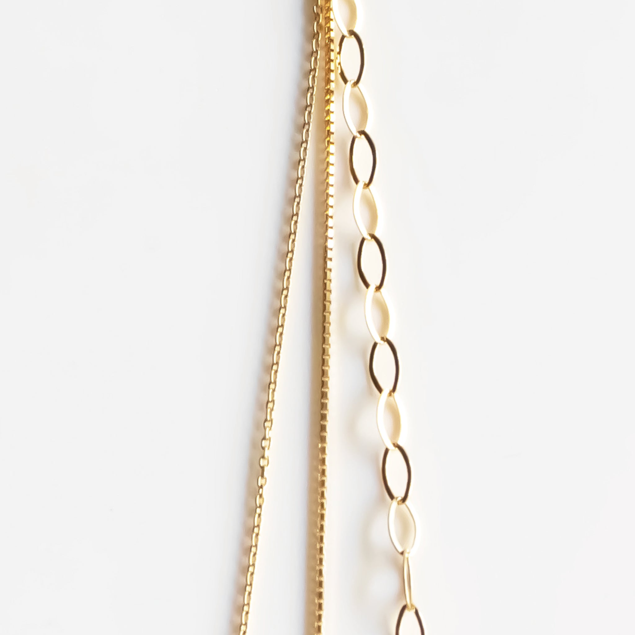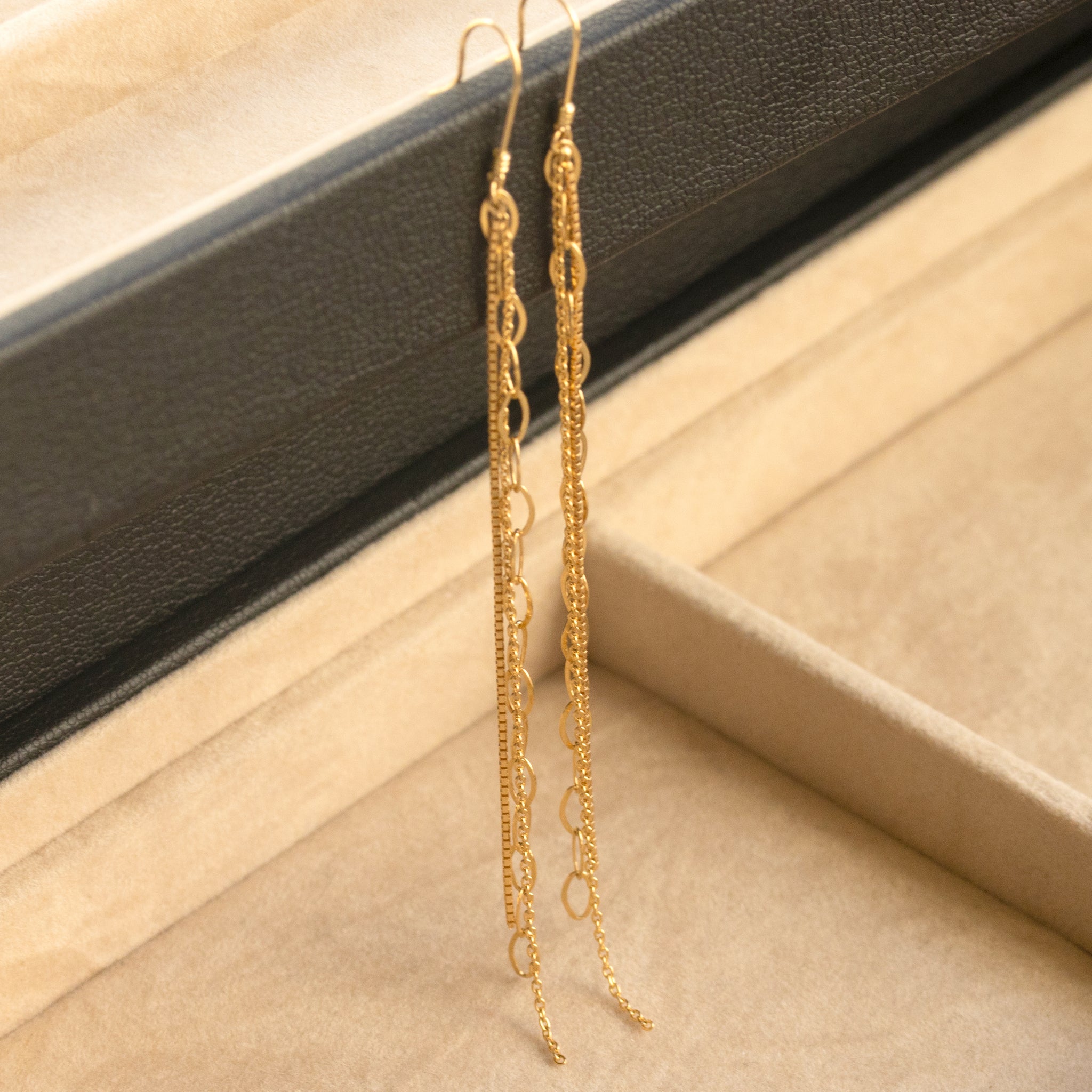 3種類の艶やかなチェーンが連なるピアス