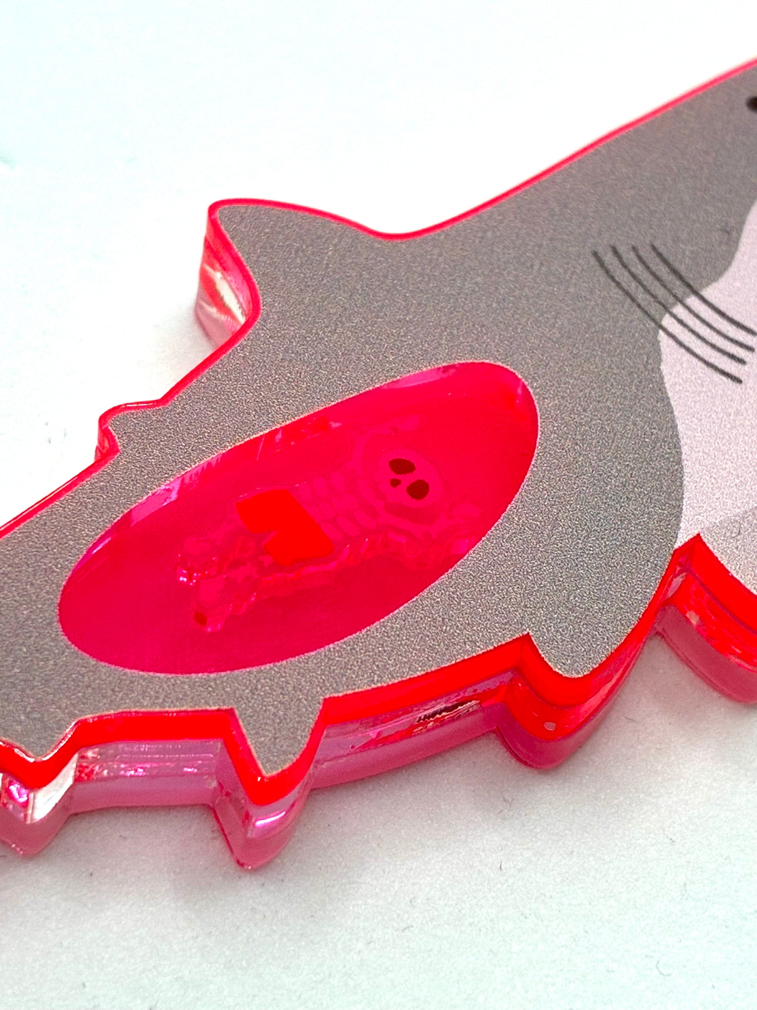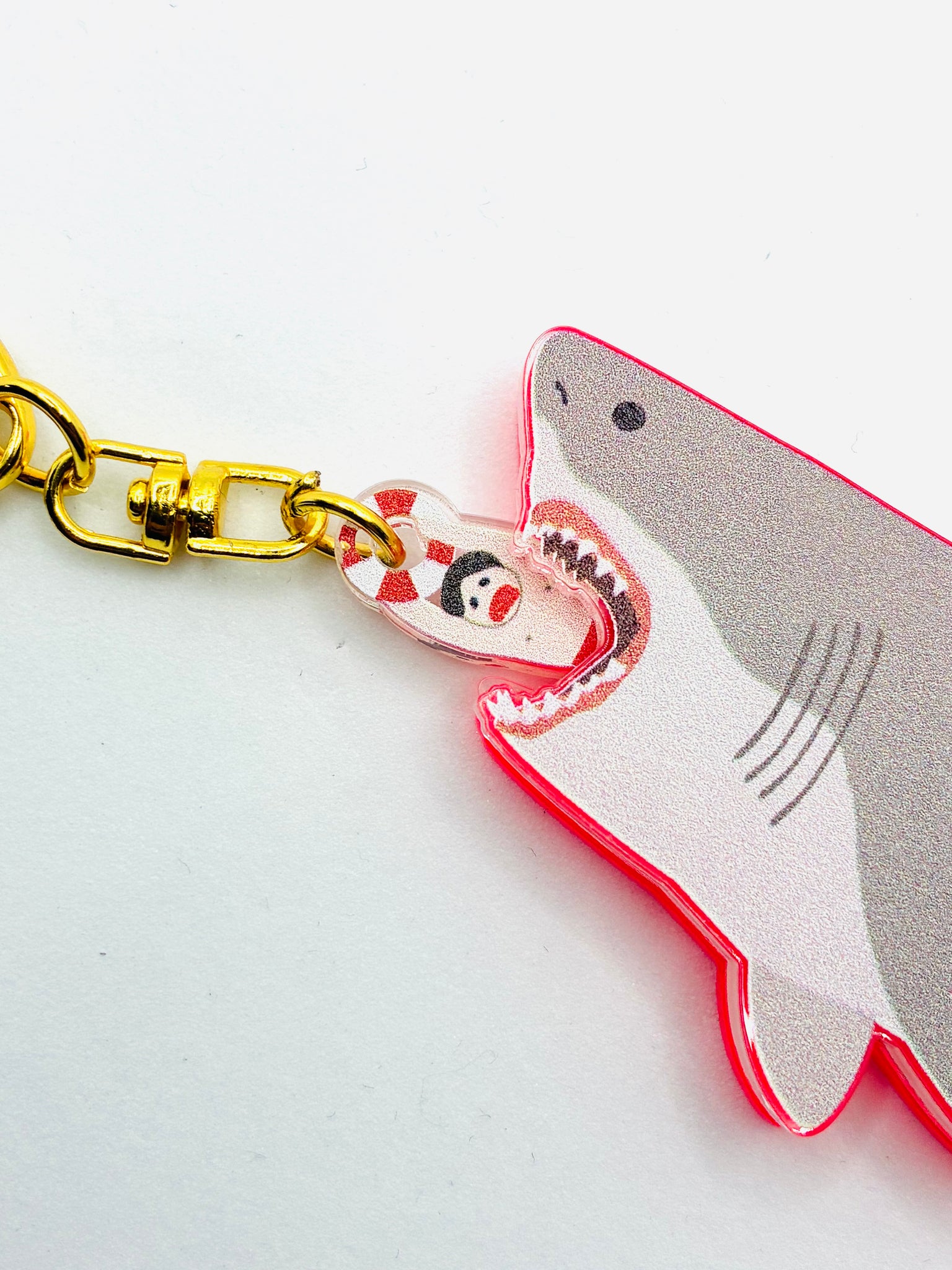 人喰いザメがビーチに現れ大暴れする映画のワンシーンのようなストーリーを楽しめるキーリング。人の部分がサメの口元で上下したり、裏面はサメの胃袋の中が見えて、骸骨がシャカシャカ動くギミックがついています。人に見せたらプレゼントして、思わず笑ってしまうようなユーモアを詰め込みました。