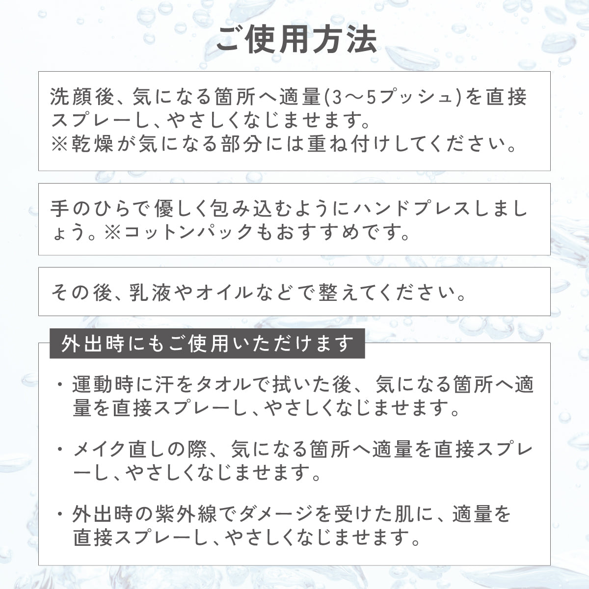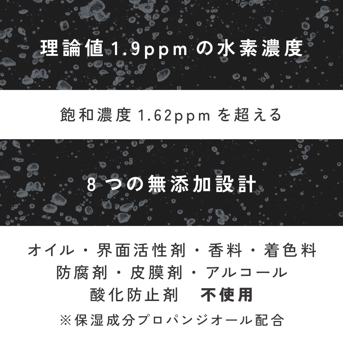 【全成分】水*、ペンチレングリコール、グリセリン、プロパンジオール、BG、プラセンタエキス、スイゼンジノリ多糖体、加水分解コラーゲン、ヒアルロン酸、aーグルカン、グルコシルセラミド、白金、水素 *100%ナノバブル水素水を使用