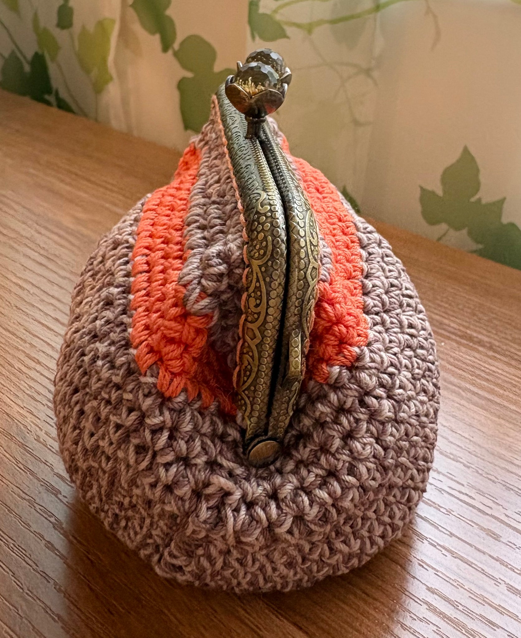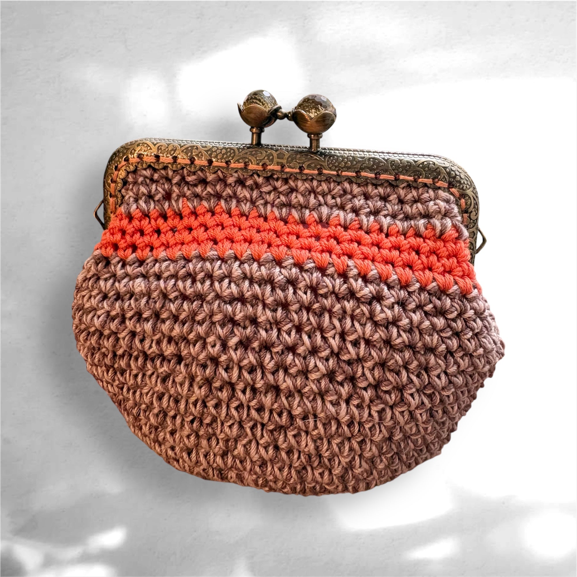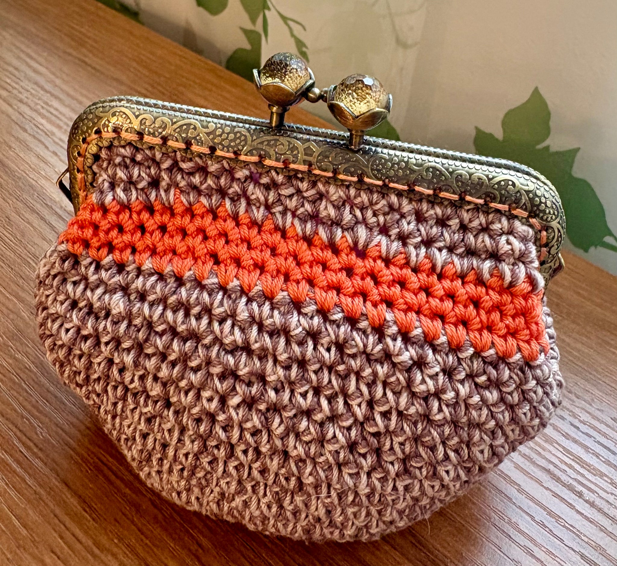 オレンジラインのブラウンがま口ポーチ|M'S  CROCHET(エムズクロシェット)