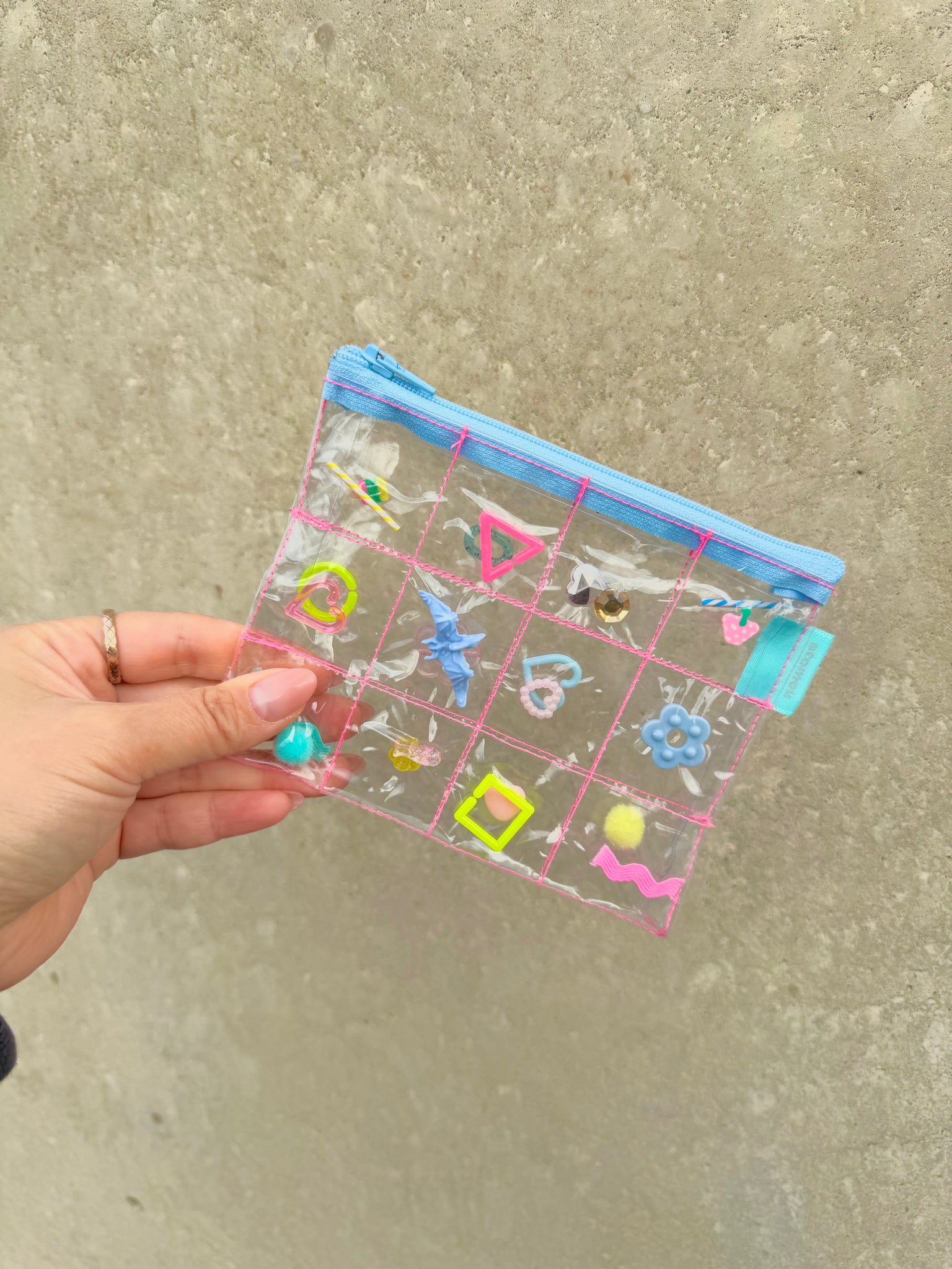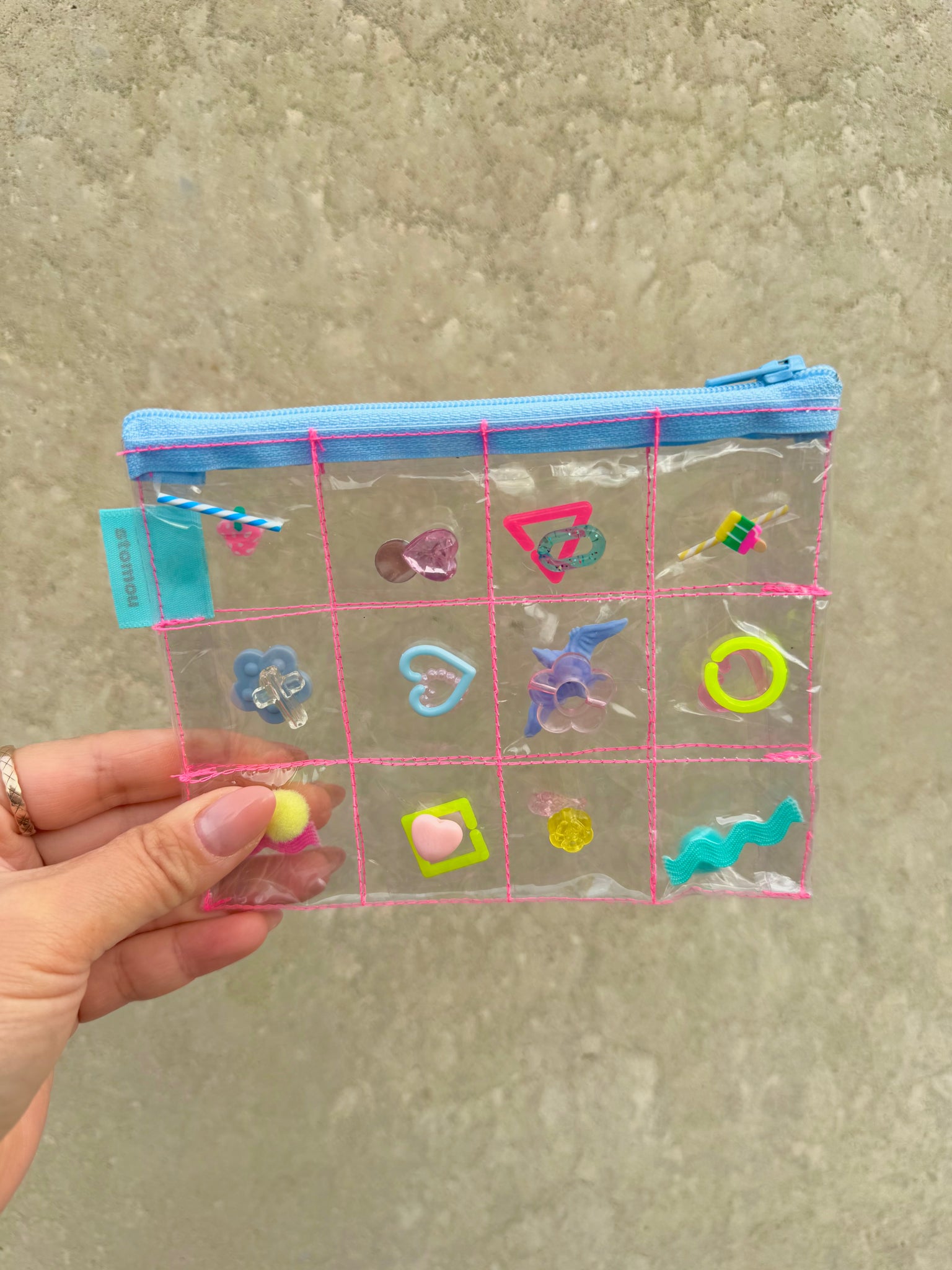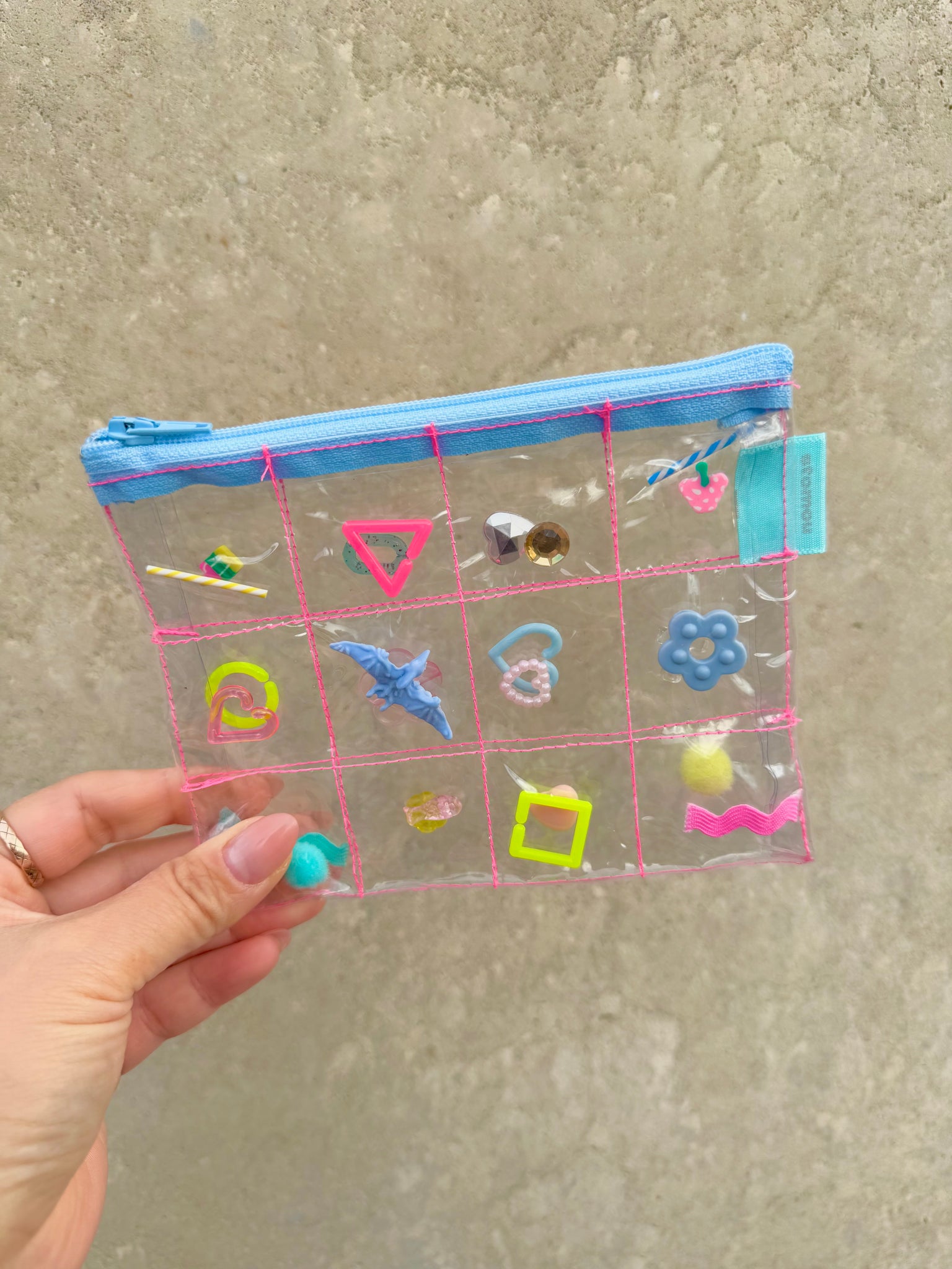 格子に縫ったPVCにパーツを閉じ込めたポーチ