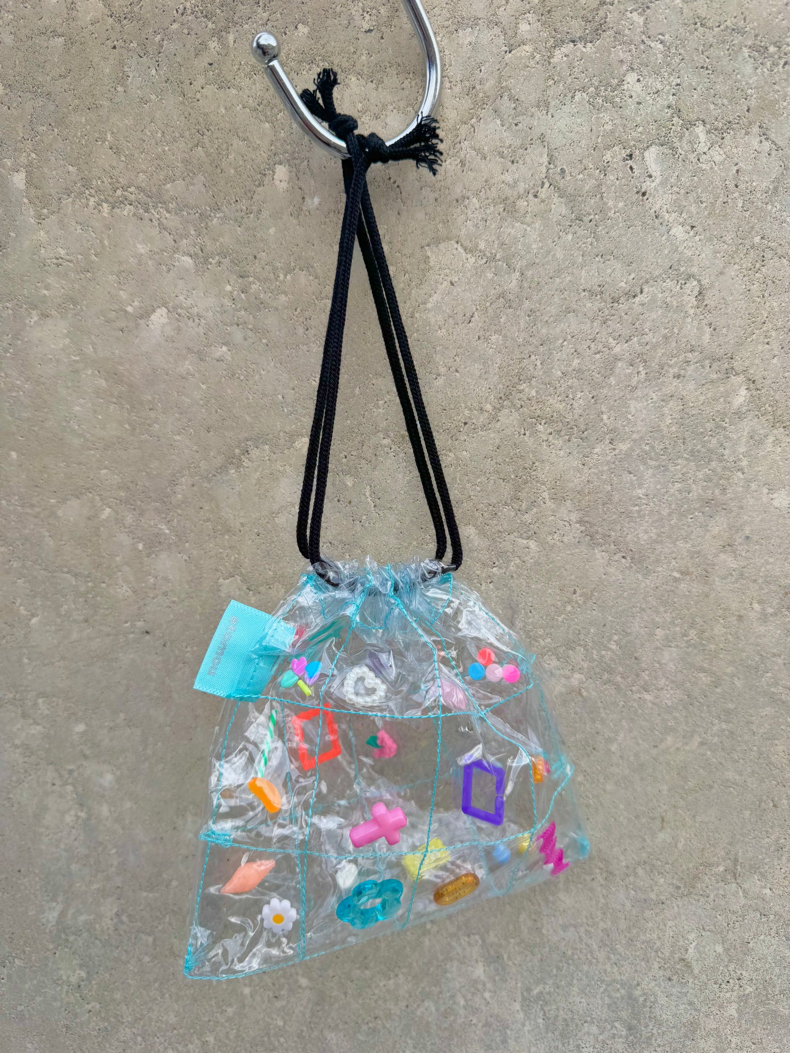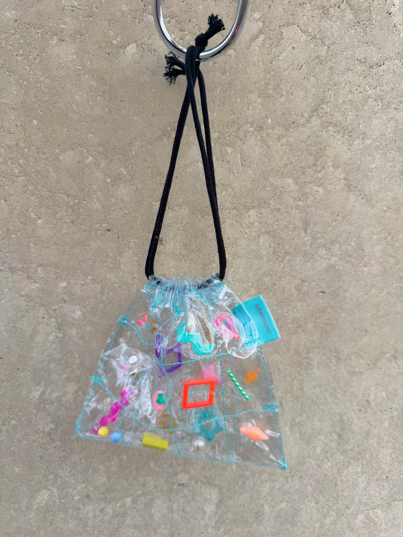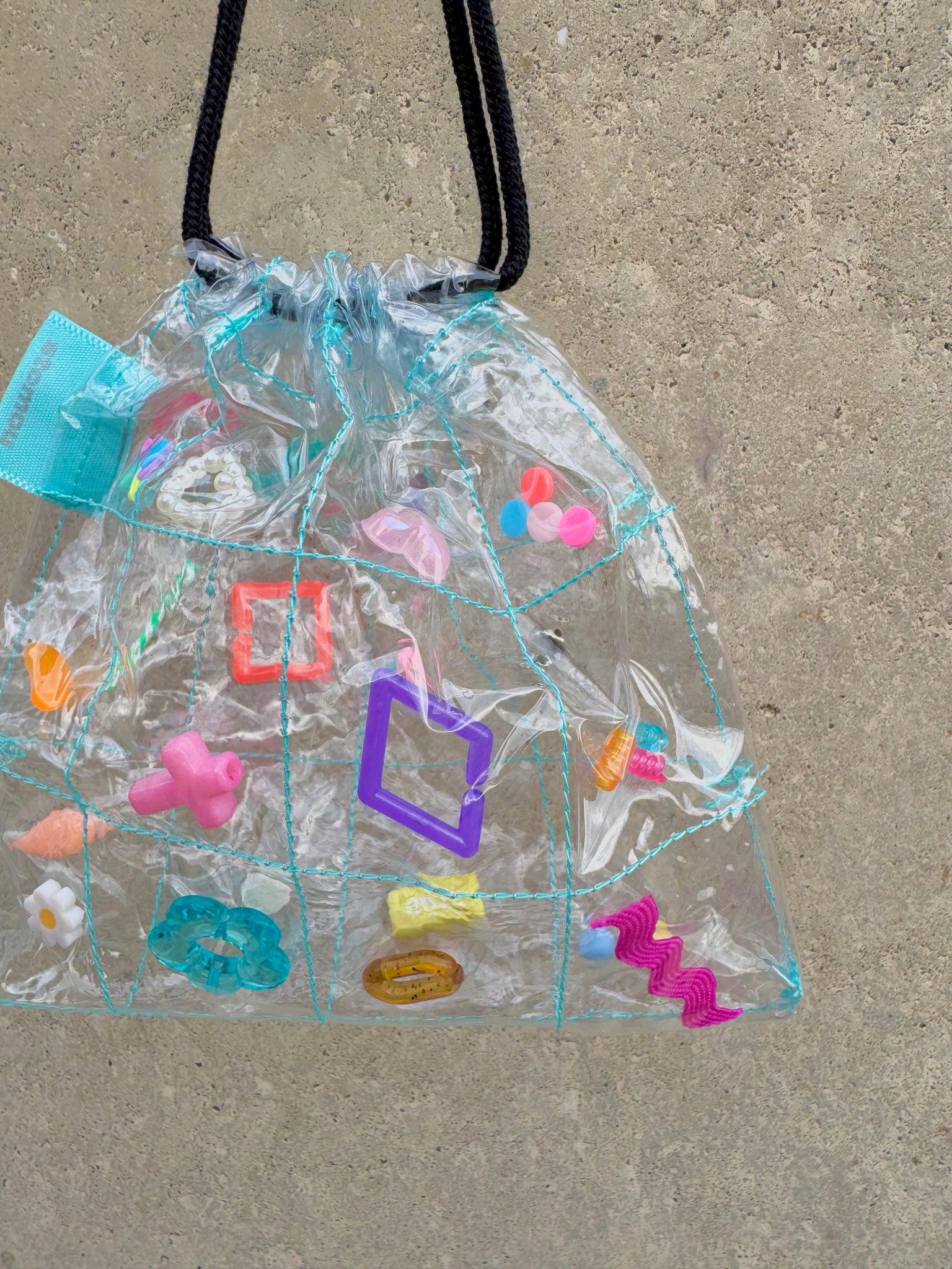 透明の格子状に縫った生地に、パーツを閉じ込めた巾着になります。