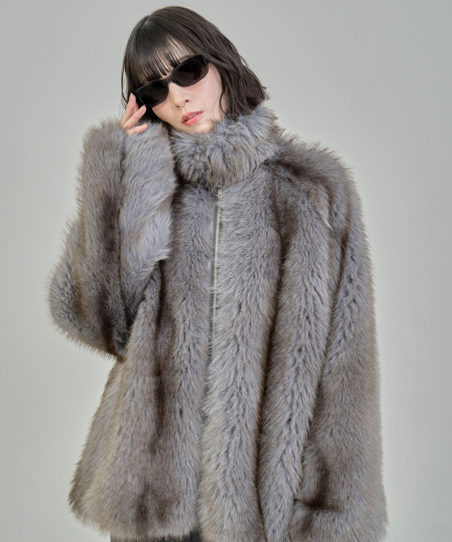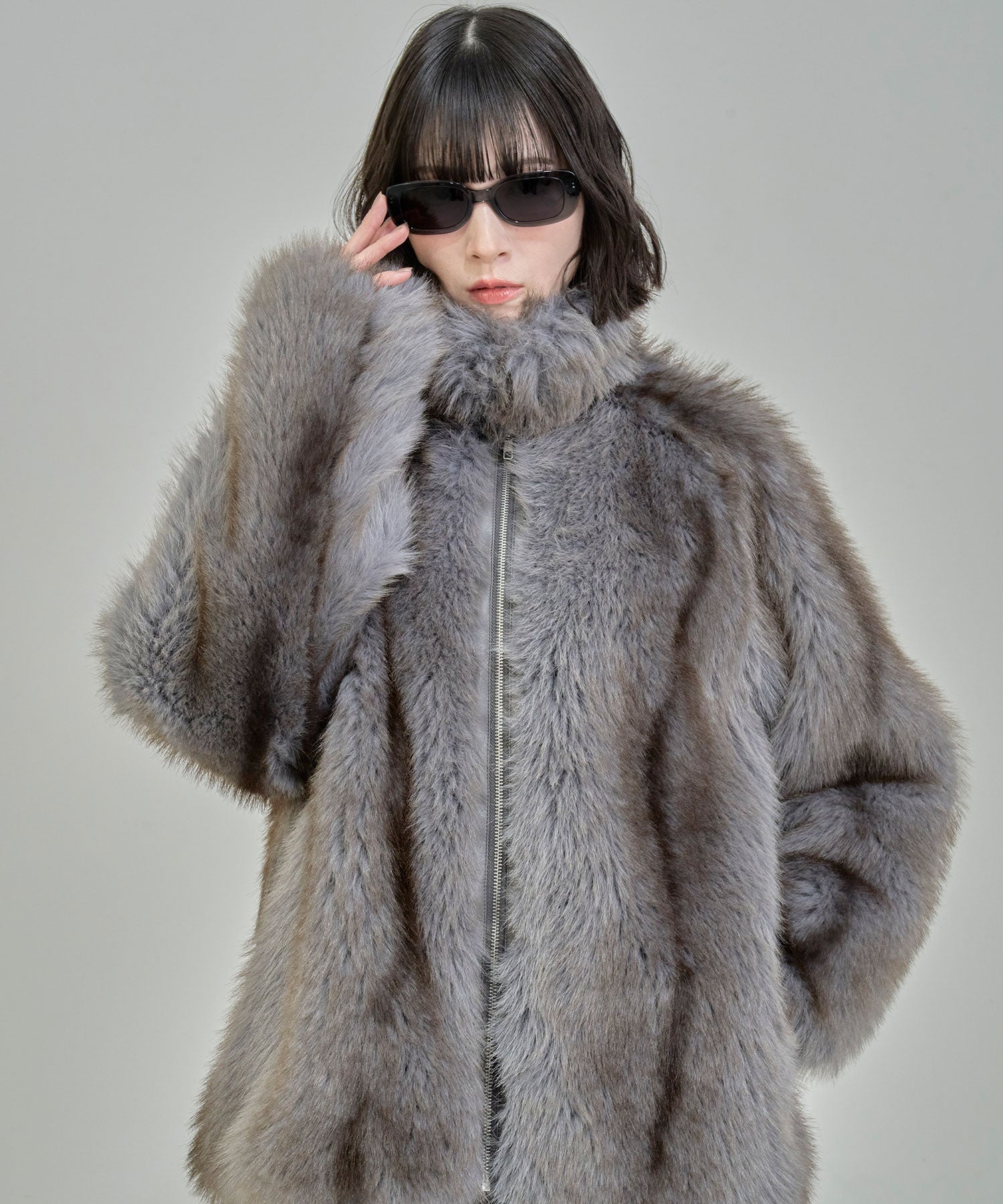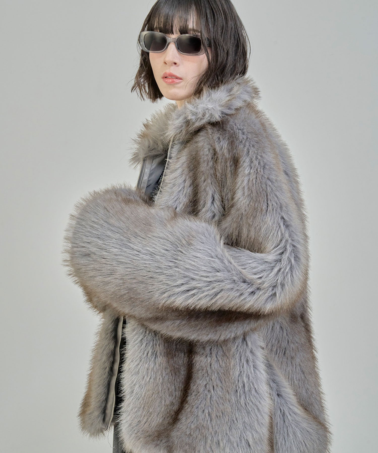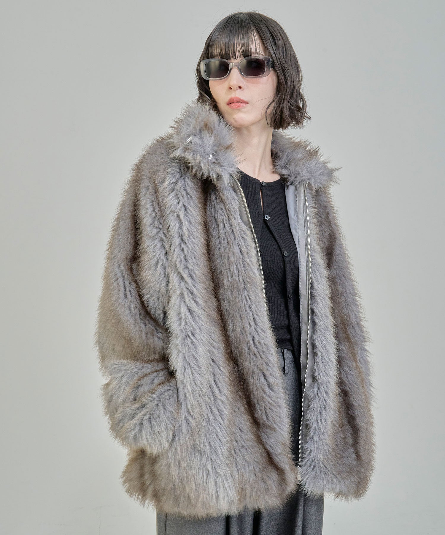 【全色共通コメント】 ふんわりと空気を含んだようなボリューム感が魅力の、 「elle」シリーズのファーブルゾン。 毛足の長い贅沢なフェイクファーを使用し、 まるで本物のような陰影と立体感を演出。 首元までしっかり包み込むハイネック仕様で、 防寒性だけでなく、スタイリングの主役になる存在感を発揮します。 シルエットは程よくオーバーサイズ。 羽織るだけでコーディネートにリュクスなムードが加わり、 スラックスやワンピースなど、幅広いスタイルと相性抜群。 軽さと柔らかさのバランスが良く、 真冬のアウターとしても十分に活躍する一着です。 【カラー別コメント】 ・Grey 透明感のあるスモーキーなグレーが、 大人っぽく洗練された雰囲気を漂わせるカラー。 淡い毛並みのグラデーションが美しく、 クールでミニマルなスタイルが好きな方におすすめです。 ・Brown 深みのあるブラウンが、リッチで品のある印象に。 本物のファーのような濃淡がしっかり出ており、 秋冬らしい温かみとクラシカルなムードを楽しめるカラー。 暗くなりがちな冬コーデのアクセントにも最適です。 【素材】 表地:ポリエステル100% 裏地:ポリエステル100% 【寸法】 F:着丈:68cm バスト:120cm 裄丈:77.5cm 裾周り:120cm model:170cm