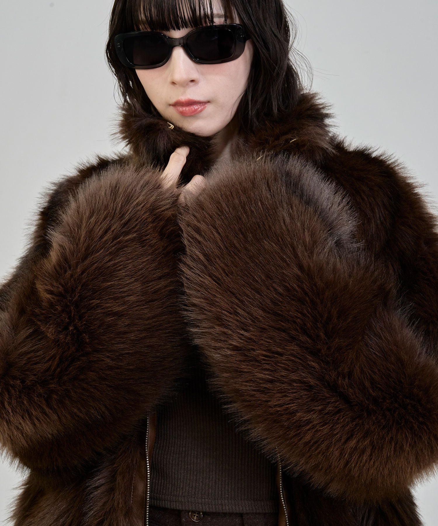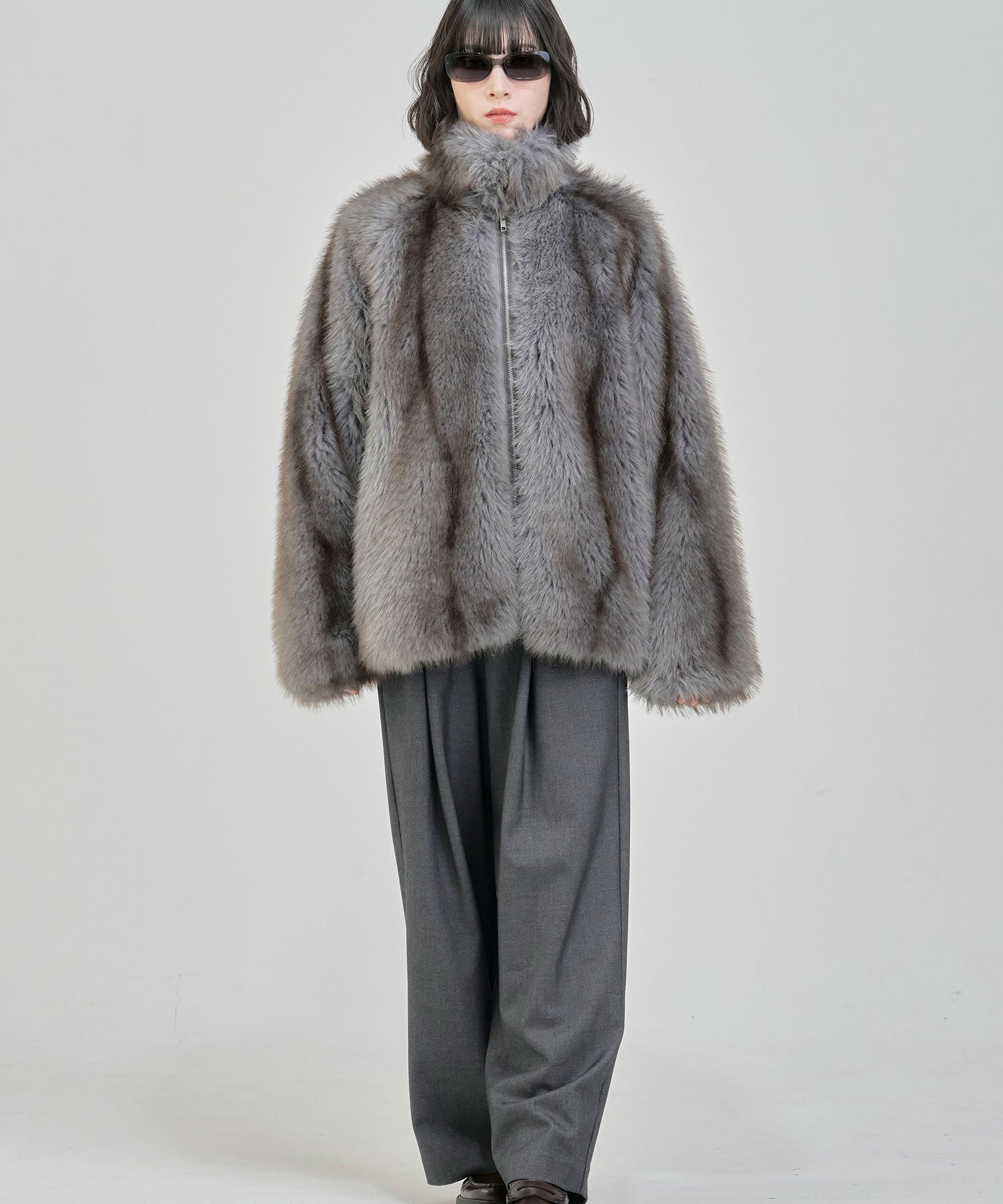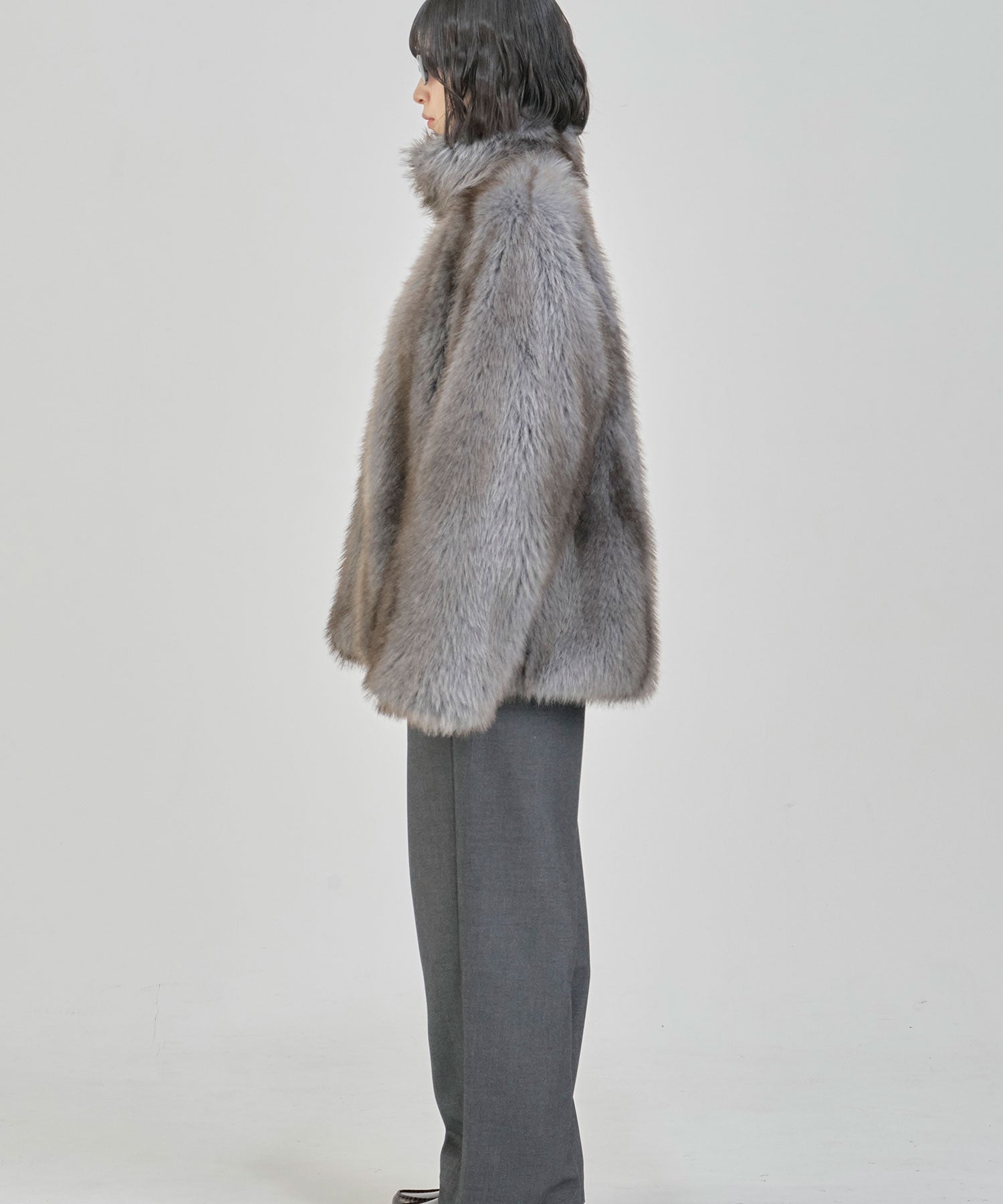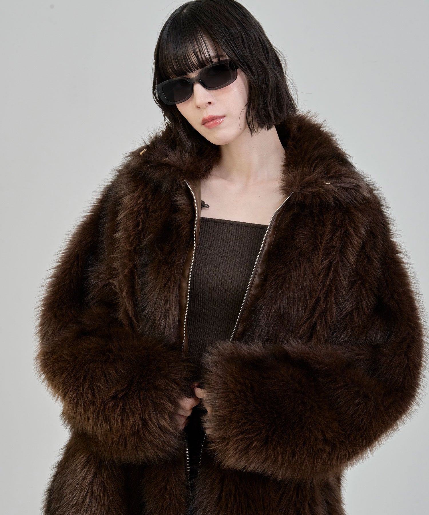 【全色共通コメント】 ふんわりと空気を含んだようなボリューム感が魅力の、 「elle」シリーズのファーブルゾン。 毛足の長い贅沢なフェイクファーを使用し、 まるで本物のような陰影と立体感を演出。 首元までしっかり包み込むハイネック仕様で、 防寒性だけでなく、スタイリングの主役になる存在感を発揮します。 シルエットは程よくオーバーサイズ。 羽織るだけでコーディネートにリュクスなムードが加わり、 スラックスやワンピースなど、幅広いスタイルと相性抜群。 軽さと柔らかさのバランスが良く、 真冬のアウターとしても十分に活躍する一着です。 【カラー別コメント】 ・Grey 透明感のあるスモーキーなグレーが、 大人っぽく洗練された雰囲気を漂わせるカラー。 淡い毛並みのグラデーションが美しく、 クールでミニマルなスタイルが好きな方におすすめです。 ・Brown 深みのあるブラウンが、リッチで品のある印象に。 本物のファーのような濃淡がしっかり出ており、 秋冬らしい温かみとクラシカルなムードを楽しめるカラー。 暗くなりがちな冬コーデのアクセントにも最適です。 【素材】 表地:ポリエステル100% 裏地:ポリエステル100% 【寸法】 F:着丈:68cm バスト:120cm 裄丈:77.5cm 裾周り:120cm model:170cm