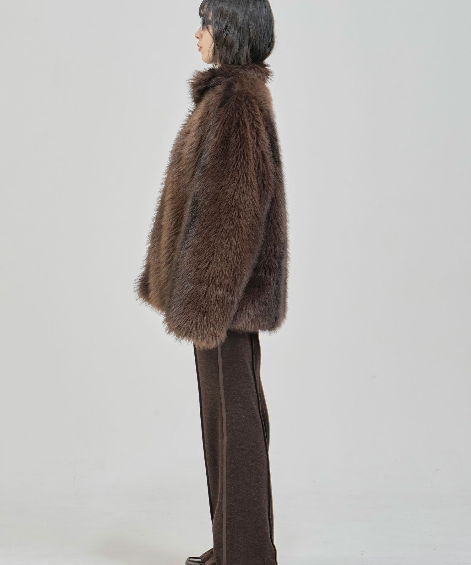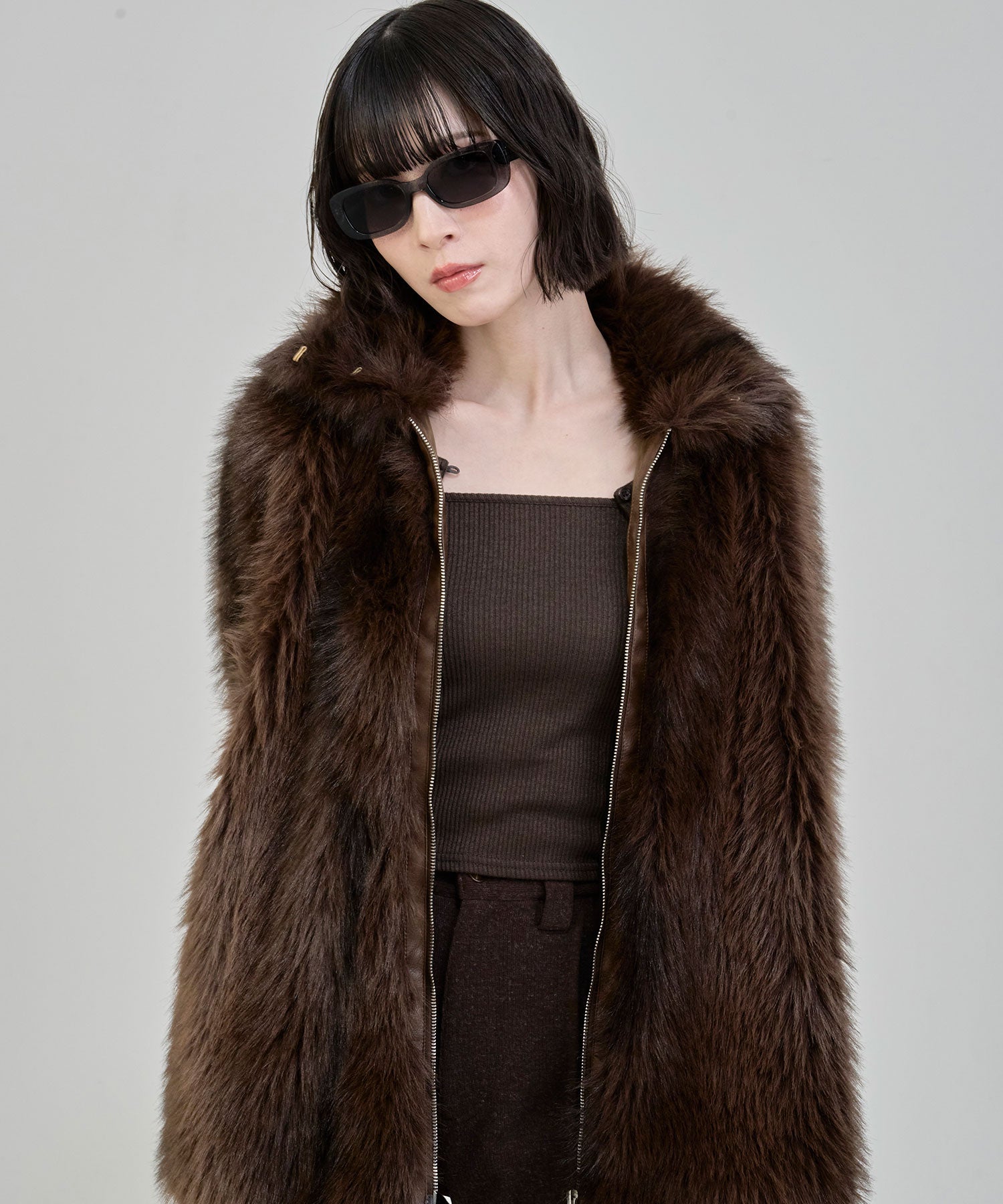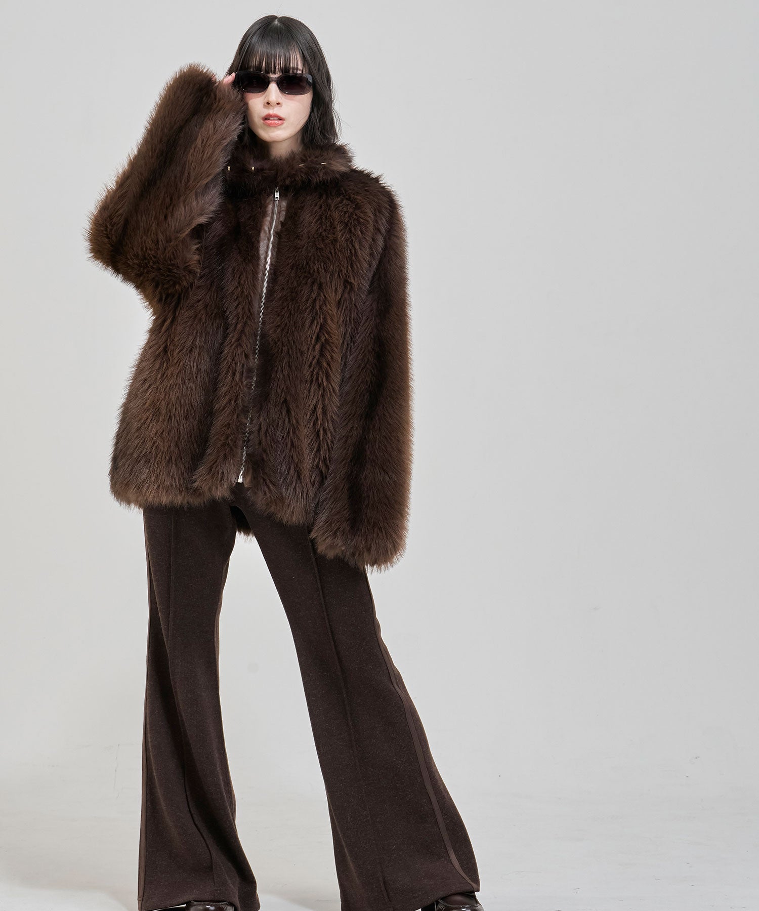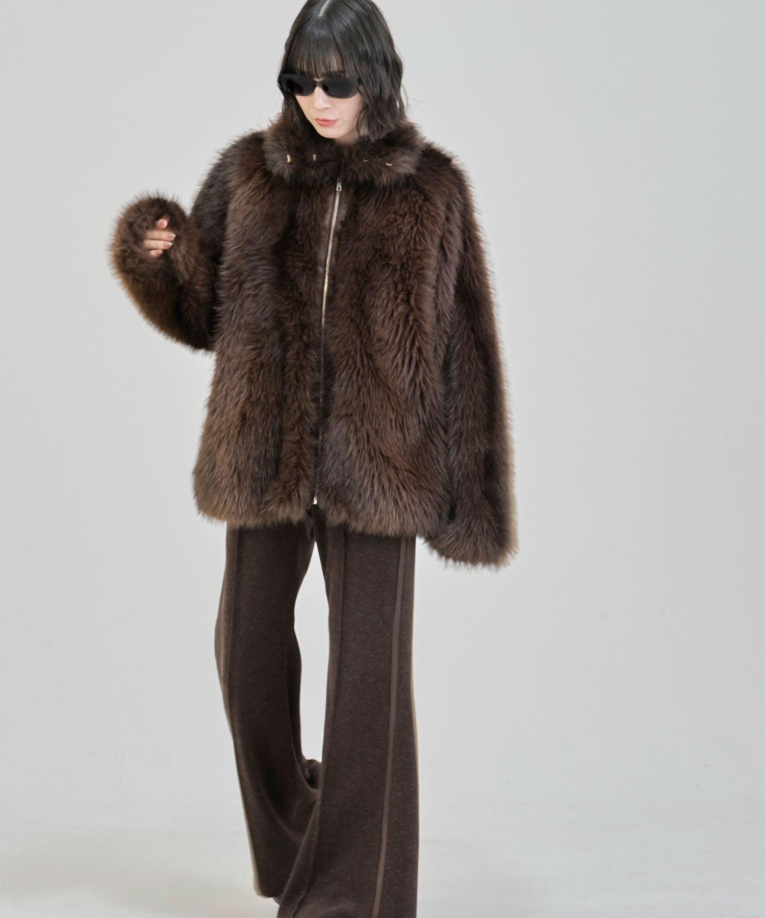 【全色共通コメント】 ふんわりと空気を含んだようなボリューム感が魅力の、 「elle」シリーズのファーブルゾン。 毛足の長い贅沢なフェイクファーを使用し、 まるで本物のような陰影と立体感を演出。 首元までしっかり包み込むハイネック仕様で、 防寒性だけでなく、スタイリングの主役になる存在感を発揮します。 シルエットは程よくオーバーサイズ。 羽織るだけでコーディネートにリュクスなムードが加わり、 スラックスやワンピースなど、幅広いスタイルと相性抜群。 軽さと柔らかさのバランスが良く、 真冬のアウターとしても十分に活躍する一着です。 【カラー別コメント】 ・Grey 透明感のあるスモーキーなグレーが、 大人っぽく洗練された雰囲気を漂わせるカラー。 淡い毛並みのグラデーションが美しく、 クールでミニマルなスタイルが好きな方におすすめです。 ・Brown 深みのあるブラウンが、リッチで品のある印象に。 本物のファーのような濃淡がしっかり出ており、 秋冬らしい温かみとクラシカルなムードを楽しめるカラー。 暗くなりがちな冬コーデのアクセントにも最適です。 【素材】 表地:ポリエステル100% 裏地:ポリエステル100% 【寸法】 F:着丈:68cm バスト:120cm 裄丈:77.5cm 裾周り:120cm model:170cm