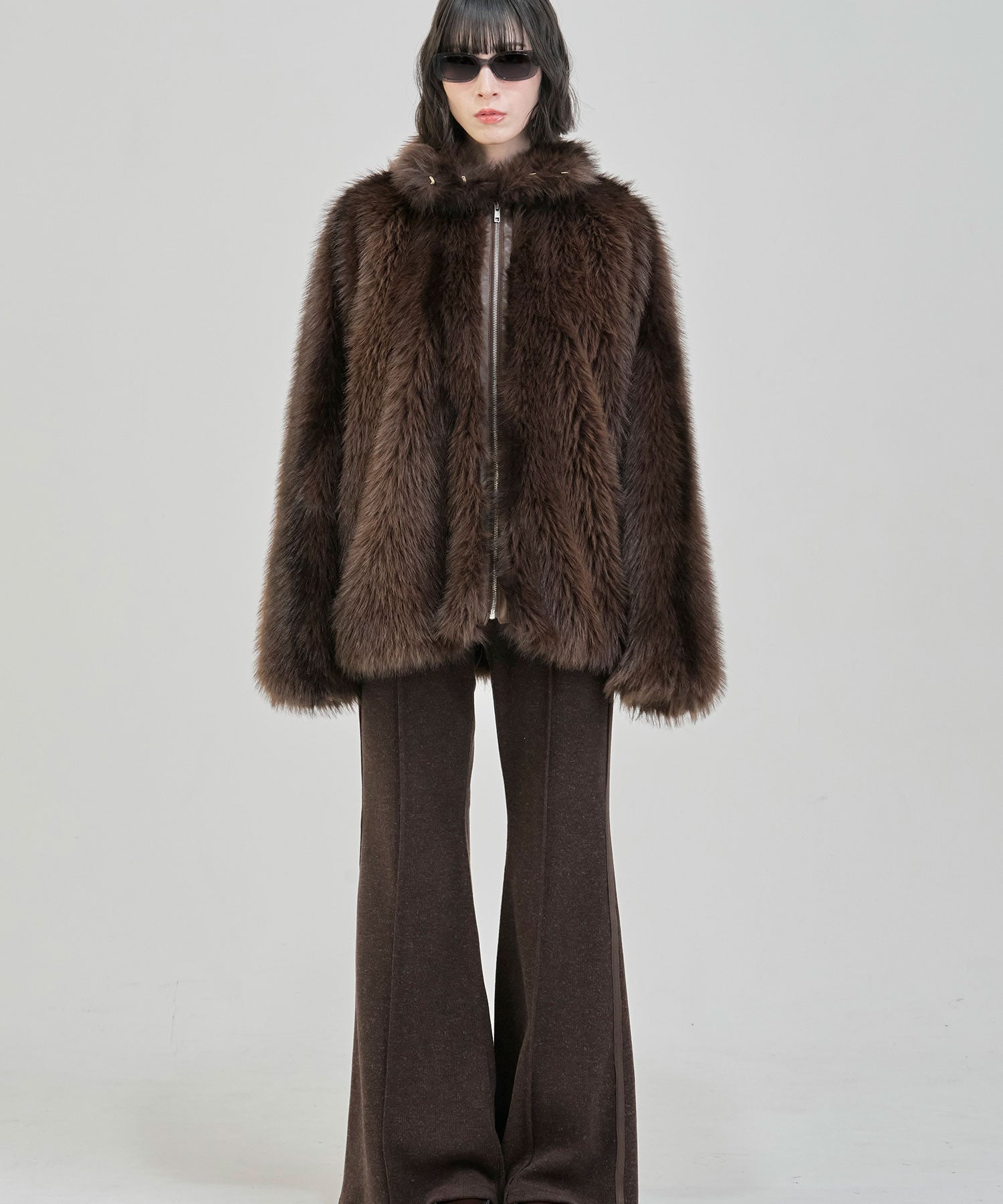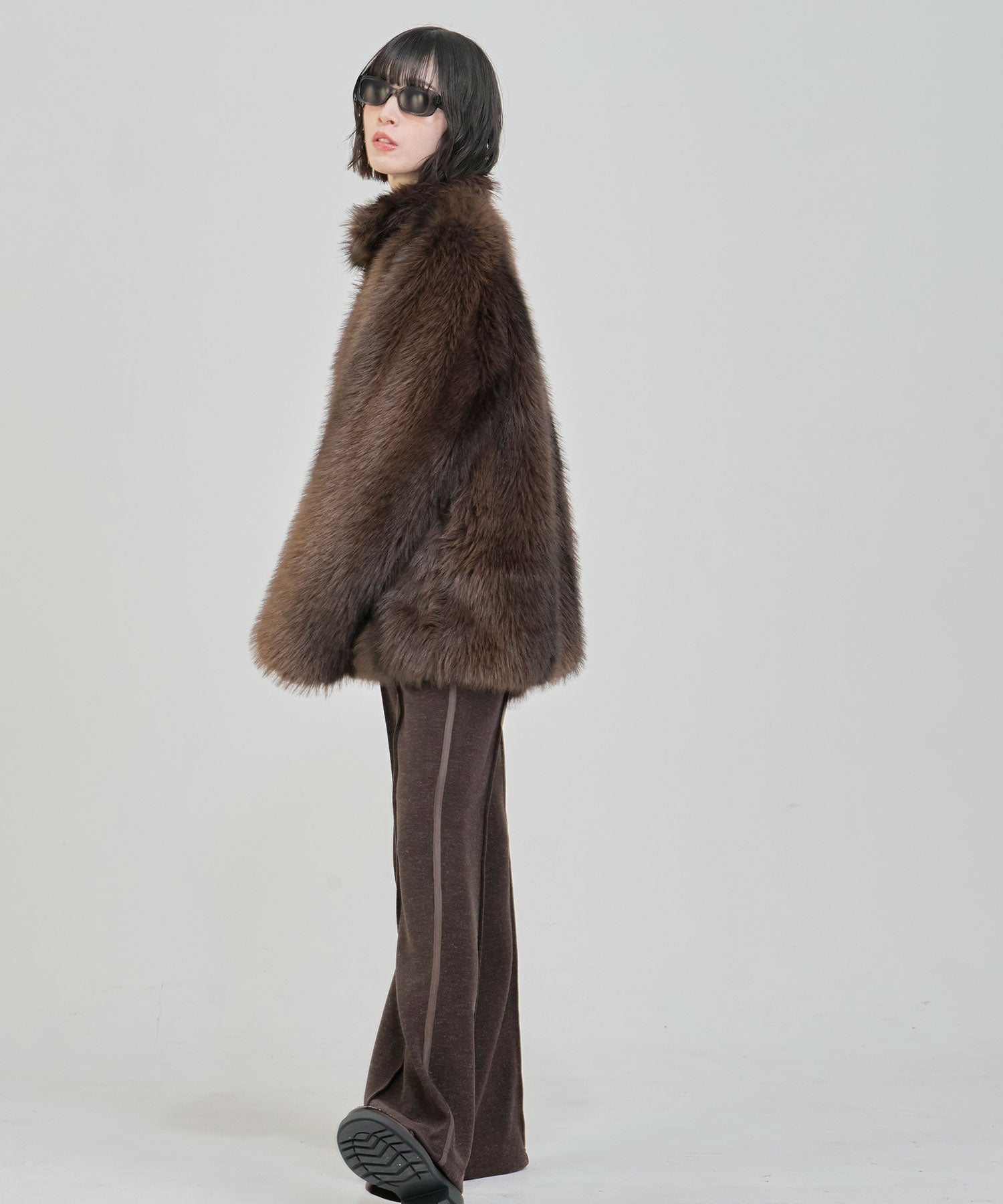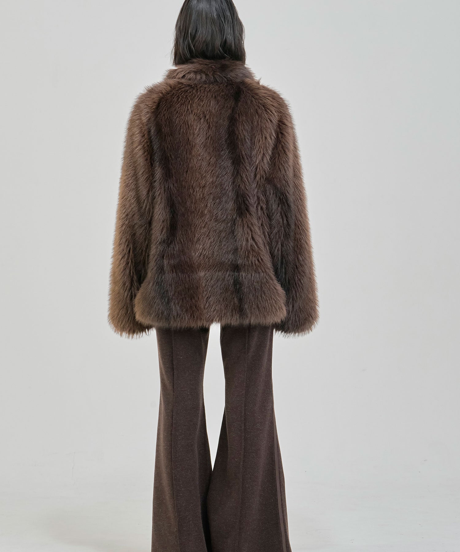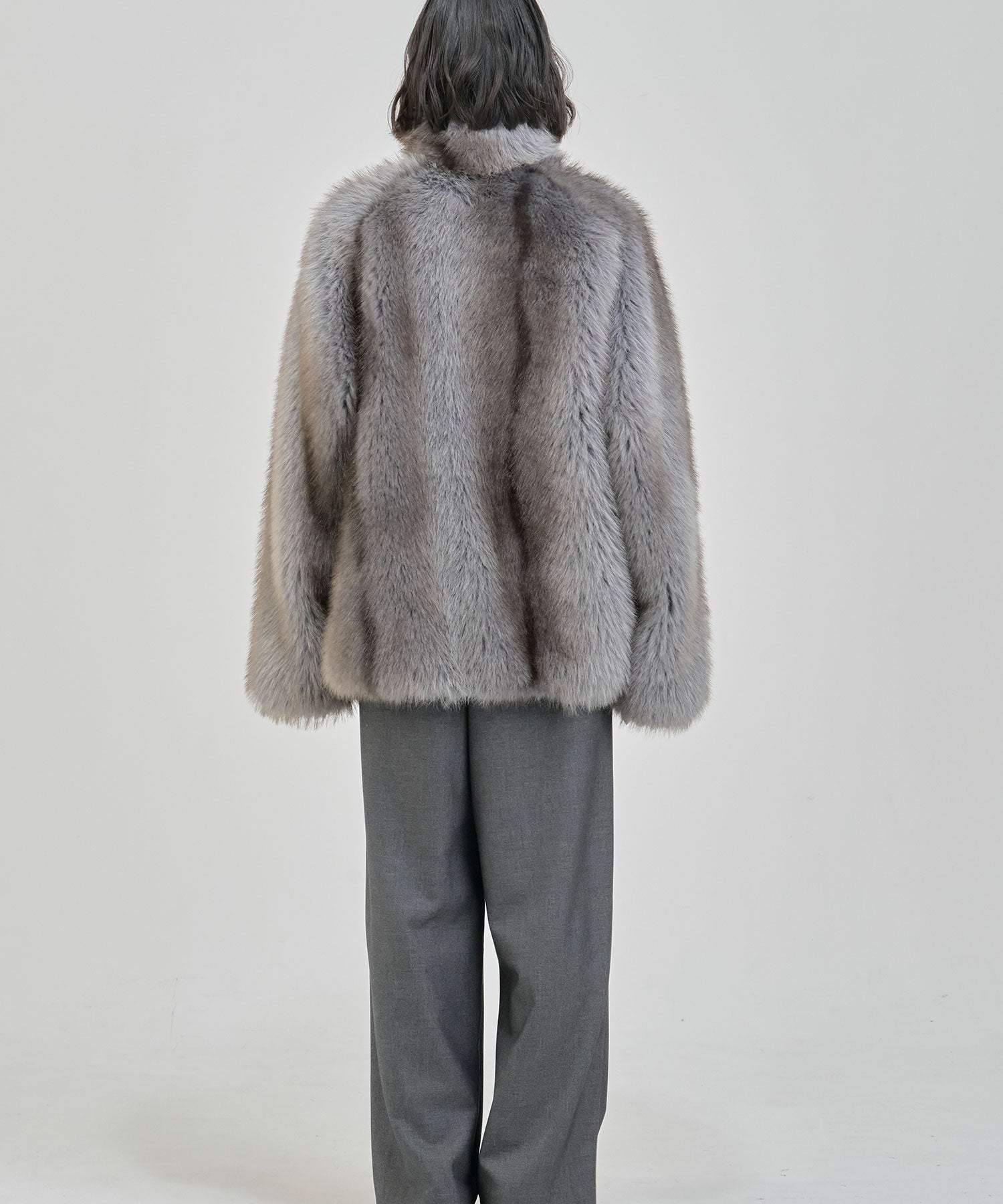 【全色共通コメント】 ふんわりと空気を含んだようなボリューム感が魅力の、 「elle」シリーズのファーブルゾン。 毛足の長い贅沢なフェイクファーを使用し、 まるで本物のような陰影と立体感を演出。 首元までしっかり包み込むハイネック仕様で、 防寒性だけでなく、スタイリングの主役になる存在感を発揮します。 シルエットは程よくオーバーサイズ。 羽織るだけでコーディネートにリュクスなムードが加わり、 スラックスやワンピースなど、幅広いスタイルと相性抜群。 軽さと柔らかさのバランスが良く、 真冬のアウターとしても十分に活躍する一着です。 【カラー別コメント】 ・Grey 透明感のあるスモーキーなグレーが、 大人っぽく洗練された雰囲気を漂わせるカラー。 淡い毛並みのグラデーションが美しく、 クールでミニマルなスタイルが好きな方におすすめです。 ・Brown 深みのあるブラウンが、リッチで品のある印象に。 本物のファーのような濃淡がしっかり出ており、 秋冬らしい温かみとクラシカルなムードを楽しめるカラー。 暗くなりがちな冬コーデのアクセントにも最適です。 【素材】 表地:ポリエステル100% 裏地:ポリエステル100% 【寸法】 F:着丈:68cm バスト:120cm 裄丈:77.5cm 裾周り:120cm model:170cm