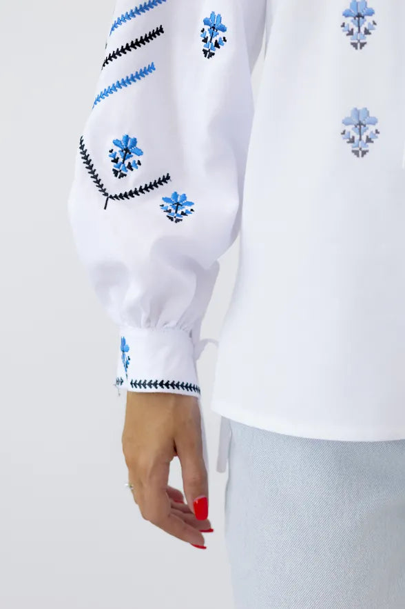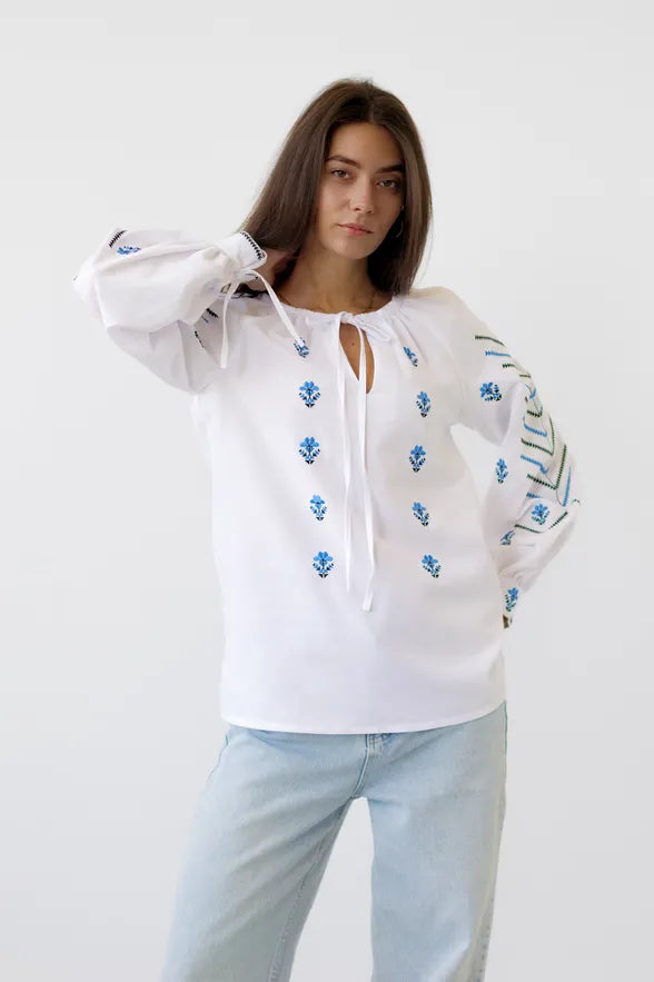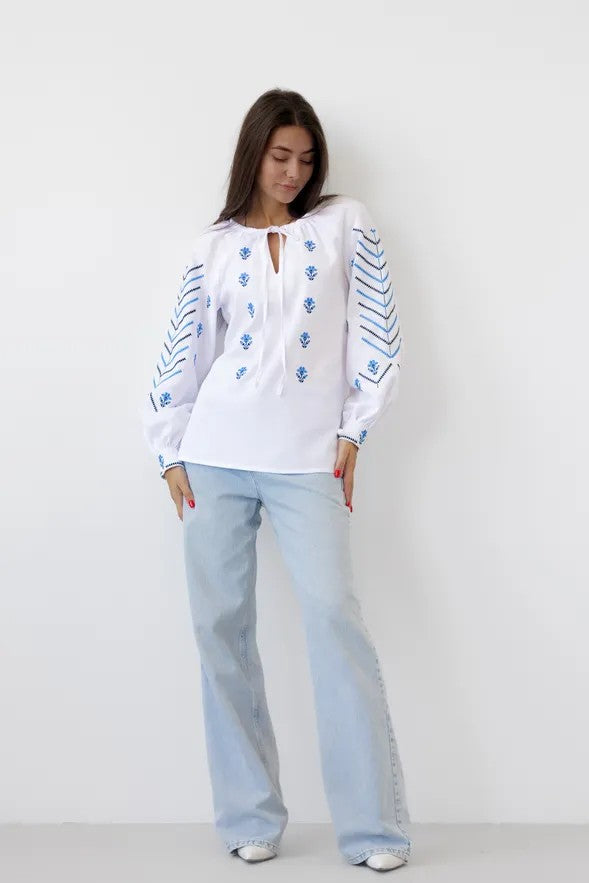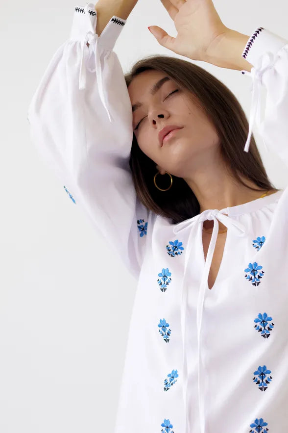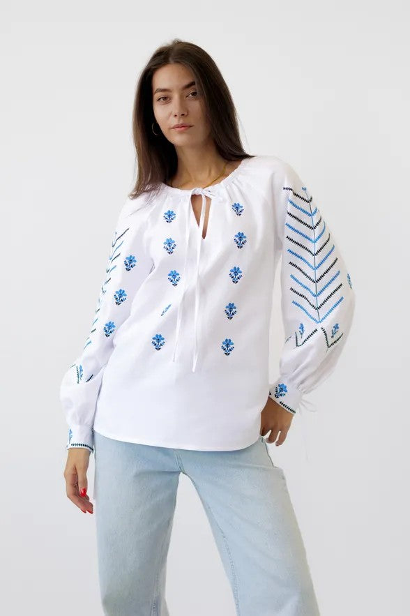 ウクライナの伝統文化を象徴する刺繍ブラウス「ヴィシヴァンカ」です。 白地に映える鮮やかなブルーの幾何学・植物モチーフの刺繍は、一針一針に願いや意味が込められた美しい伝統工芸。現代の日常着としても馴染むよう、上品かつ洗練されたデザインに仕上がっています。