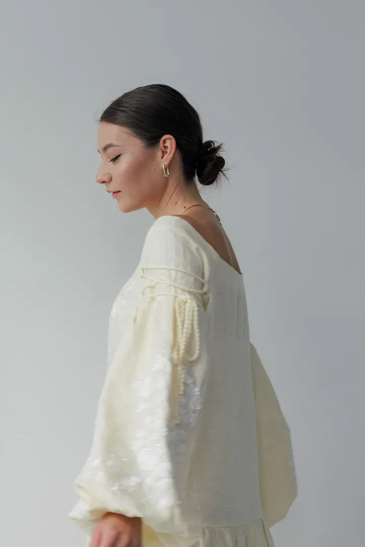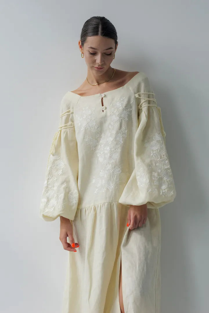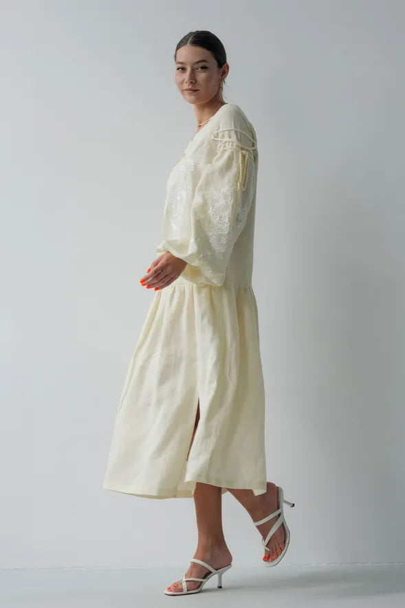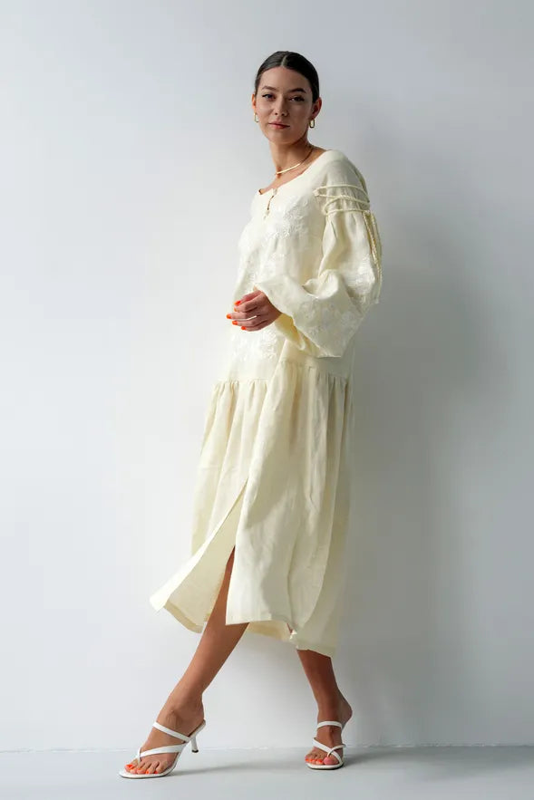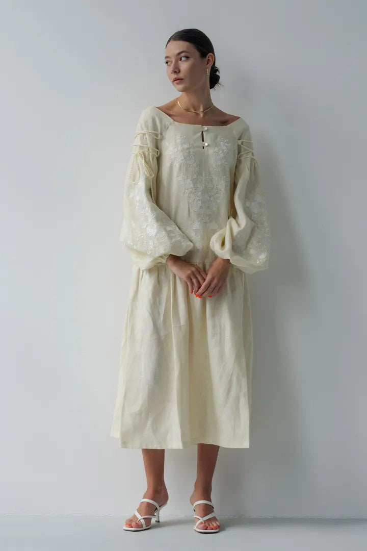 ウクライナの伝統刺繍を、現代のライフスタイルに馴染むデザインへと昇華させた、100%リネン素材のワンピースです。