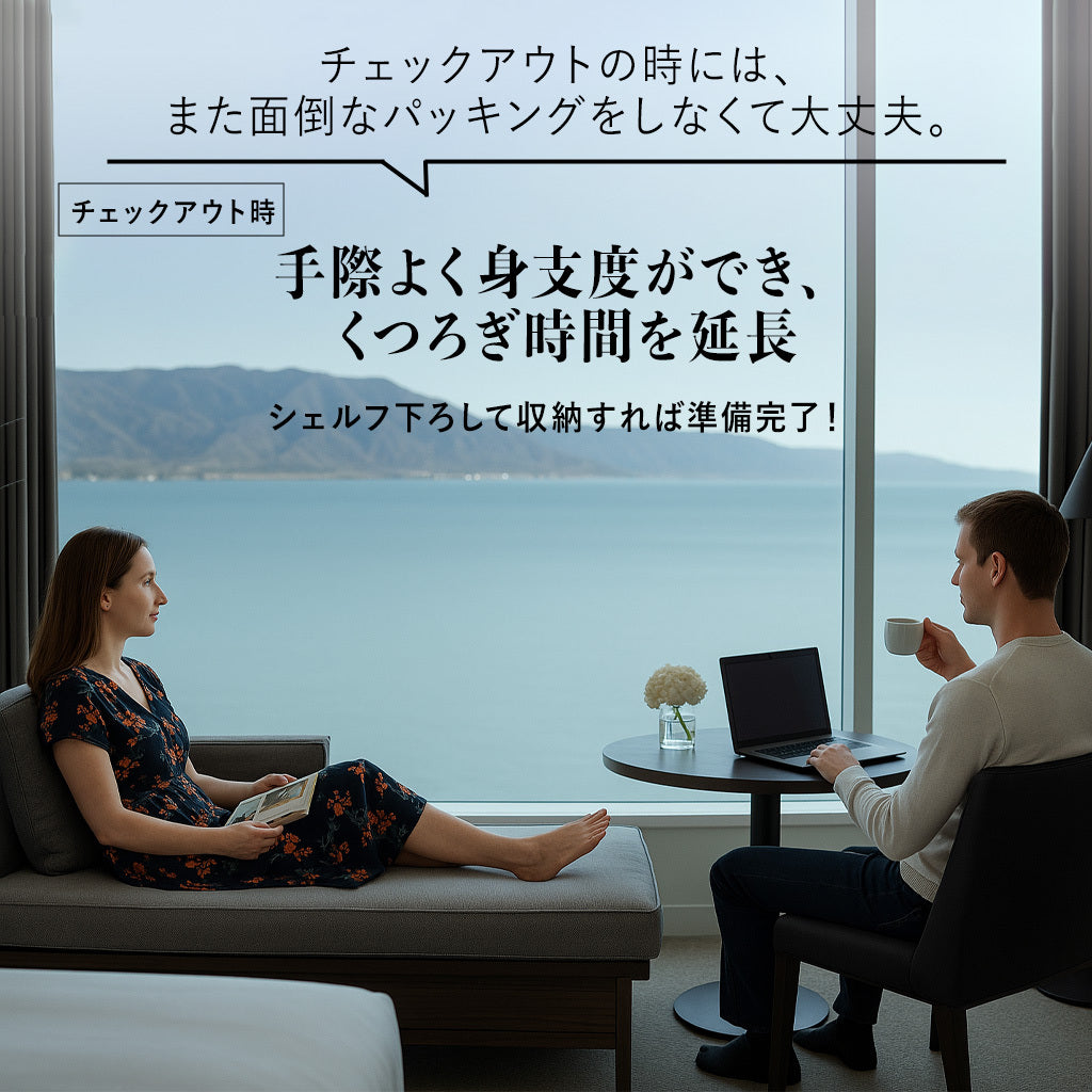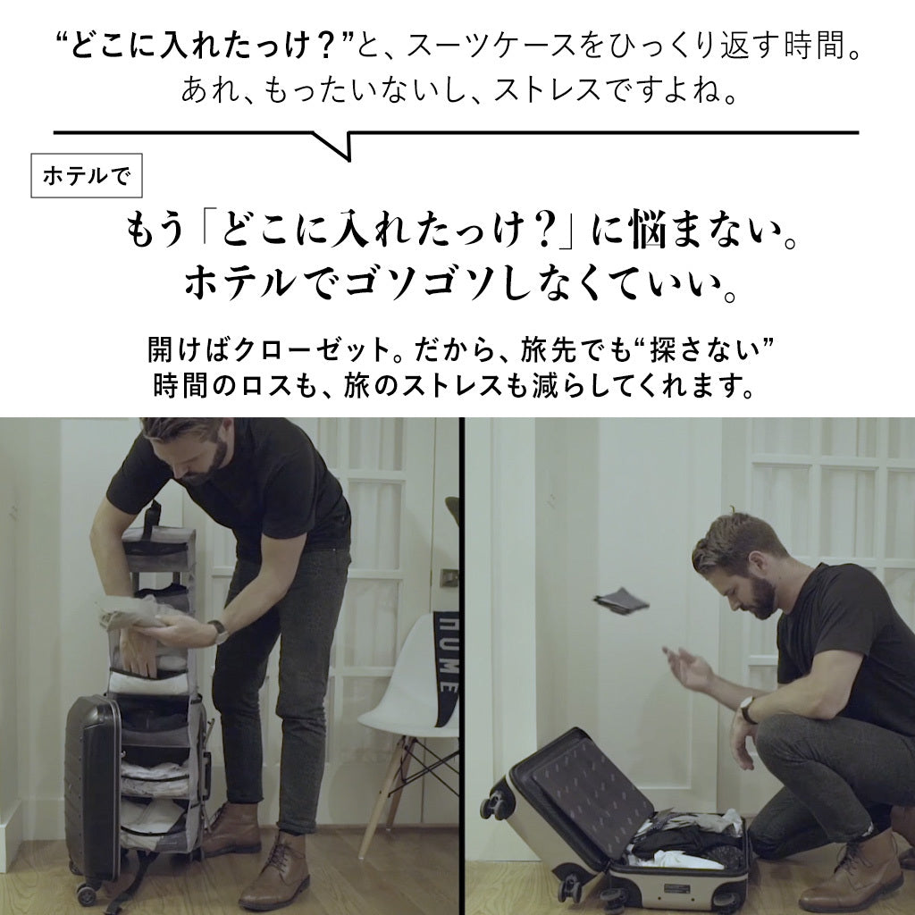 ホテルに着いてガラッとスーツケースを広げたら、中からスルスルっとシェルフが登場。そこはもうクローゼット。