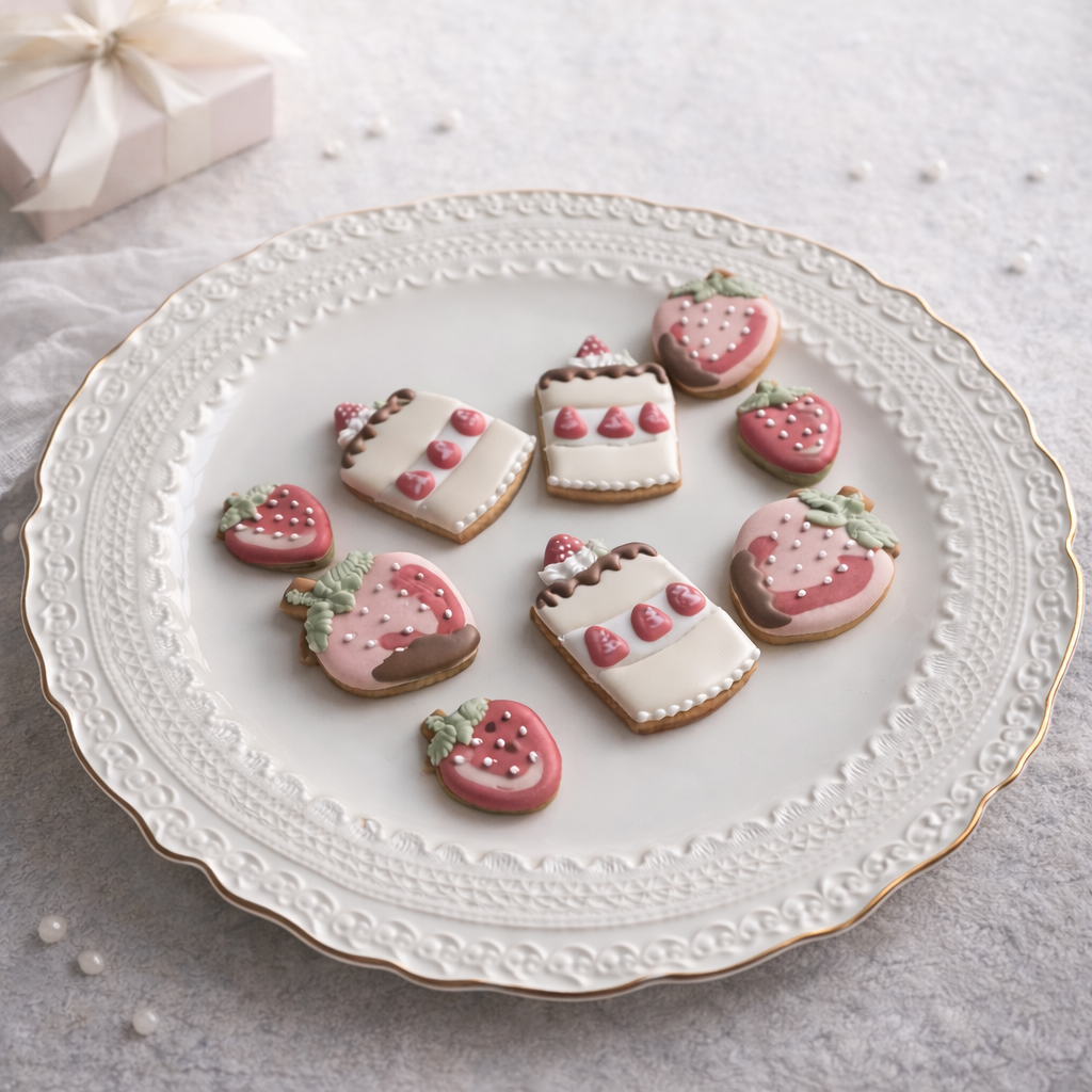 やさしいくすみピンクのいちごと、ころんと可愛いショートケーキをモチーフにした 大人可愛いアイシングクッキーのセットです。