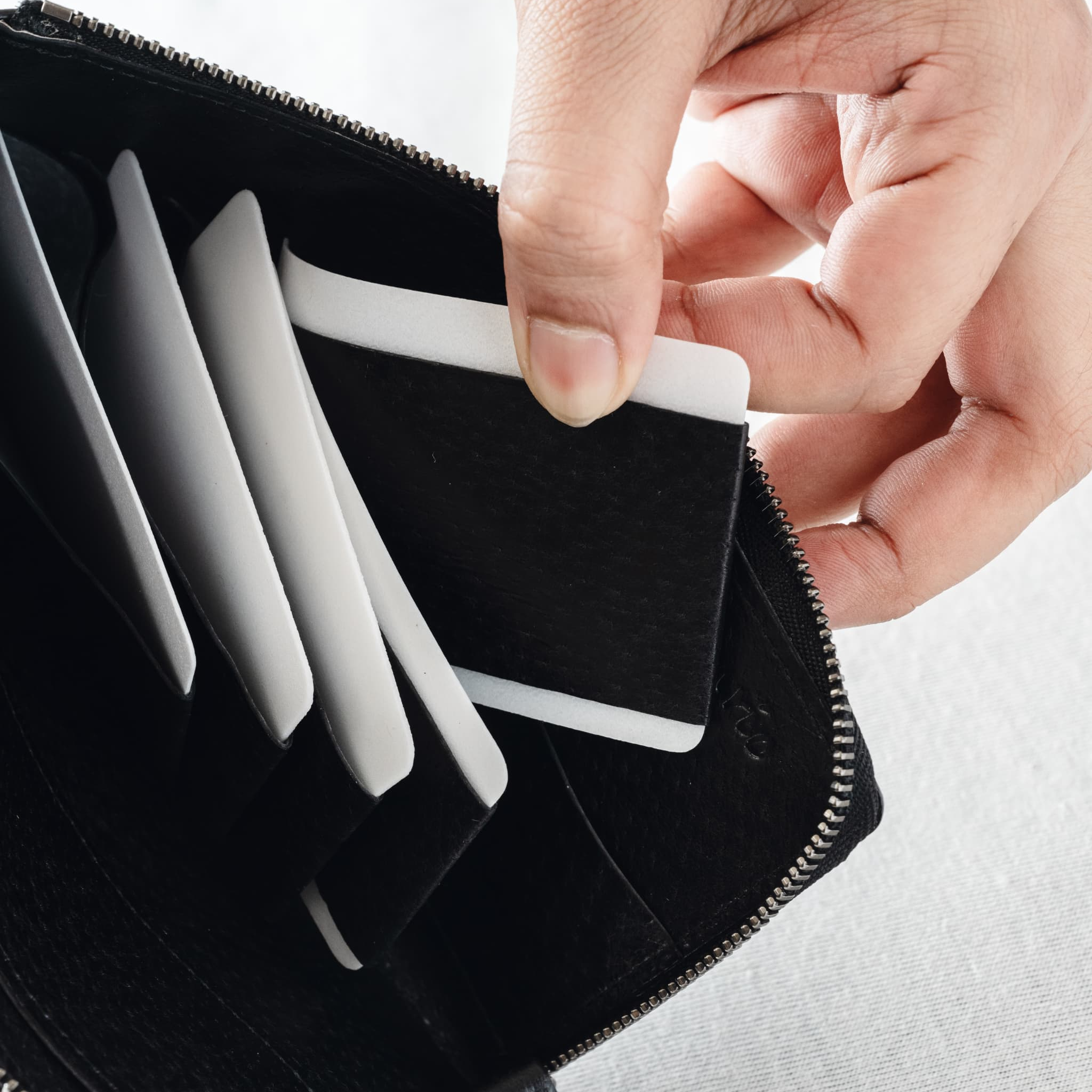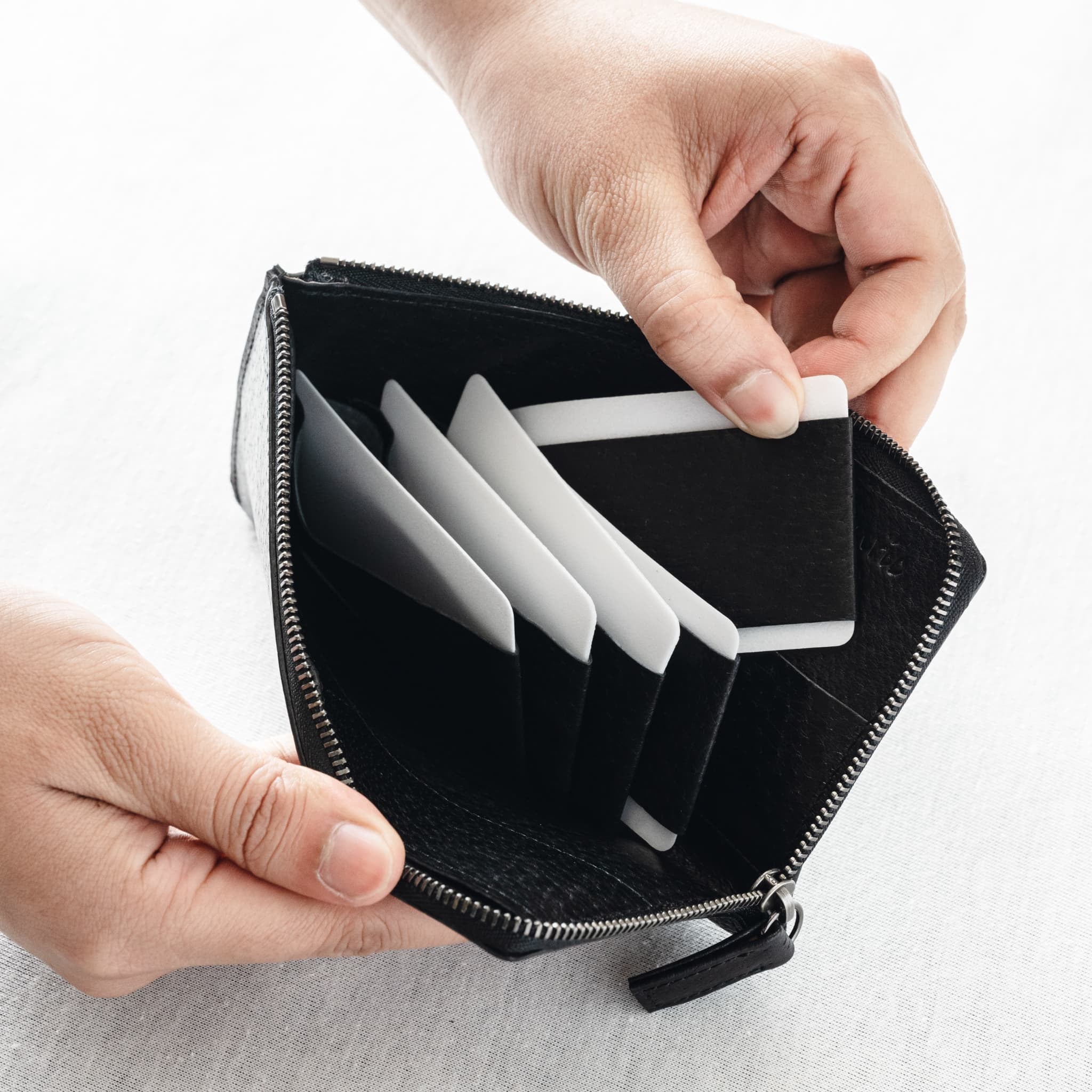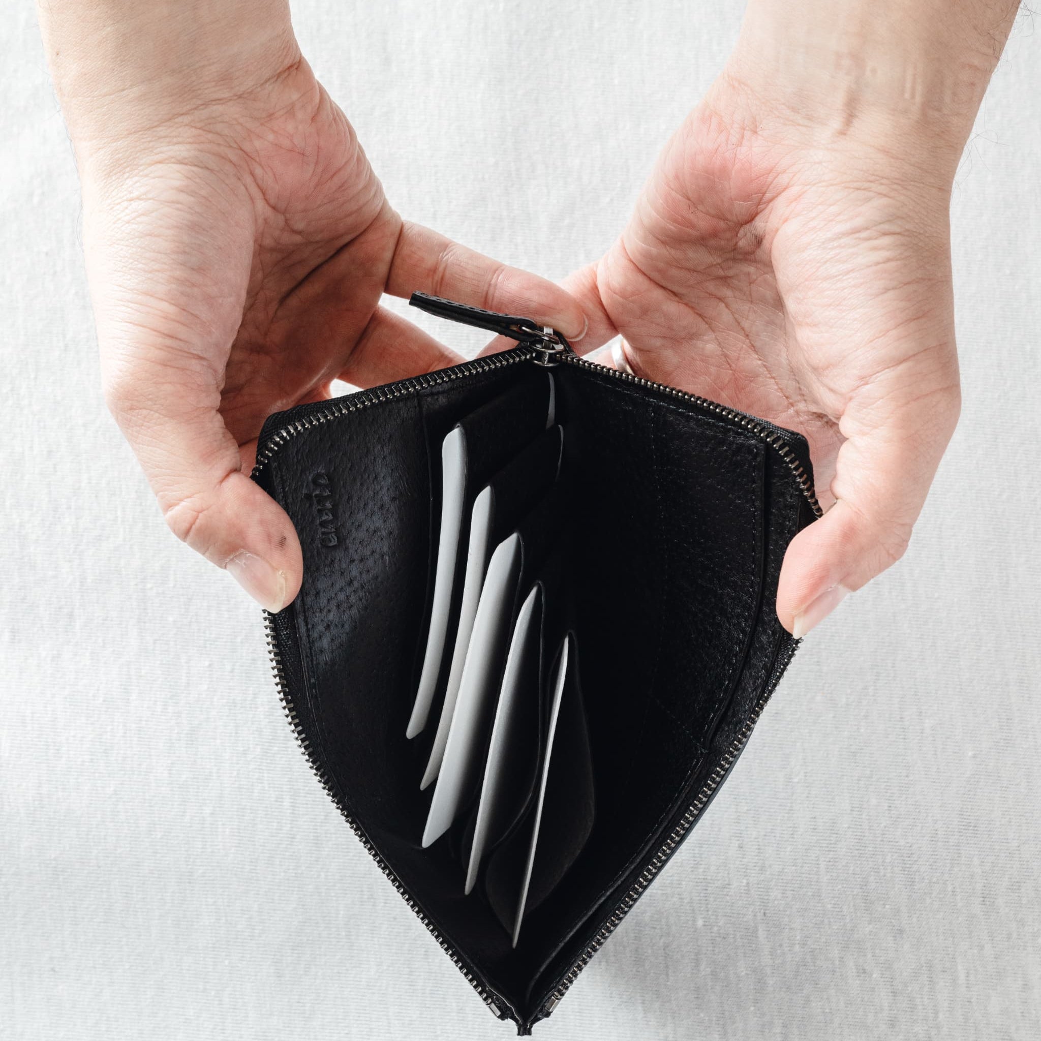薄型ながらも、お札、カード、小銭などを整理して収納できる、機能的なデザインが魅力です。L字ファスナーを開けると大きく開き、中身が見やすく、スムーズに出し入れできます。