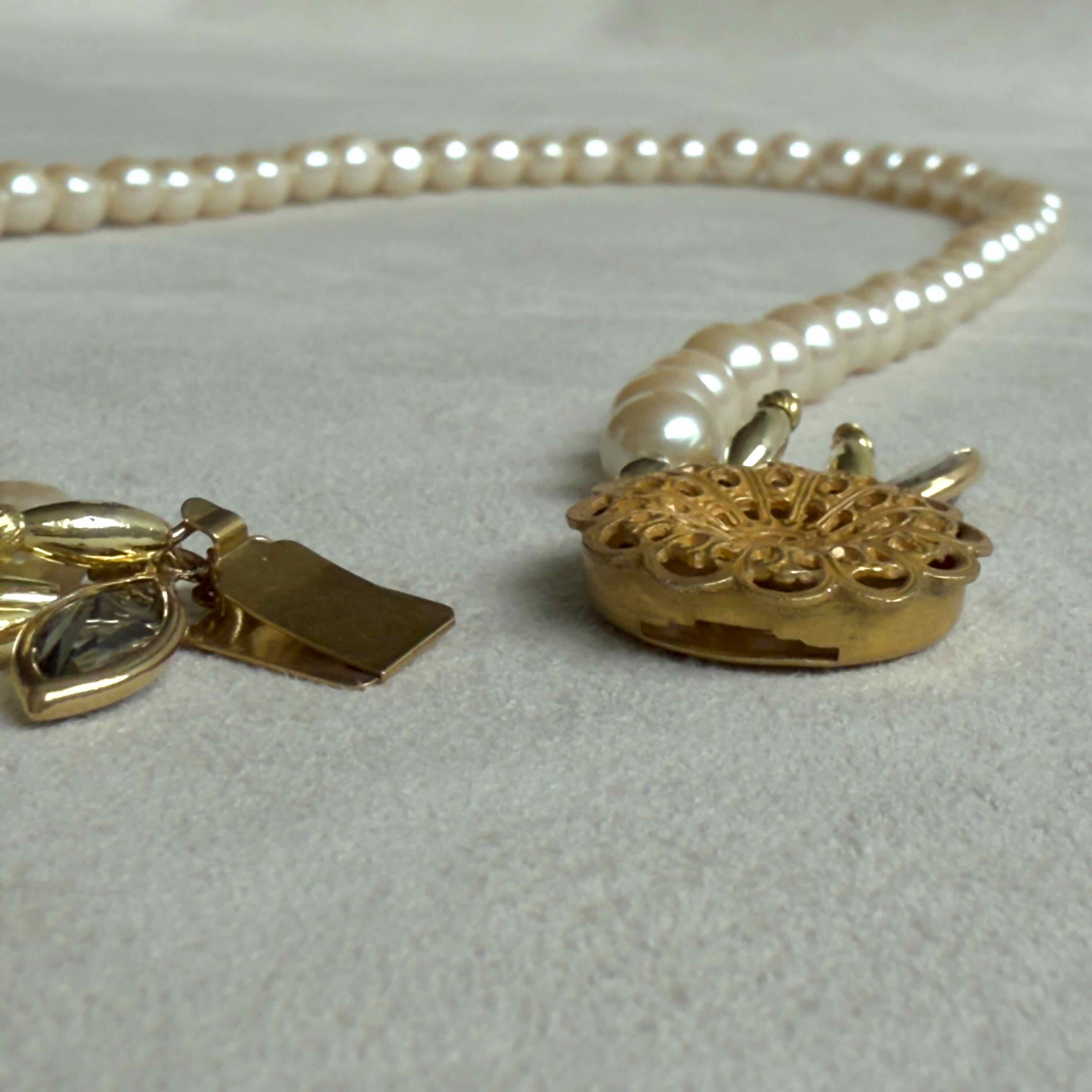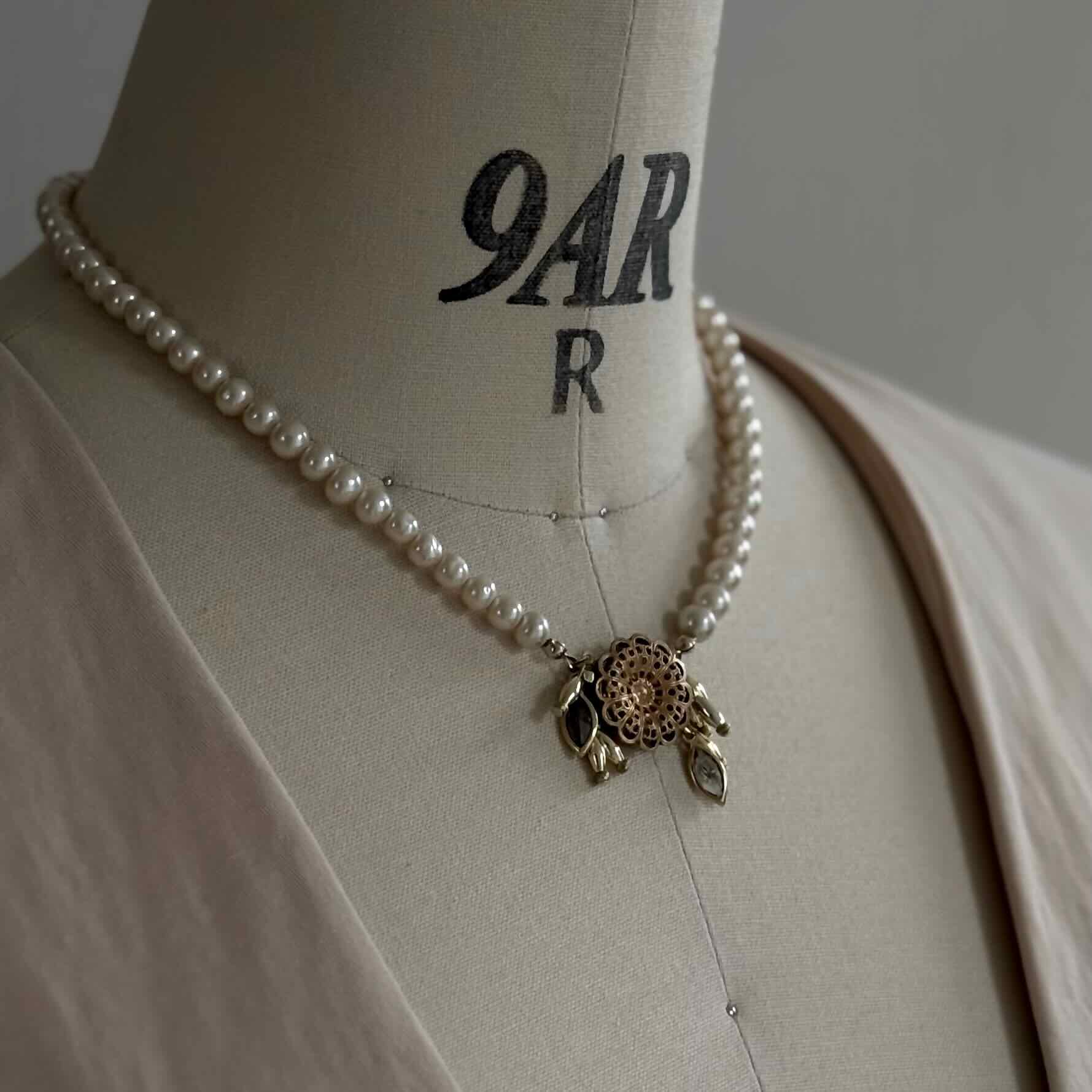 クラスプ:真鍮(アメリカ「ミリアム・ハスケル」Dead Stock) パール:ガラス(日本「Cherry Brand」Vintage) モチーフ:スワロフスキークリスタル(オーストリア「スワロフスキー社」1940s~) ライス型ゴールドビーズ:アクリル(日本 1940s~1970s) リブドビーズ:真鍮