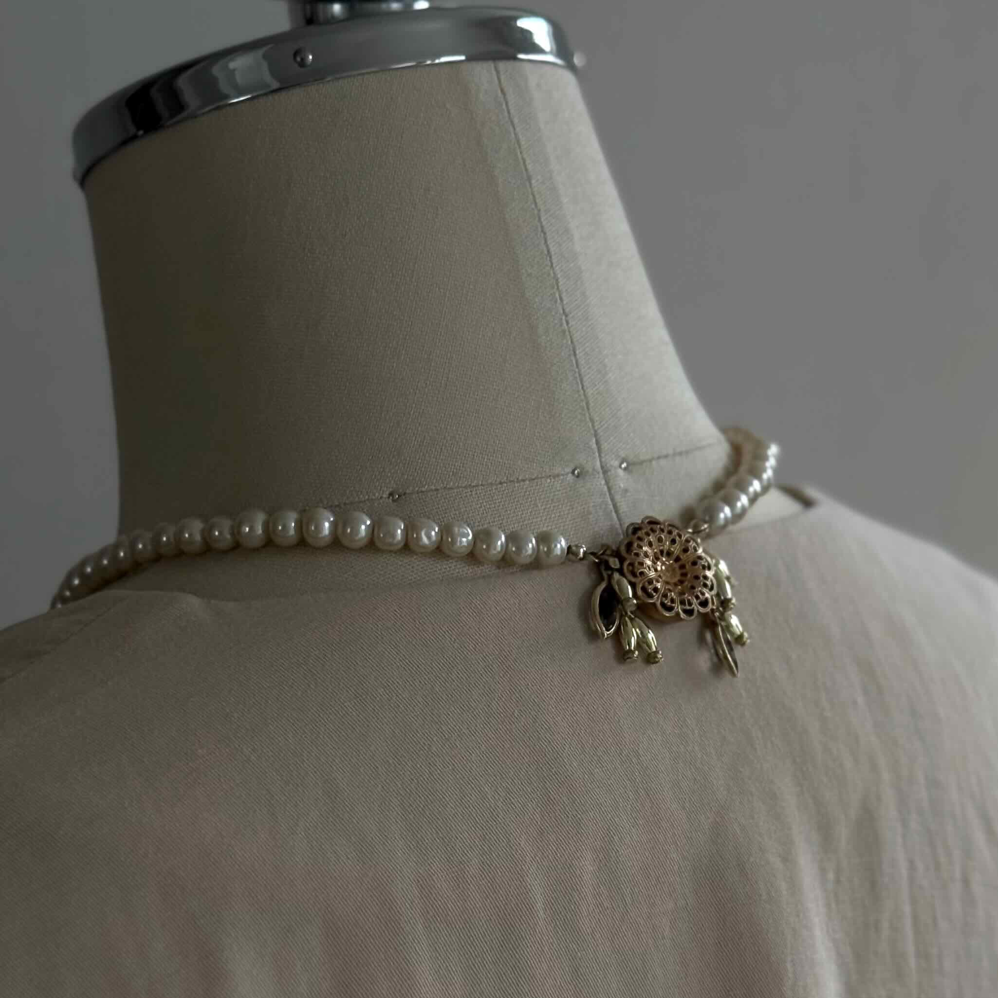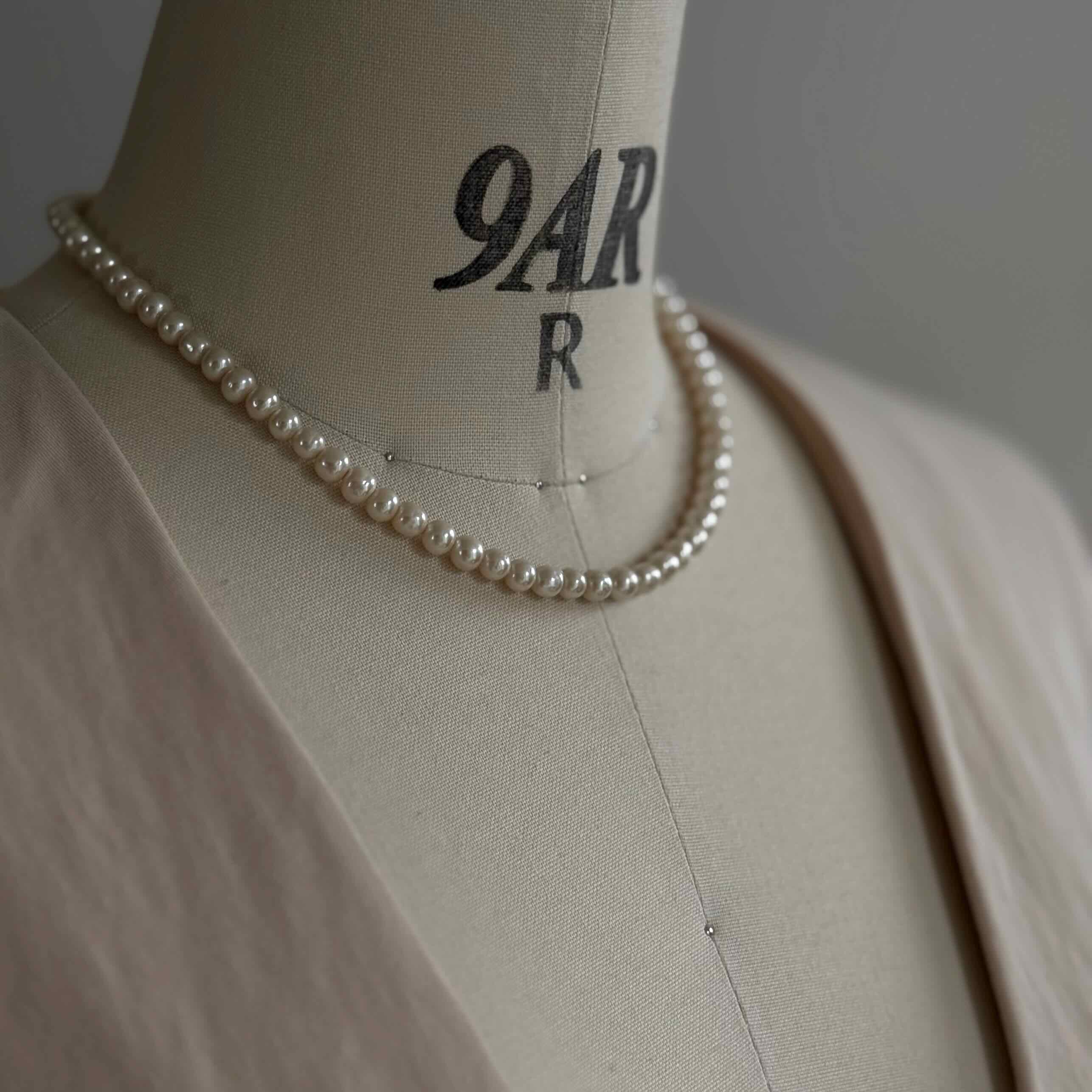 首元に沿うパールは、日本の老舗「Cherry Brand(チェリーブランド)」によるガラスパール。