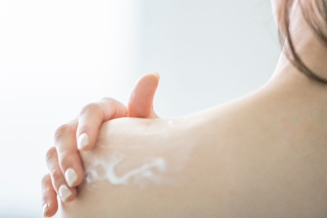 お風呂上がりに水分が残っている状態で適量を手のひらに取り、指先や手の甲、足首からひざ、ひざから太ももなどパーツごとに丁寧に塗布してください。