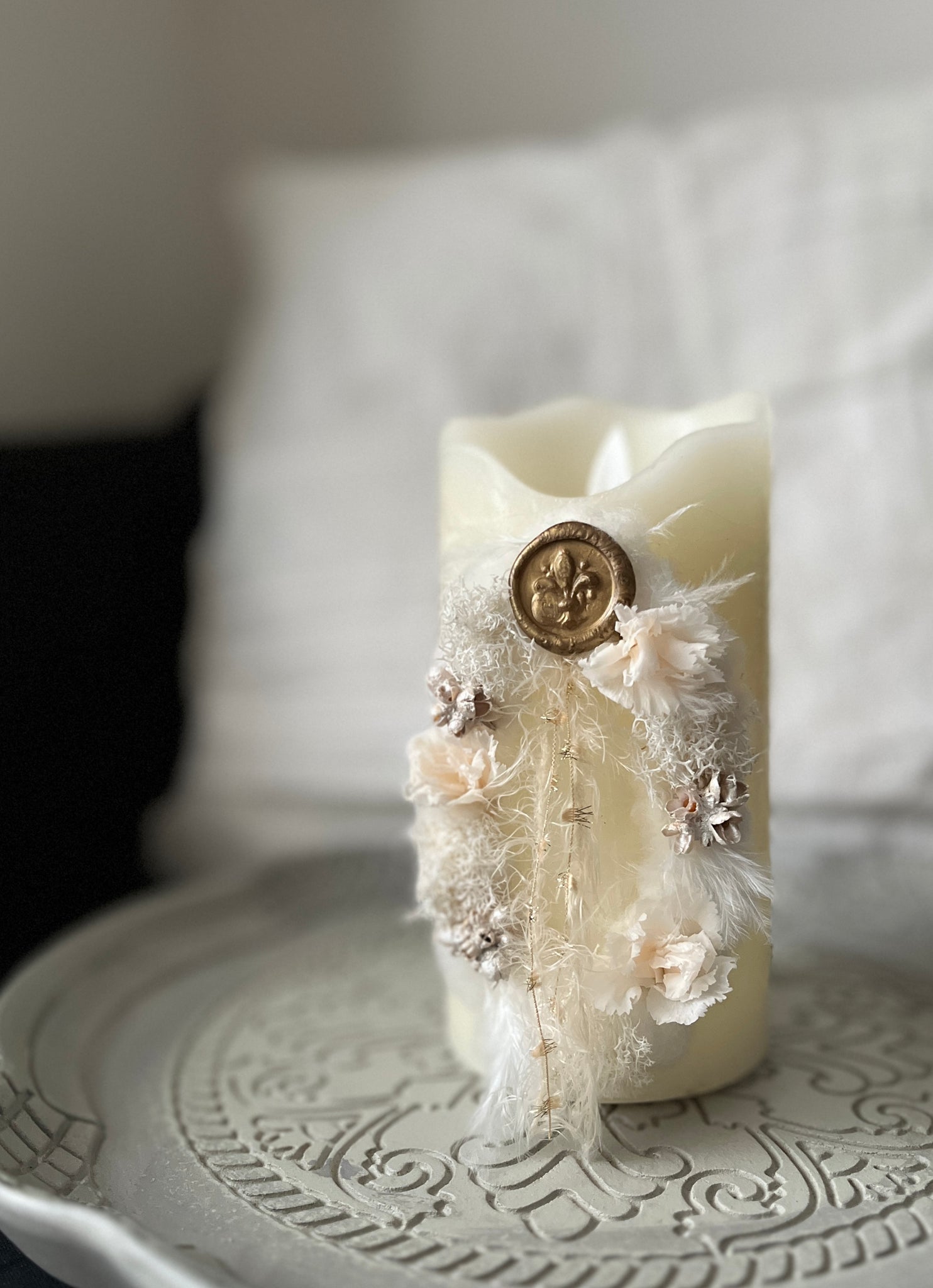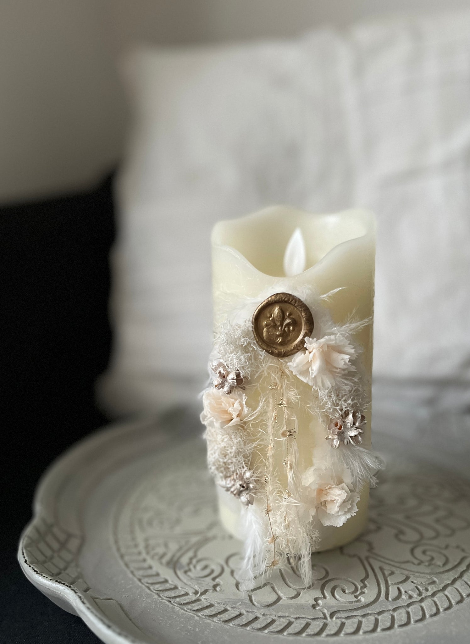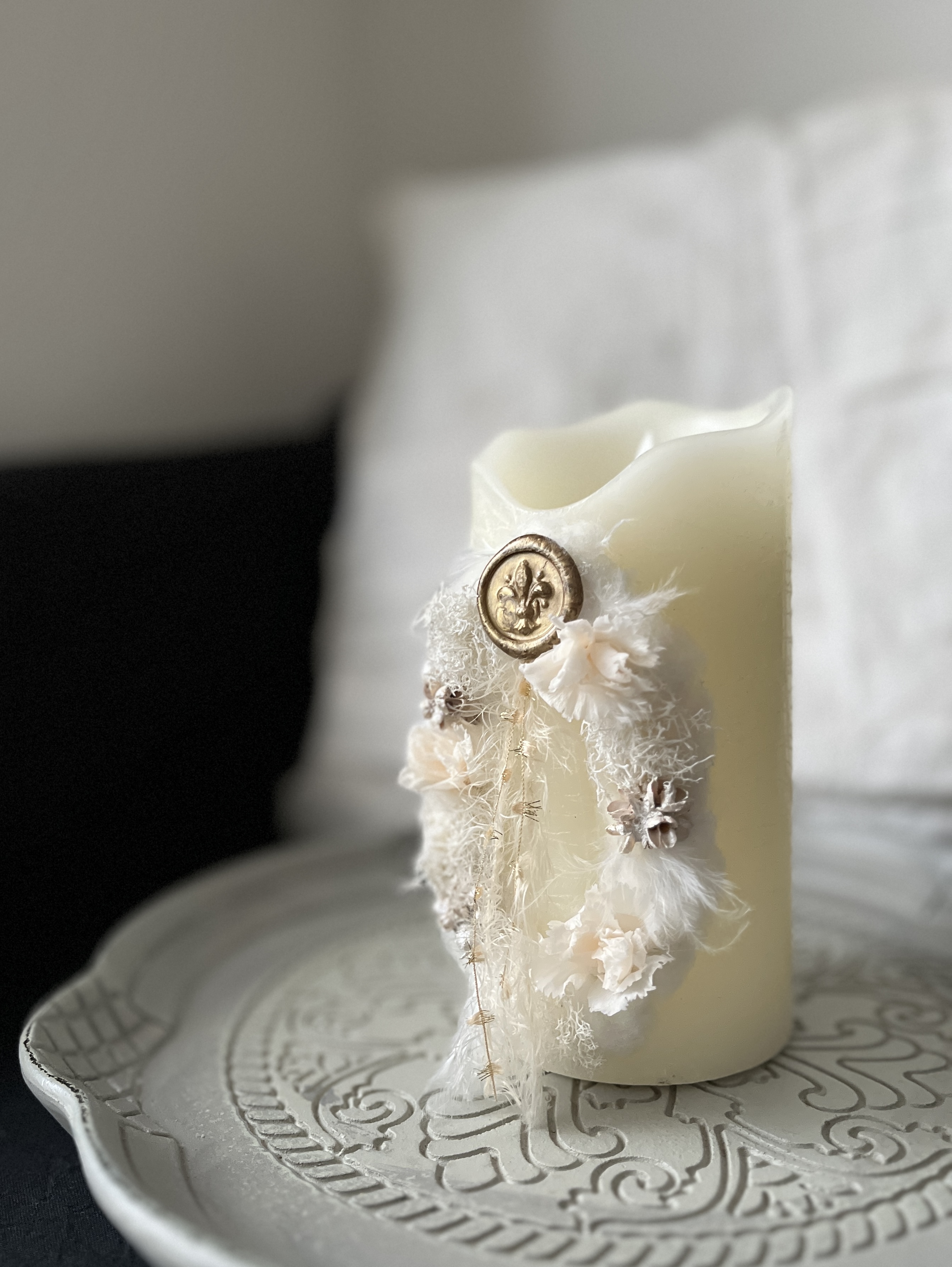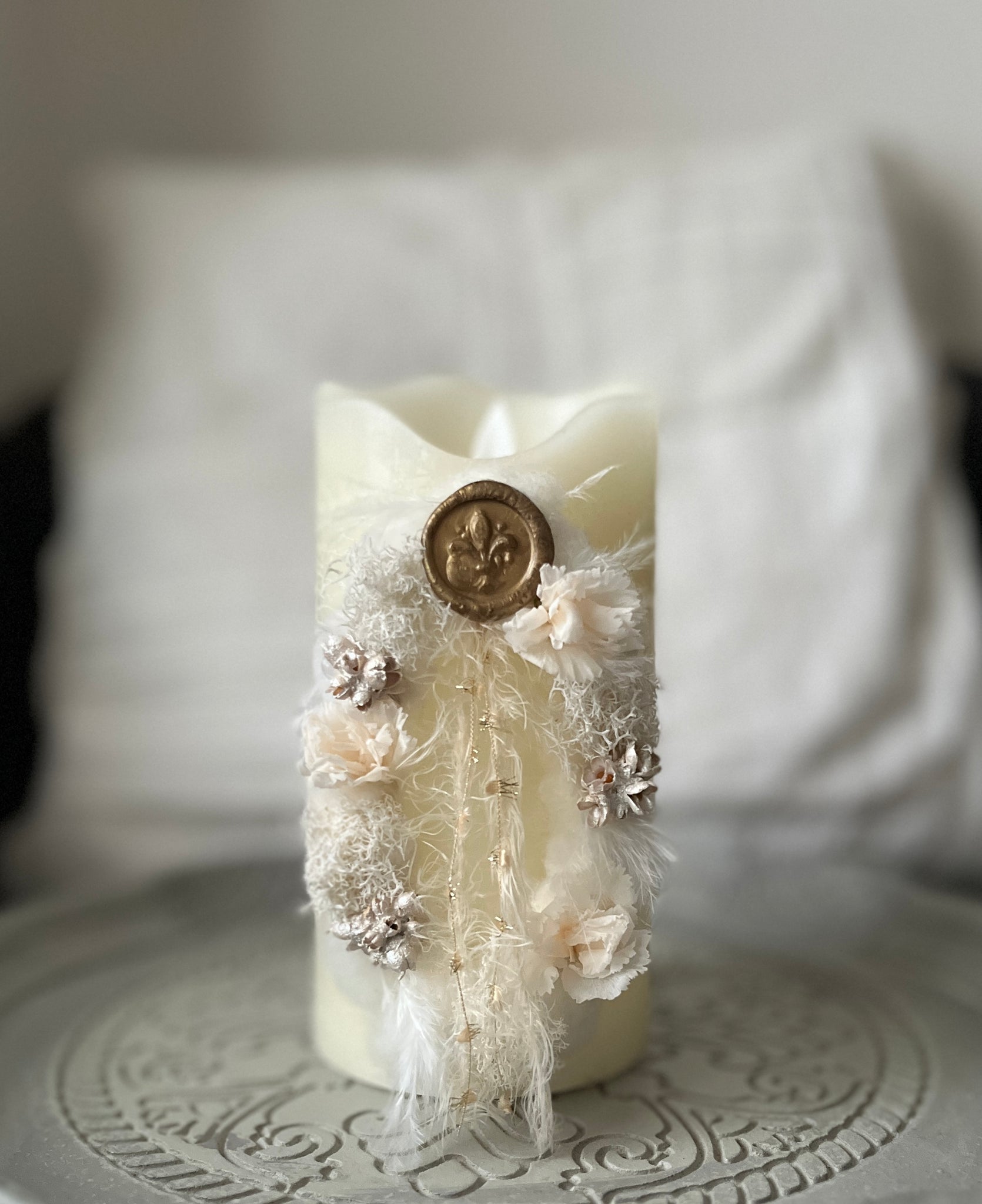 ゆらゆらとゆらめく焔がリアルなLEDキャンドルに、 プリザーブドフラワーとドライフラワーでリース状にデコレーションしたフラワーキャンドルです。