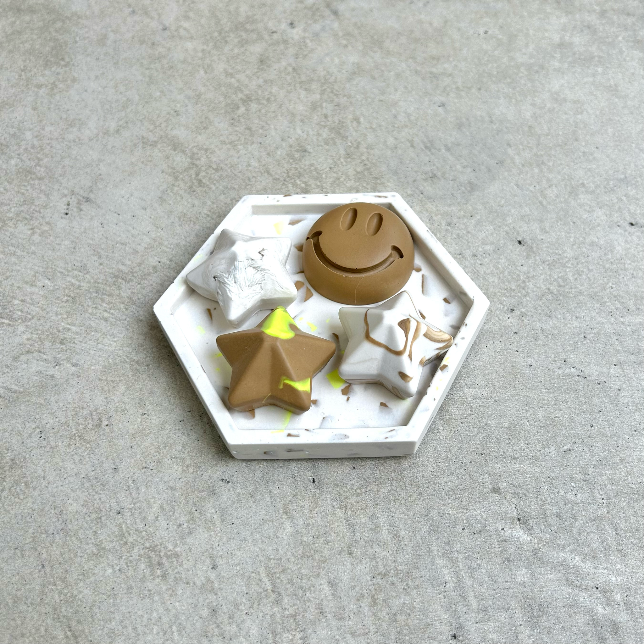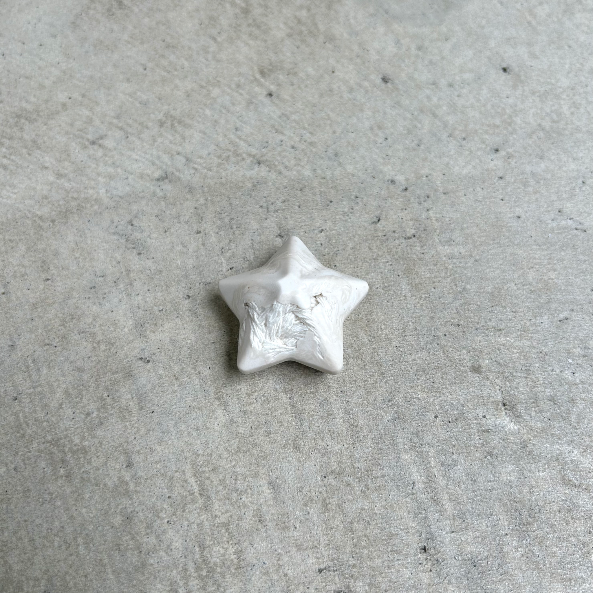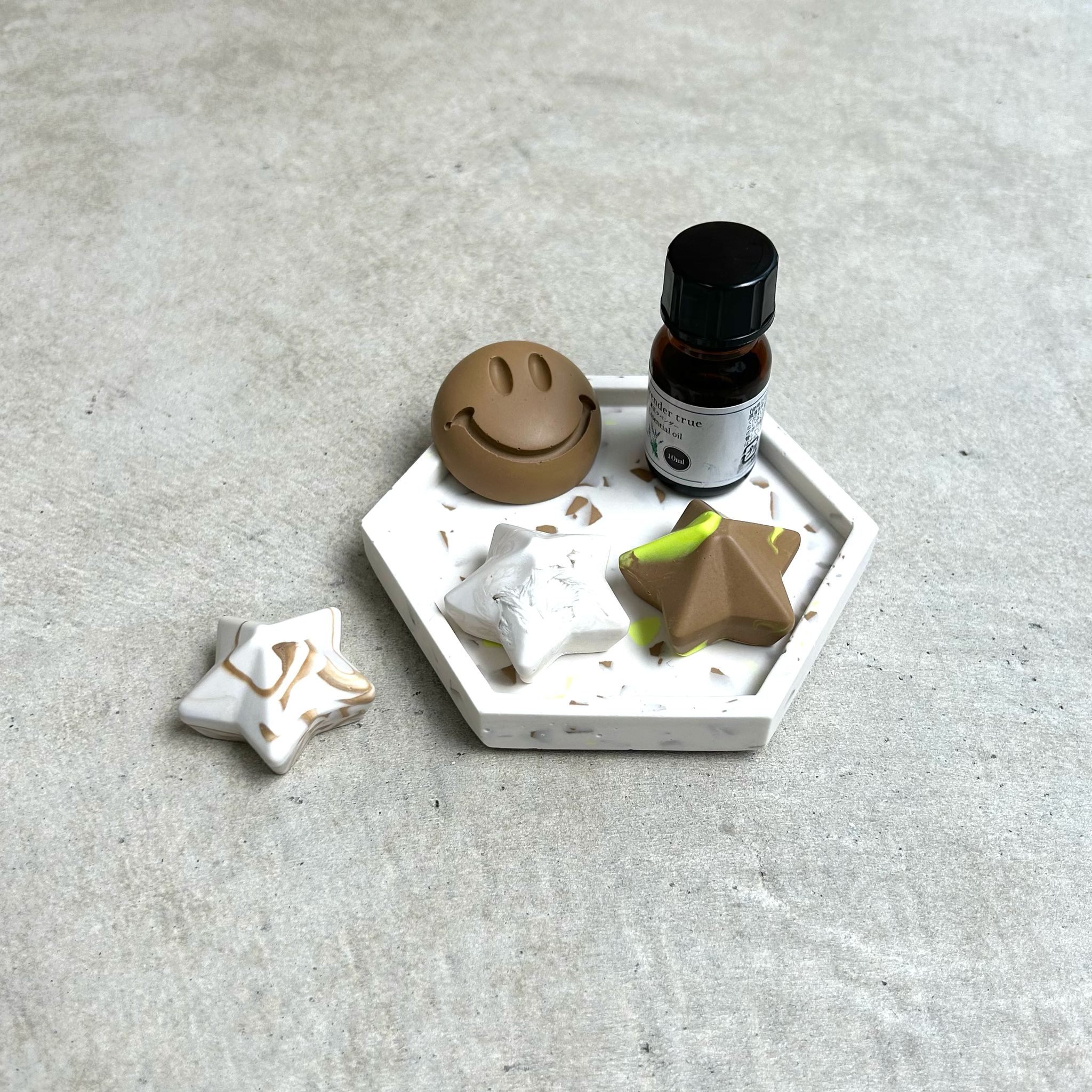 アロマを垂らして使うには香りが消えてしまいやすいJesmoniteに、その紐を混ぜ込んでみたところ、紐はより香りを放ち、長い時間楽しめ、エコにもなったので今回白い星形のみに採用しています。