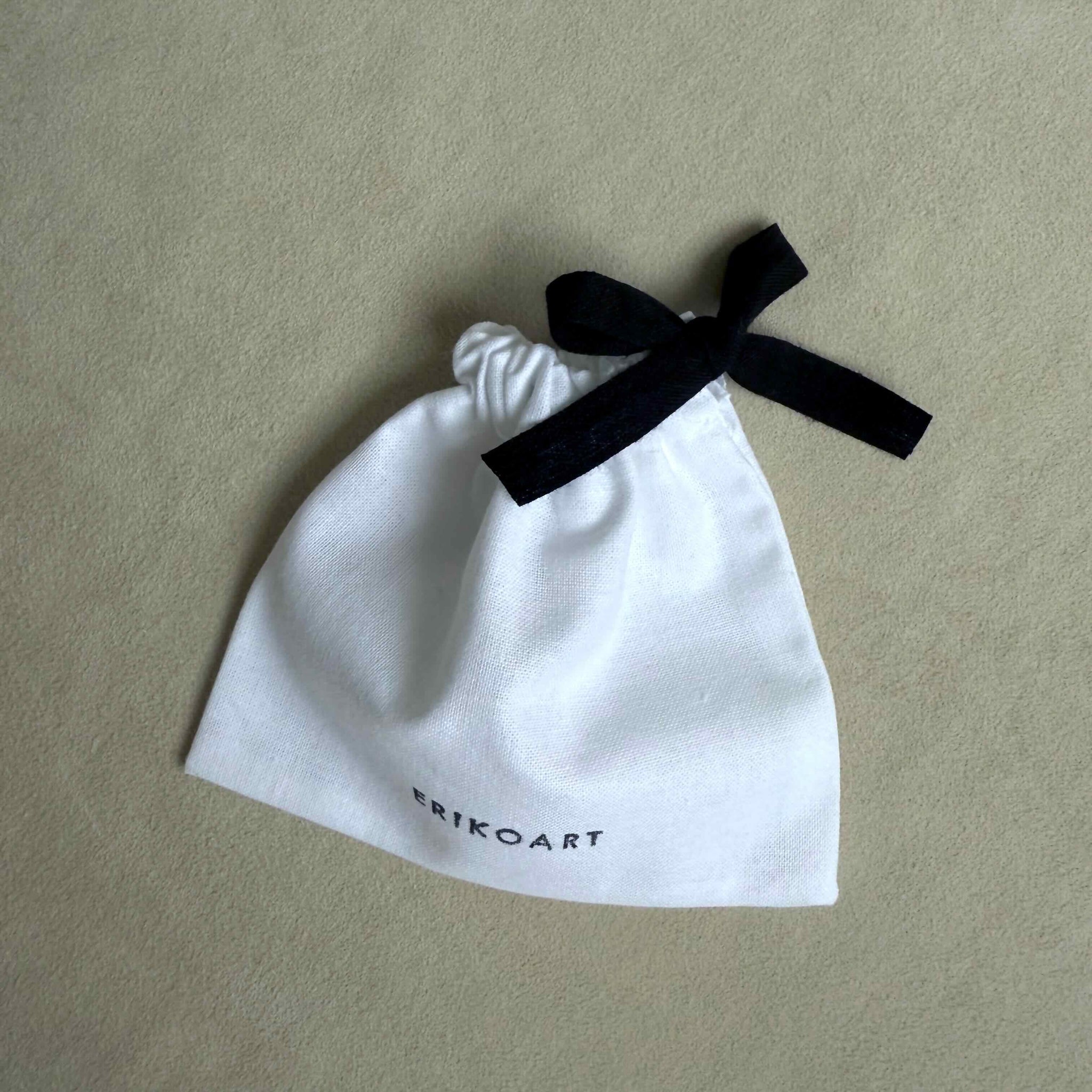 ジュエリーはこちらのカードと合わせ、布製のパッケージでお渡しいたします。こちらは、1800年代初頭にヨーロッパで流行したレティキュールと呼ばれる巾着袋のようなバッグと、美術作品に登場する白い布から生まれたデザインです。