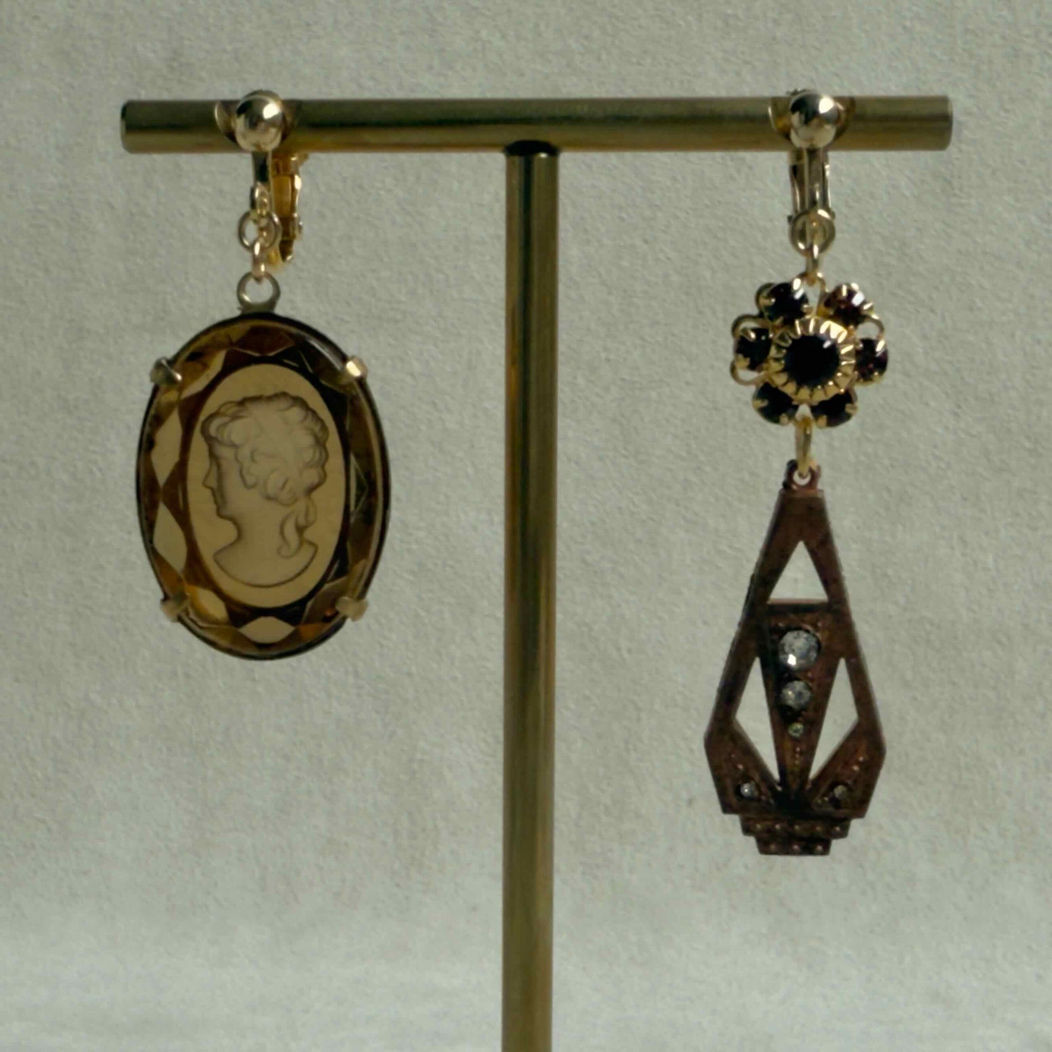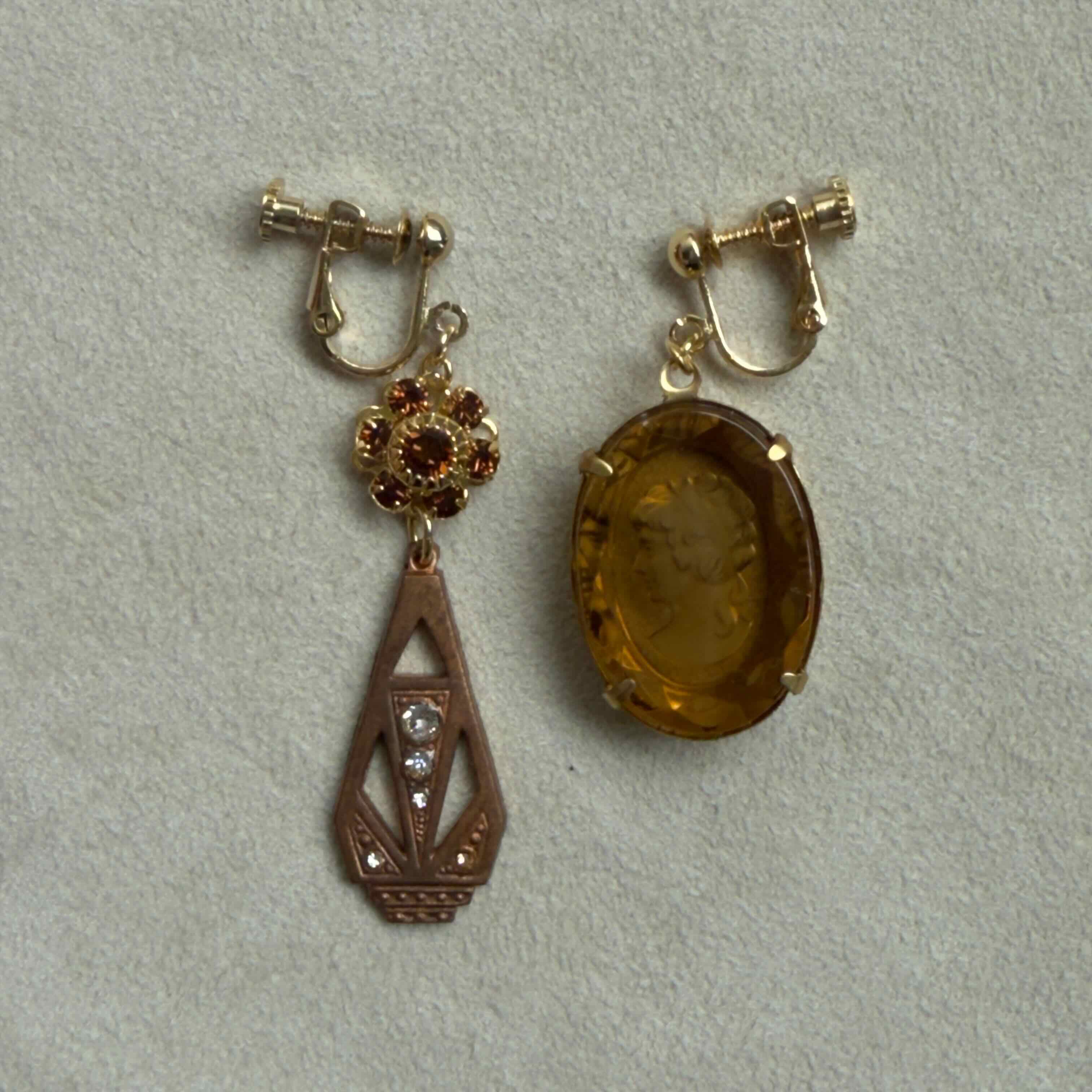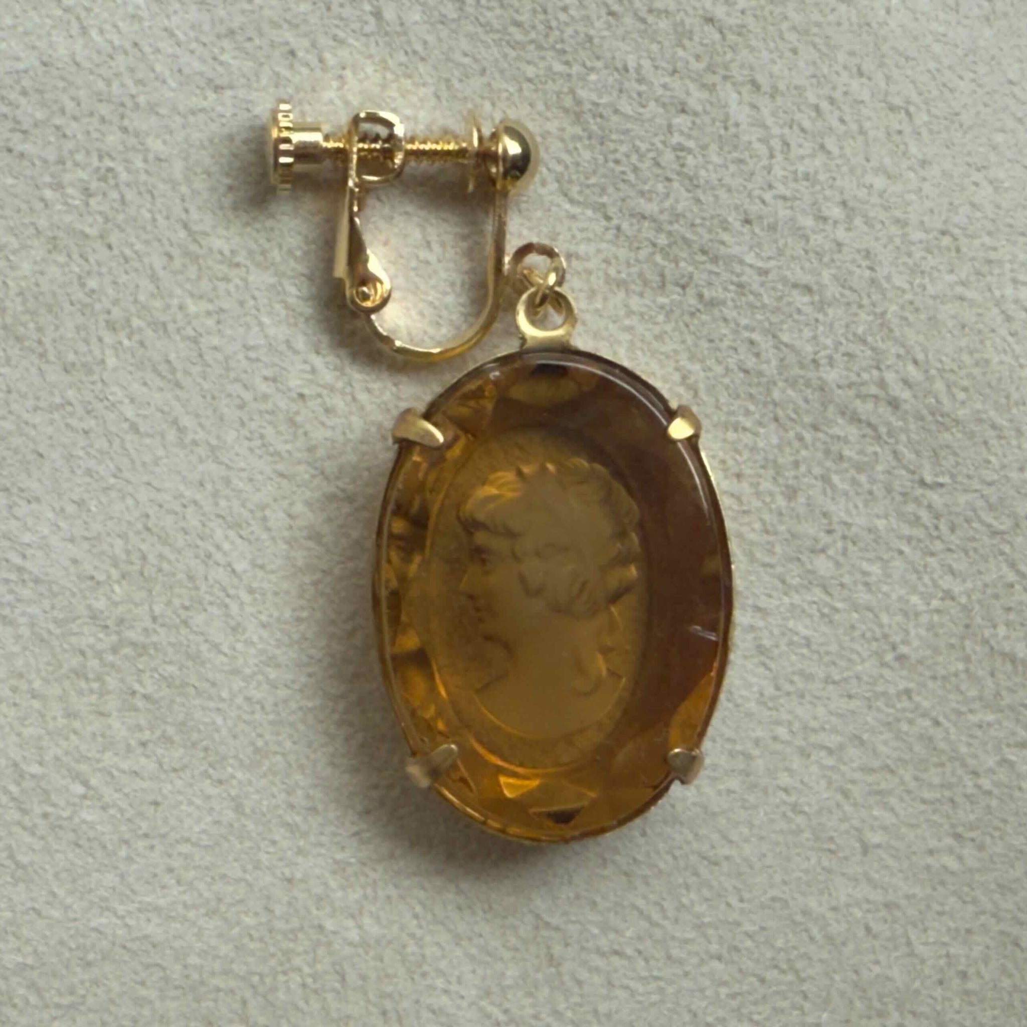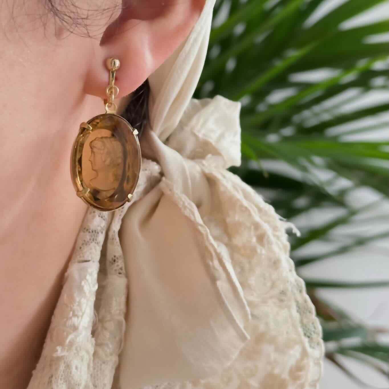 左耳には、女性の横顔が裏彫りされたブラウンガラスのヴィンテージインタリオを。
