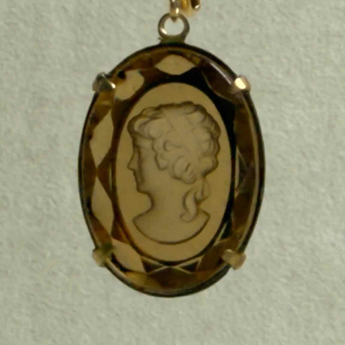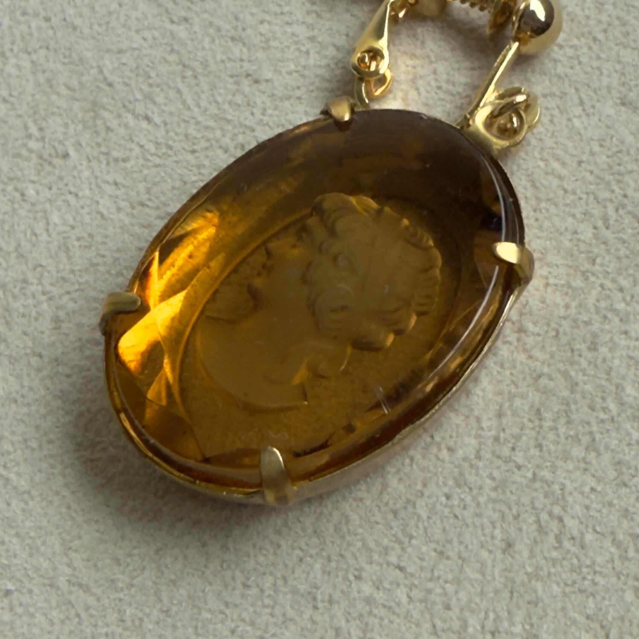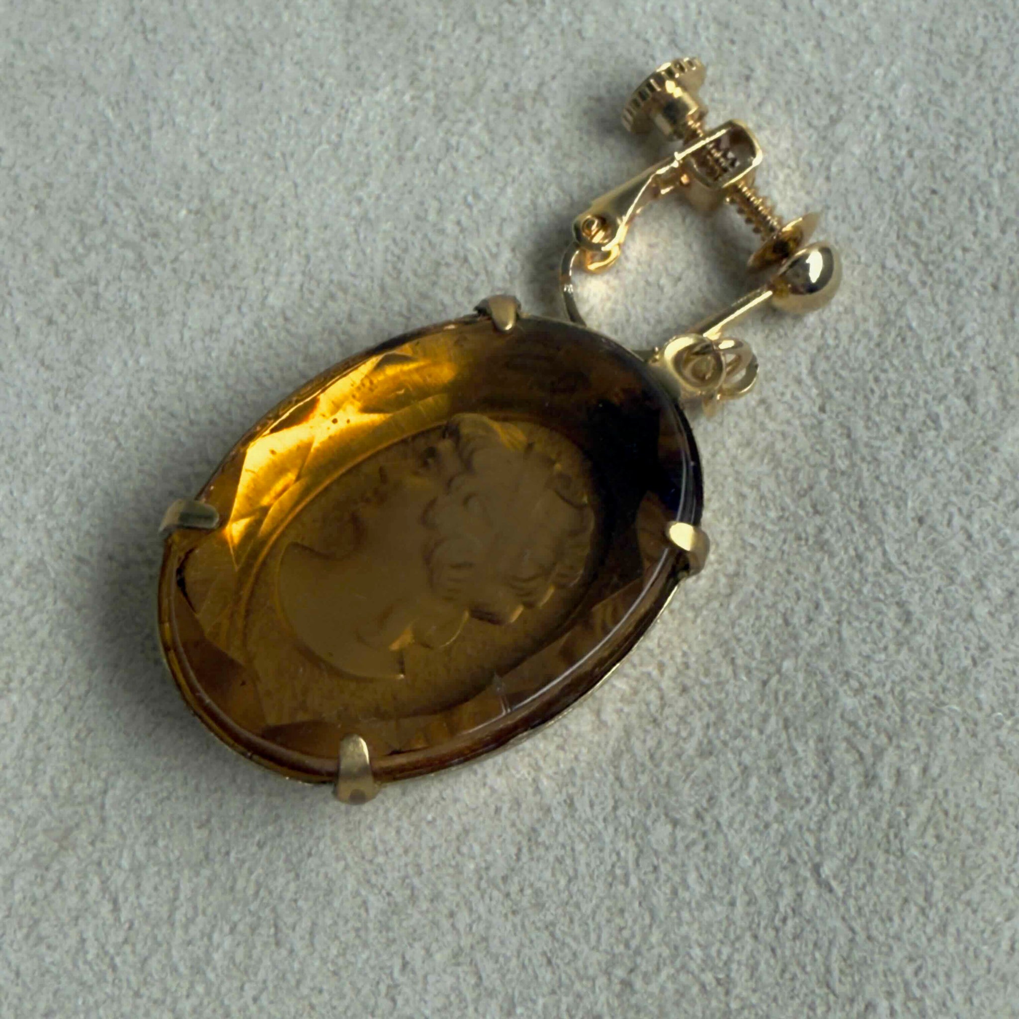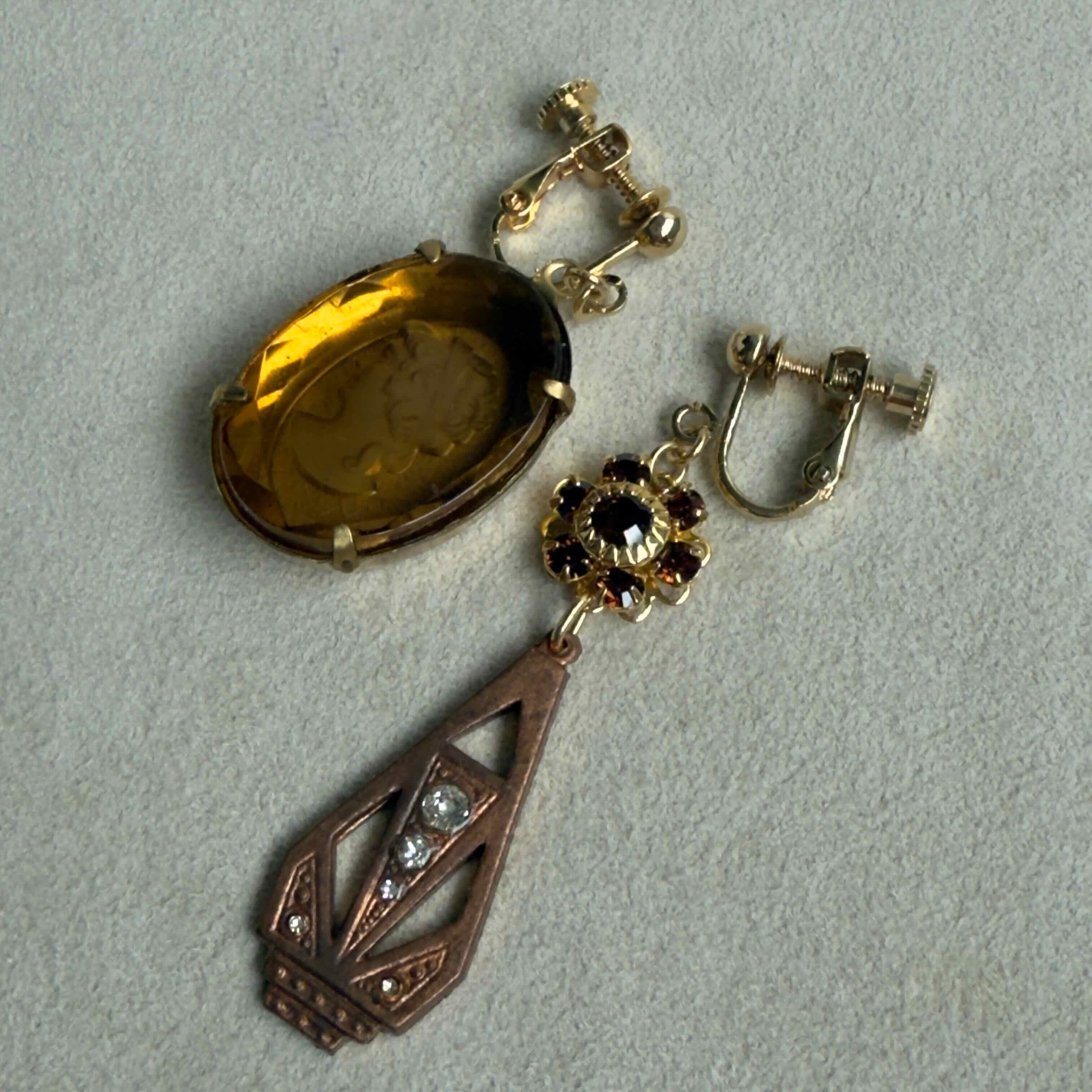 左耳には、女性の横顔が裏彫りされたブラウンガラスのヴィンテージインタリオを。