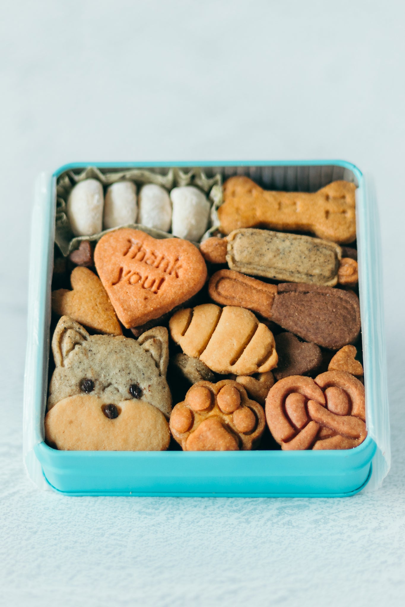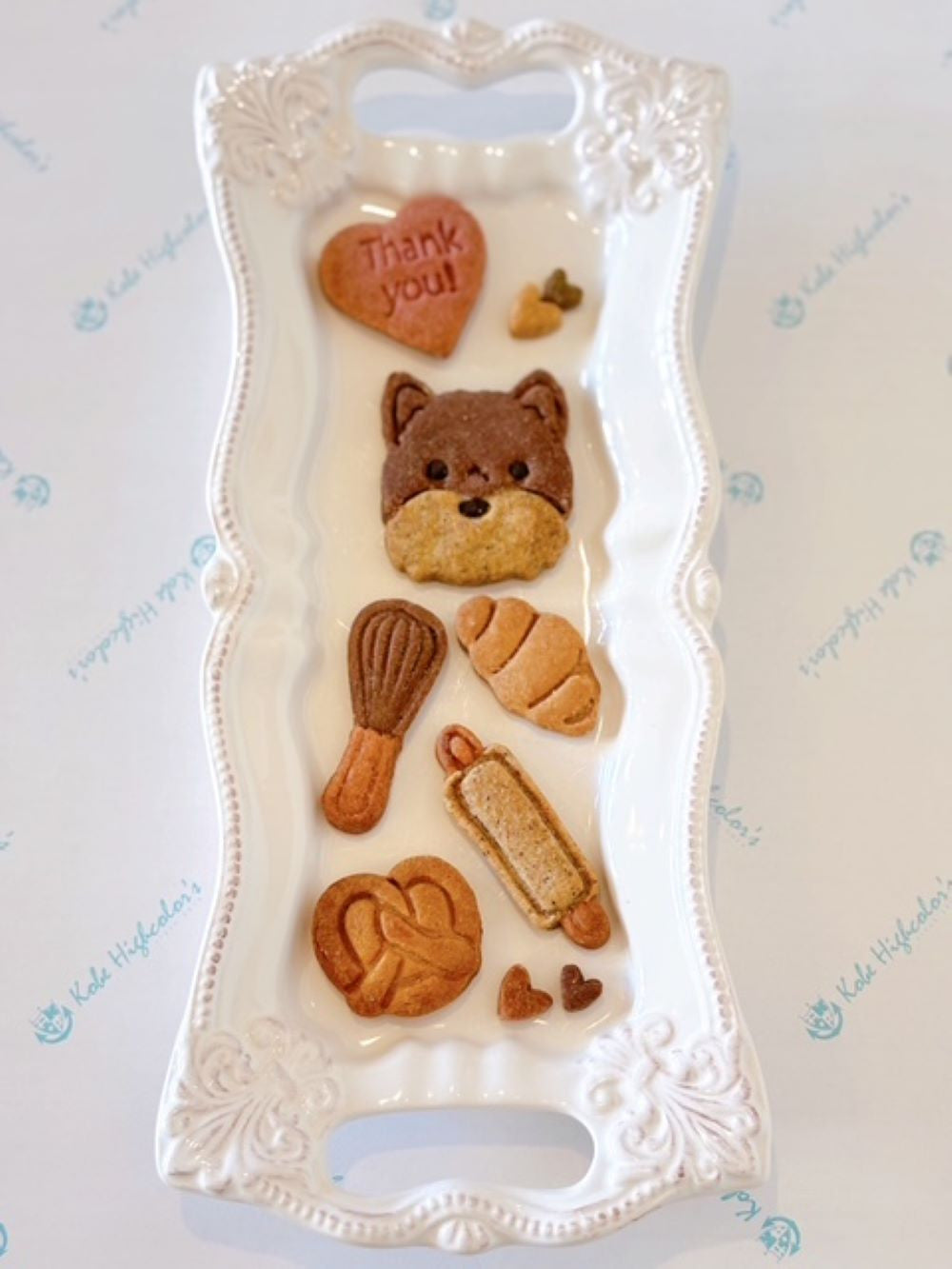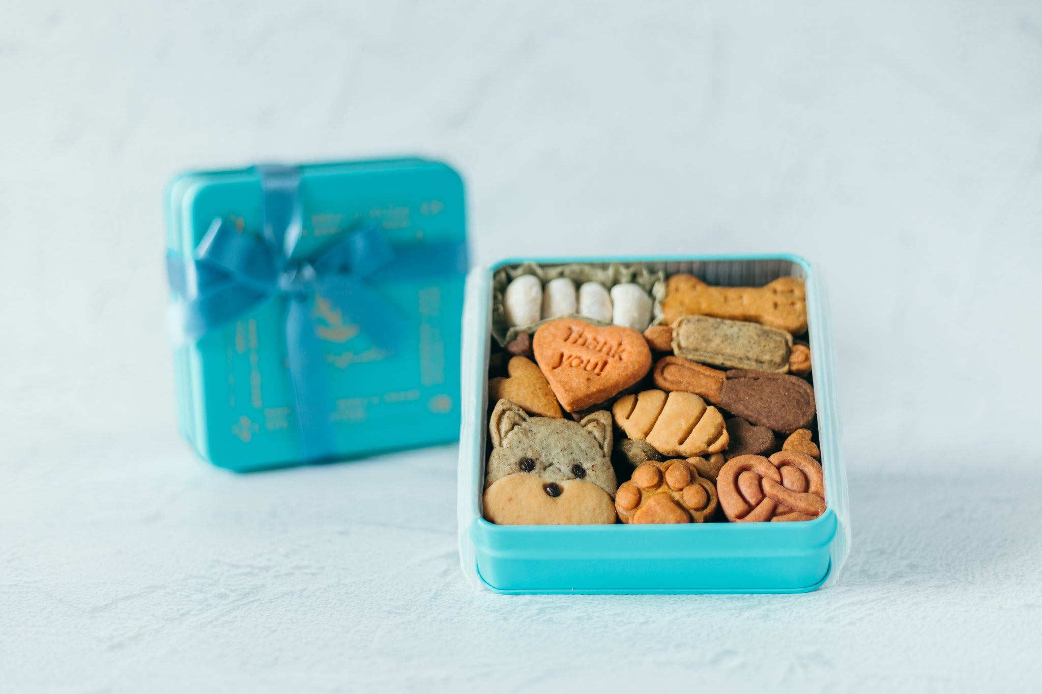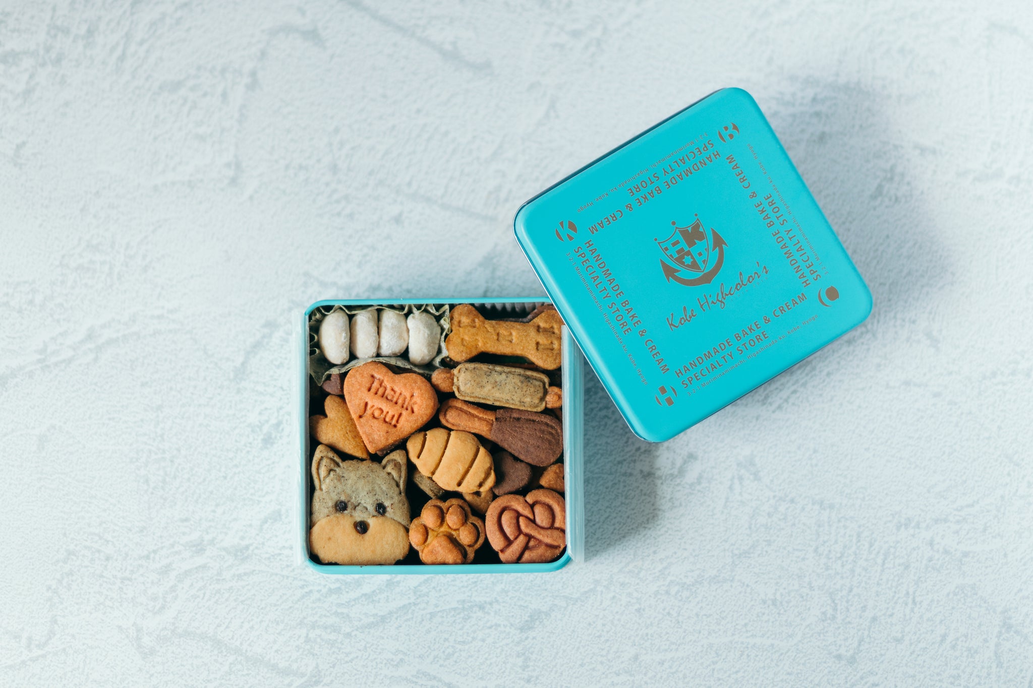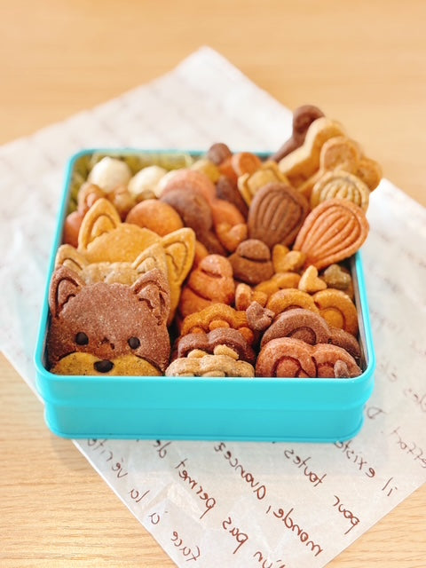 ワンちゃんをメインに骨、肉球、ハート、クロワッサン、めん棒、ホイッパー等のクッキーをギュッと可愛らしく缶に詰め込みました。  同じ形でも色々なお味が入っておりますので最後までお楽しみいただけます!