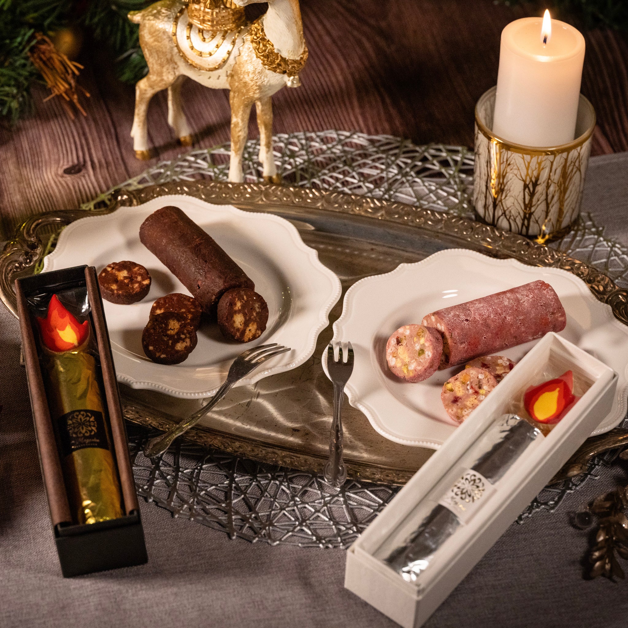 チョコレートサラミとアイシングクッキーでキャンドルに見立てた商品です。