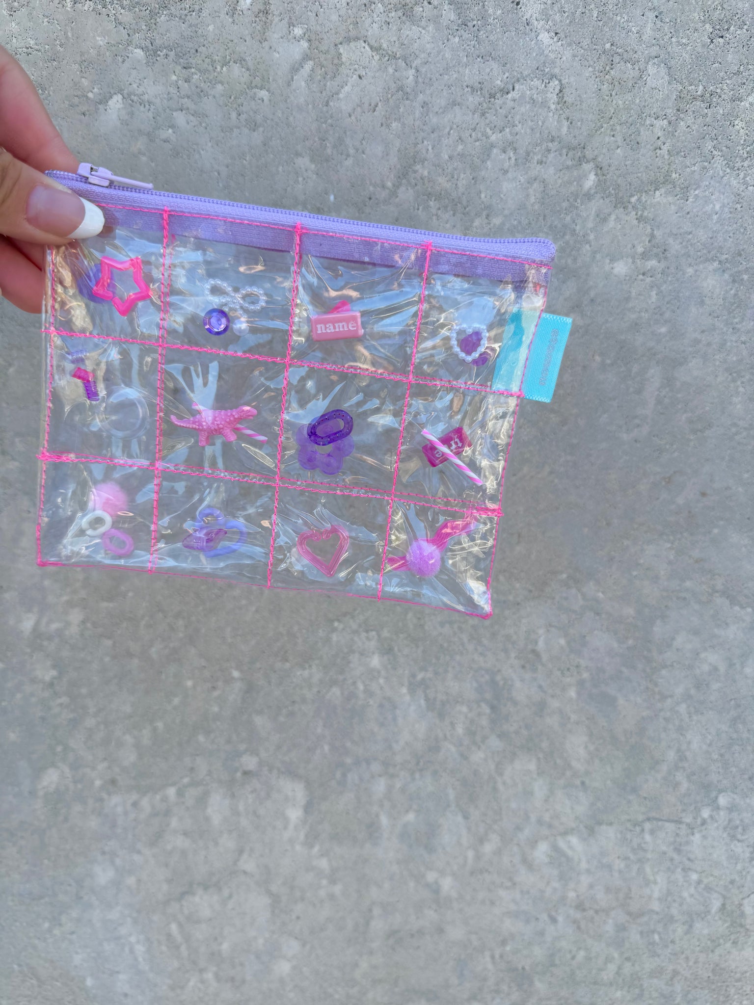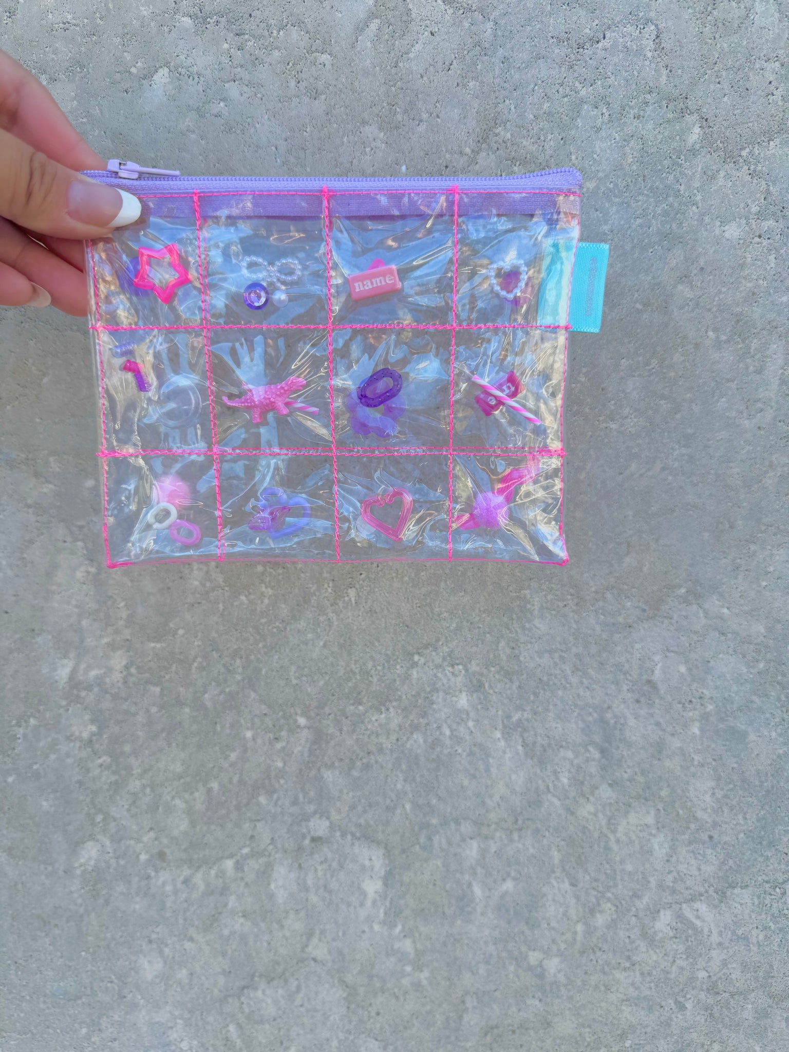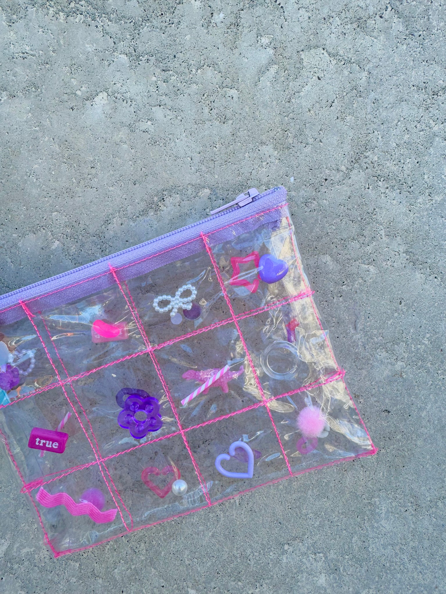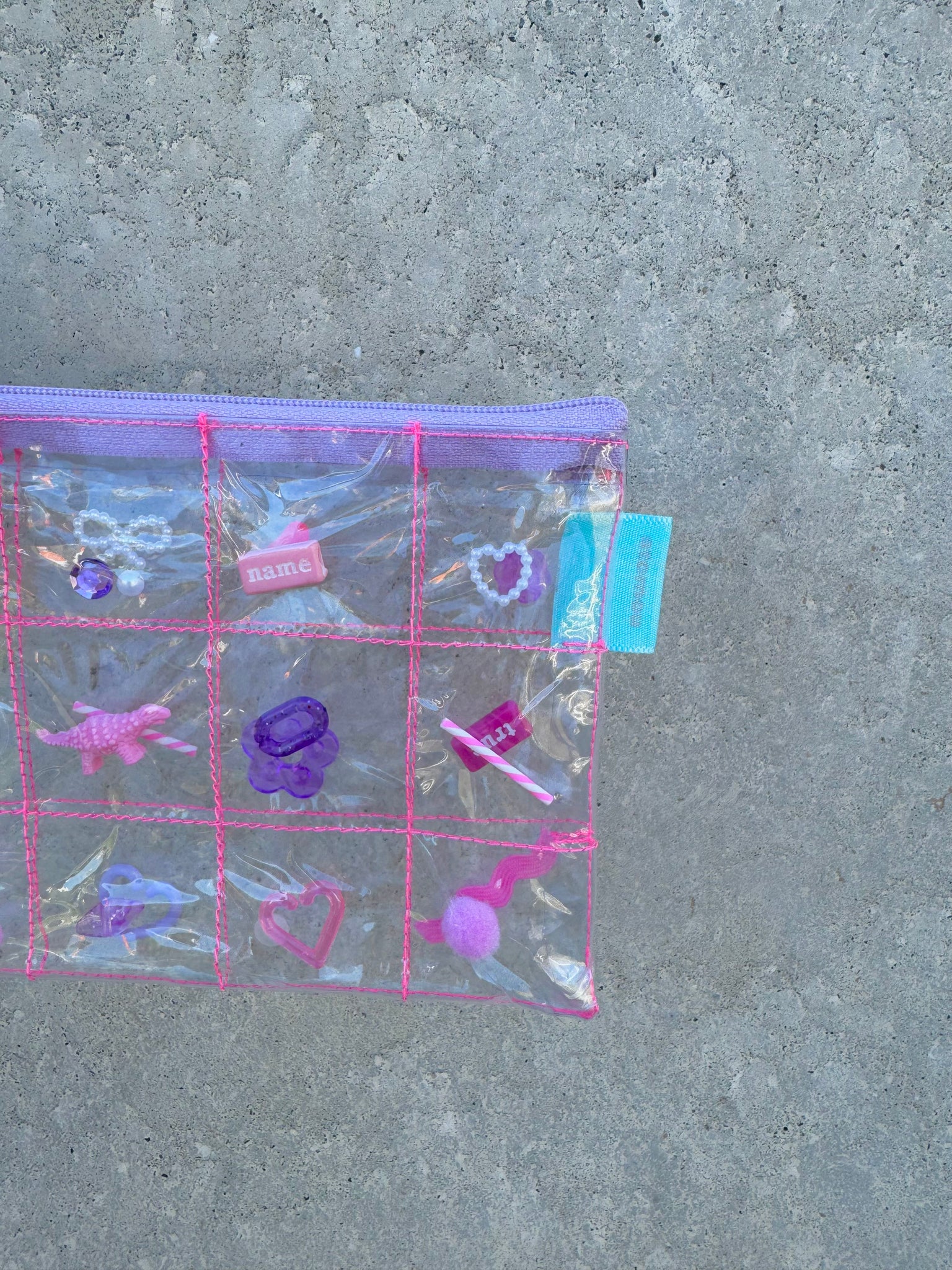 格子に縫ったPVCにパーツを閉じ込めたポーチ