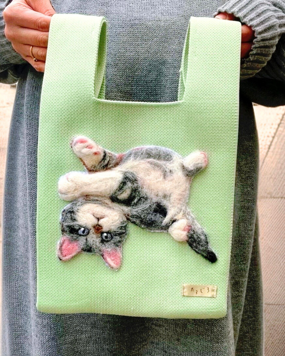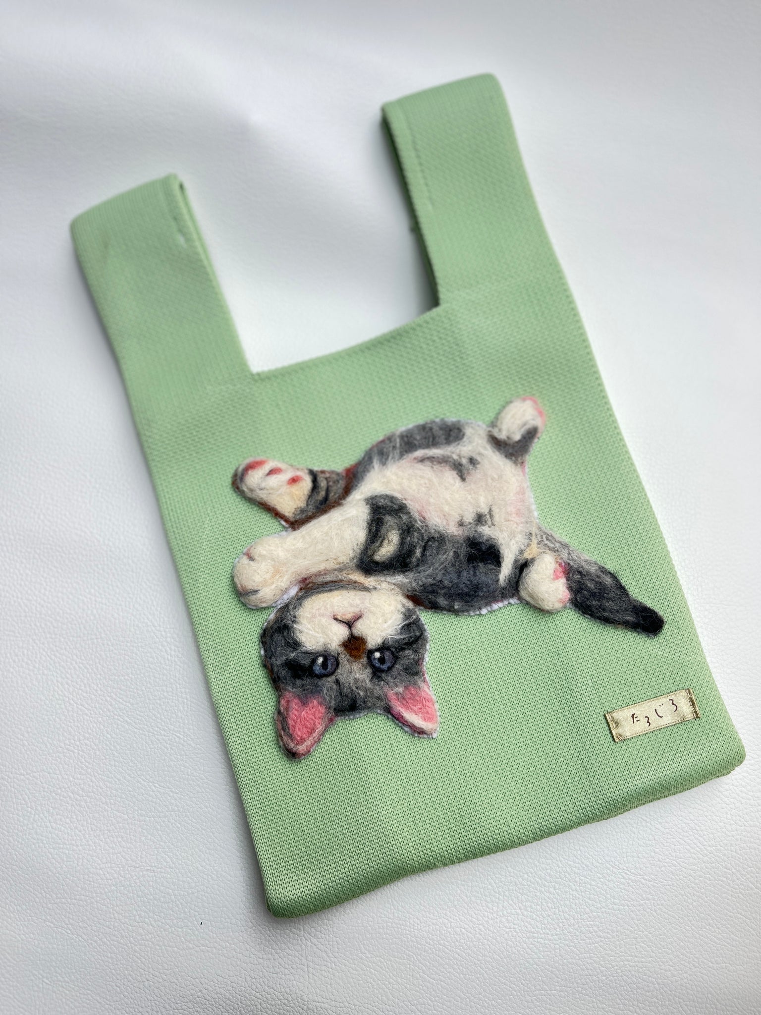 ごろりん子猫のニットバッグ(グレー×白)|たろじろ