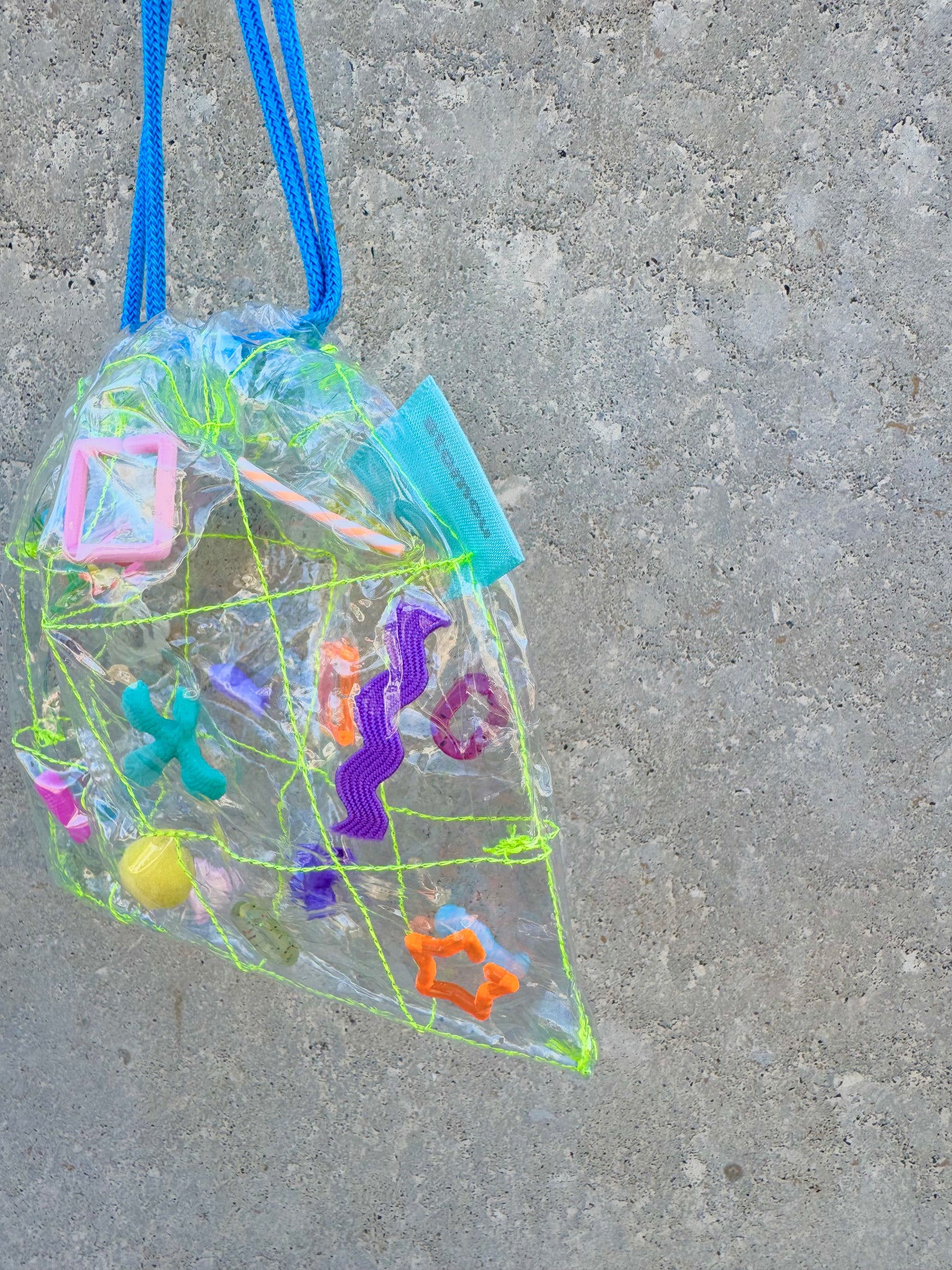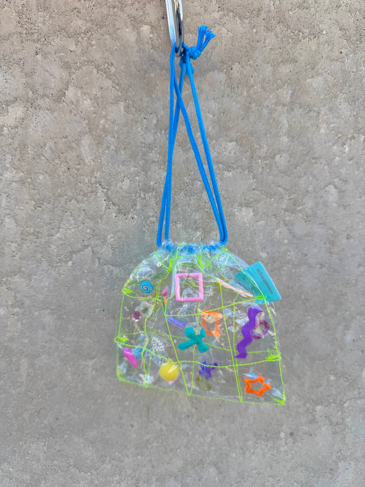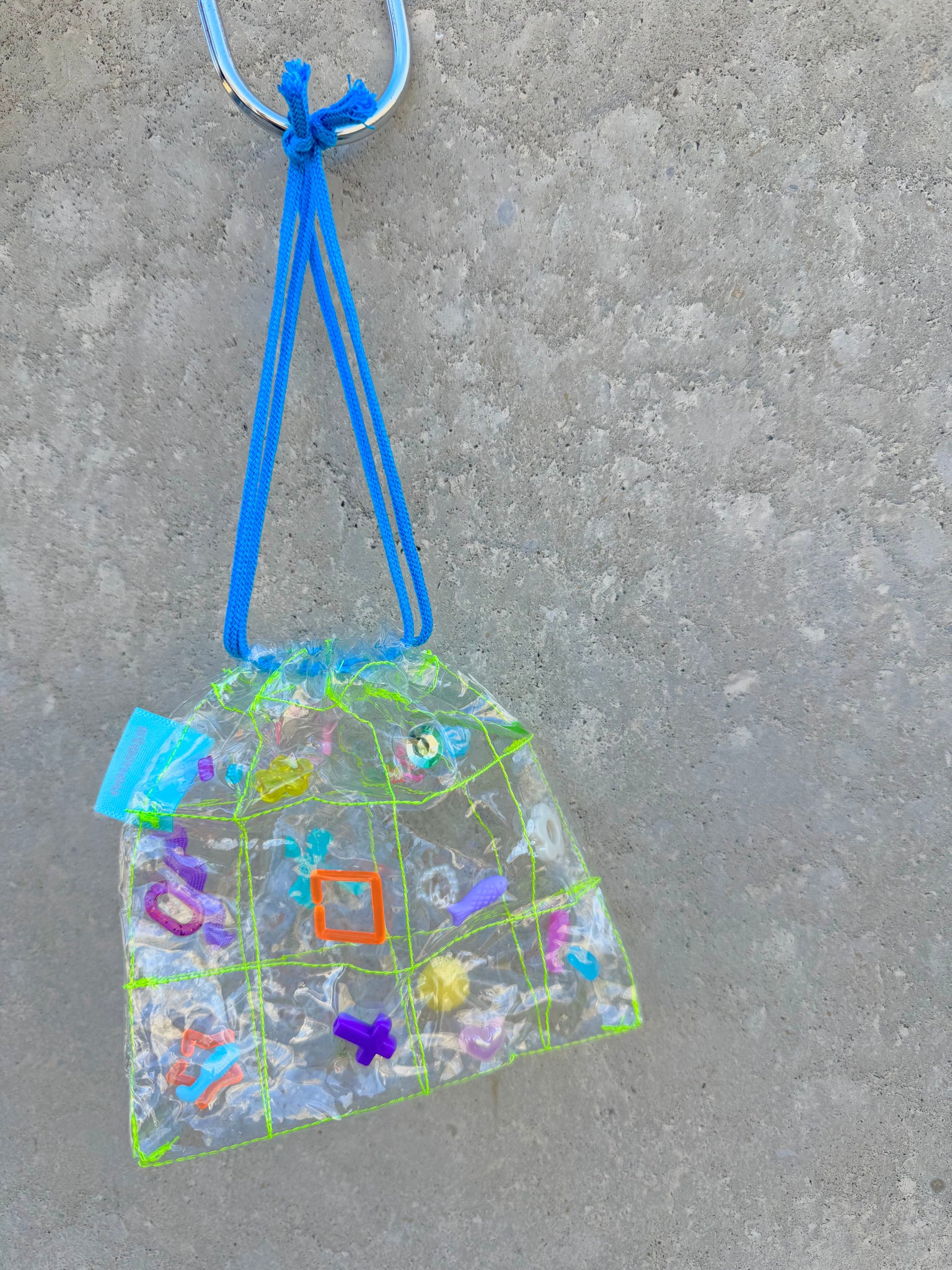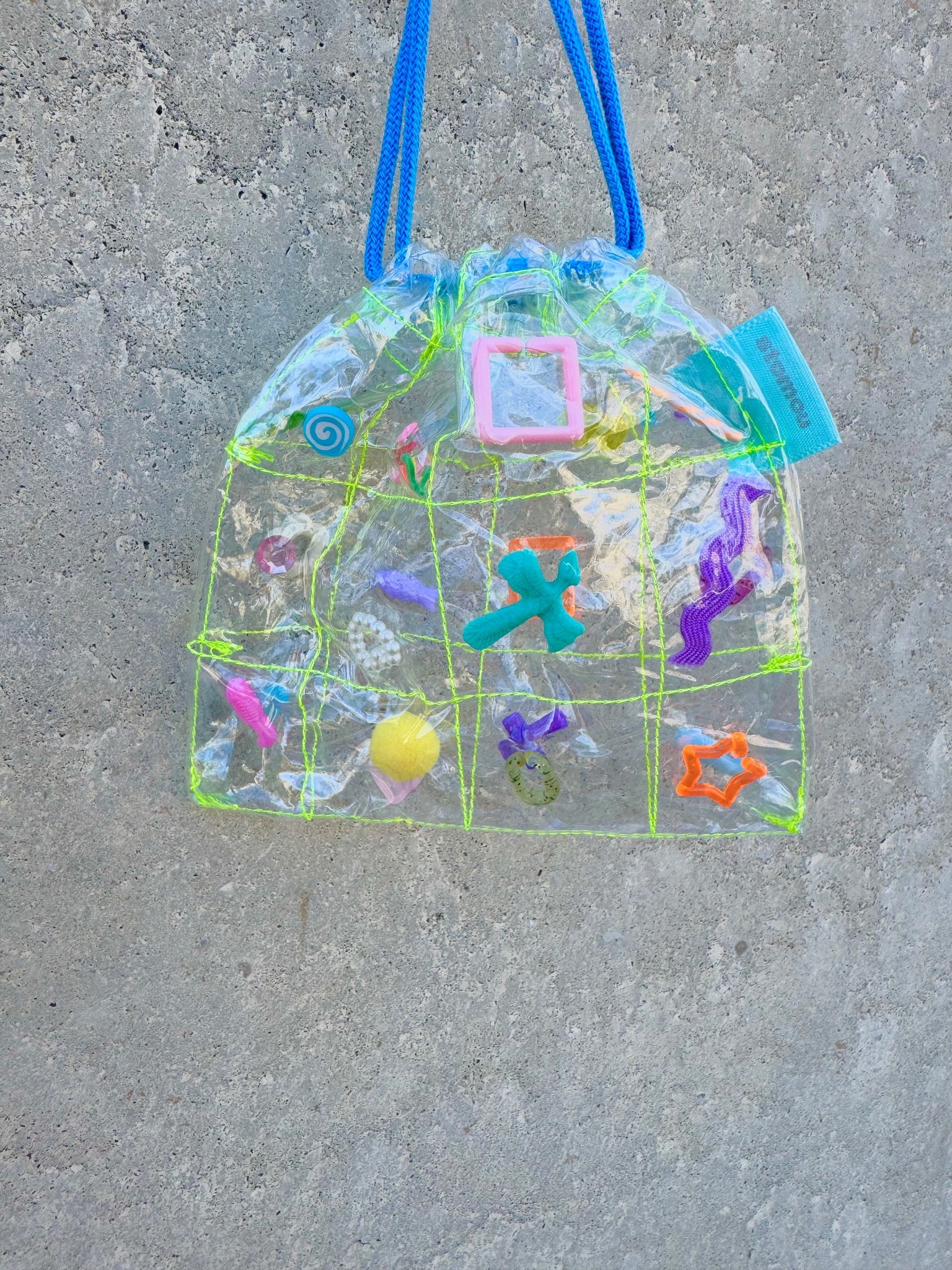 透明の格子状に縫った生地に、パーツを閉じ込めた巾着になります。
