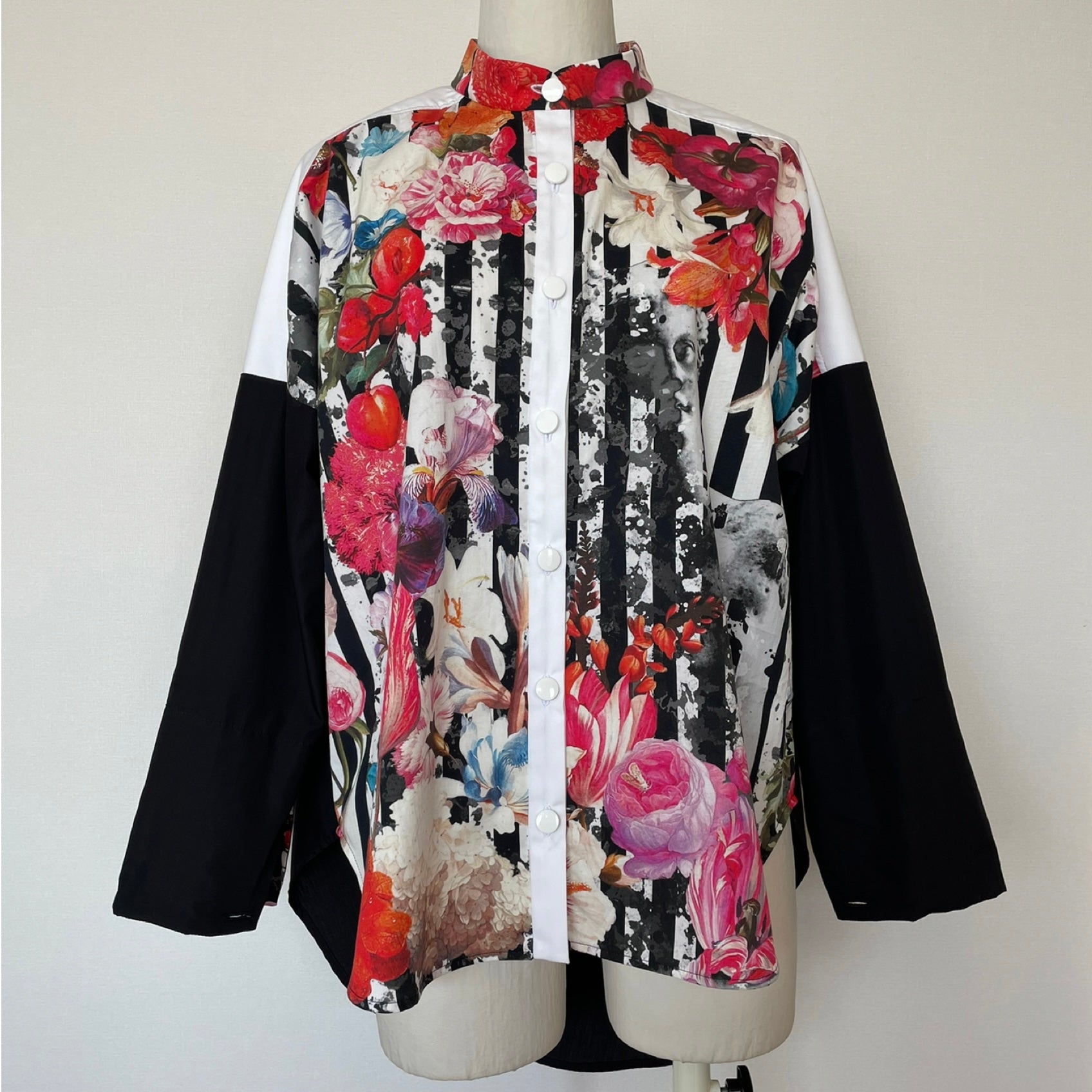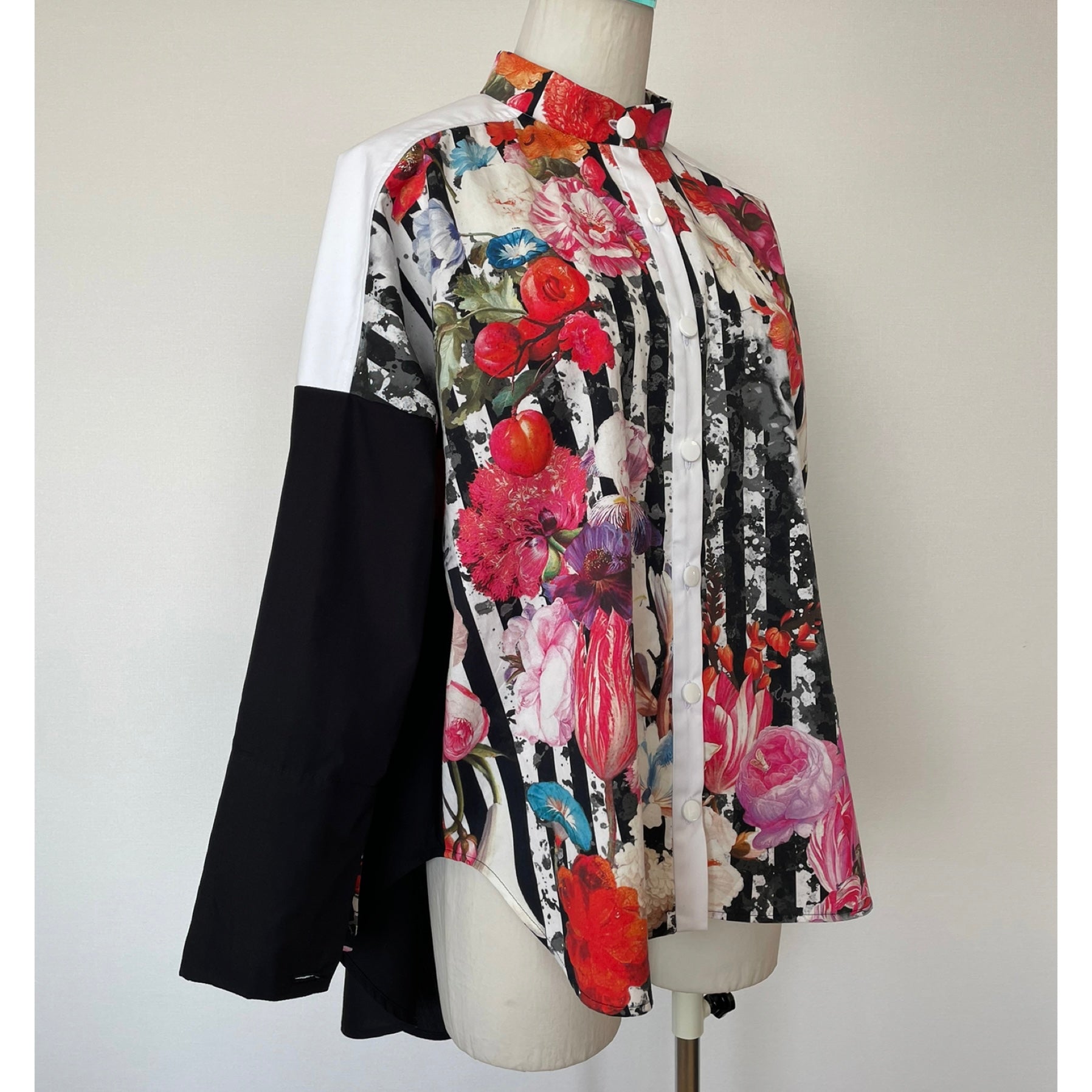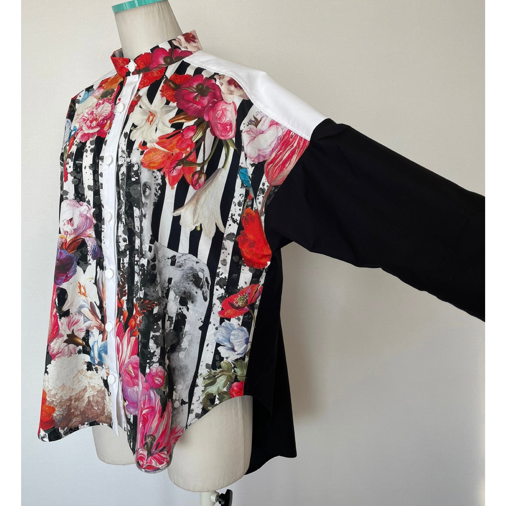 オリジナルのコラージュアートをプリントした生地で、型紙、縫製まですべての工程をデザイナー自身が行ったオリジナルのシャツです。