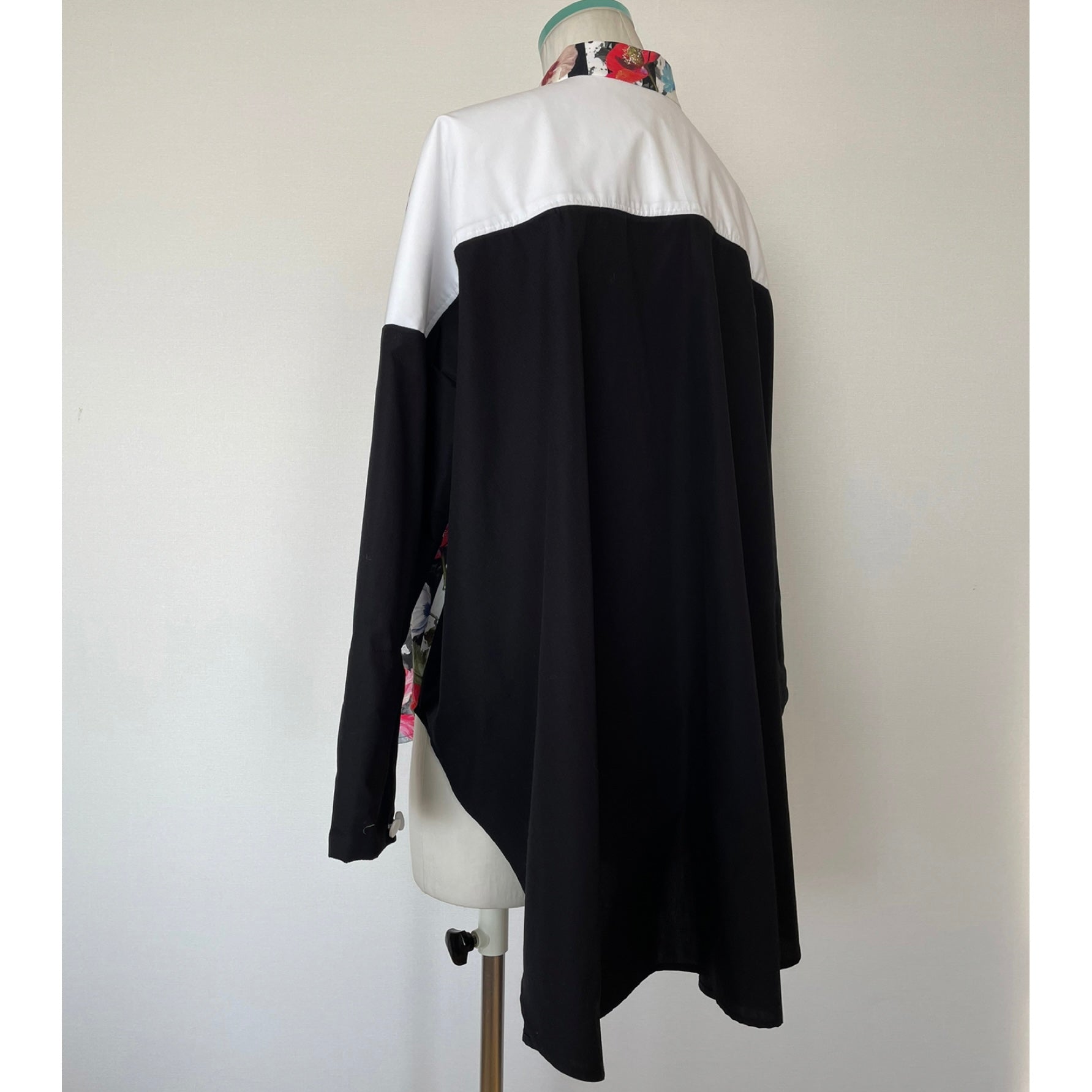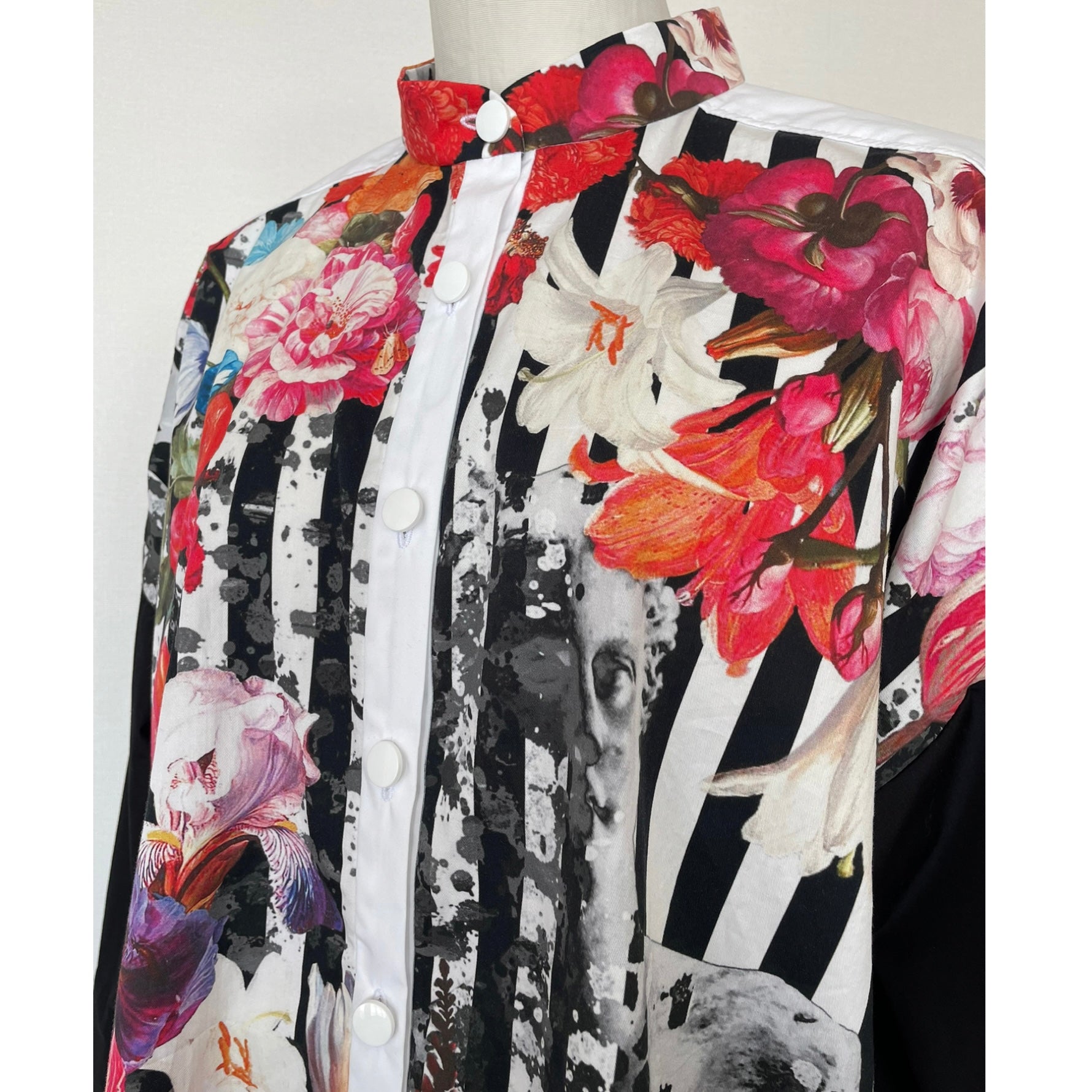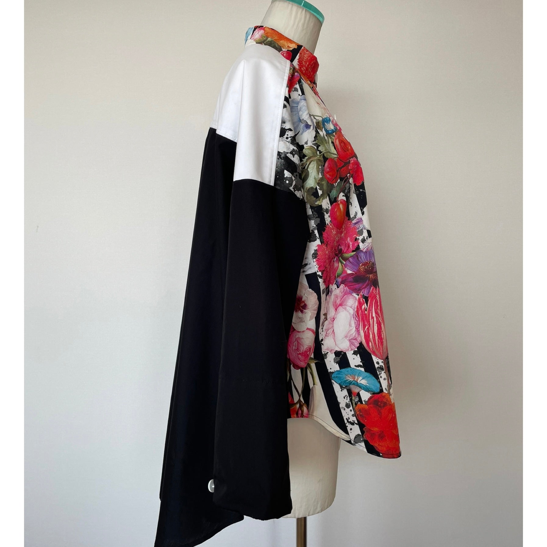オリジナルのコラージュアートをプリントした生地で、型紙、縫製まですべての工程をデザイナー自身が行ったオリジナルのシャツです。
