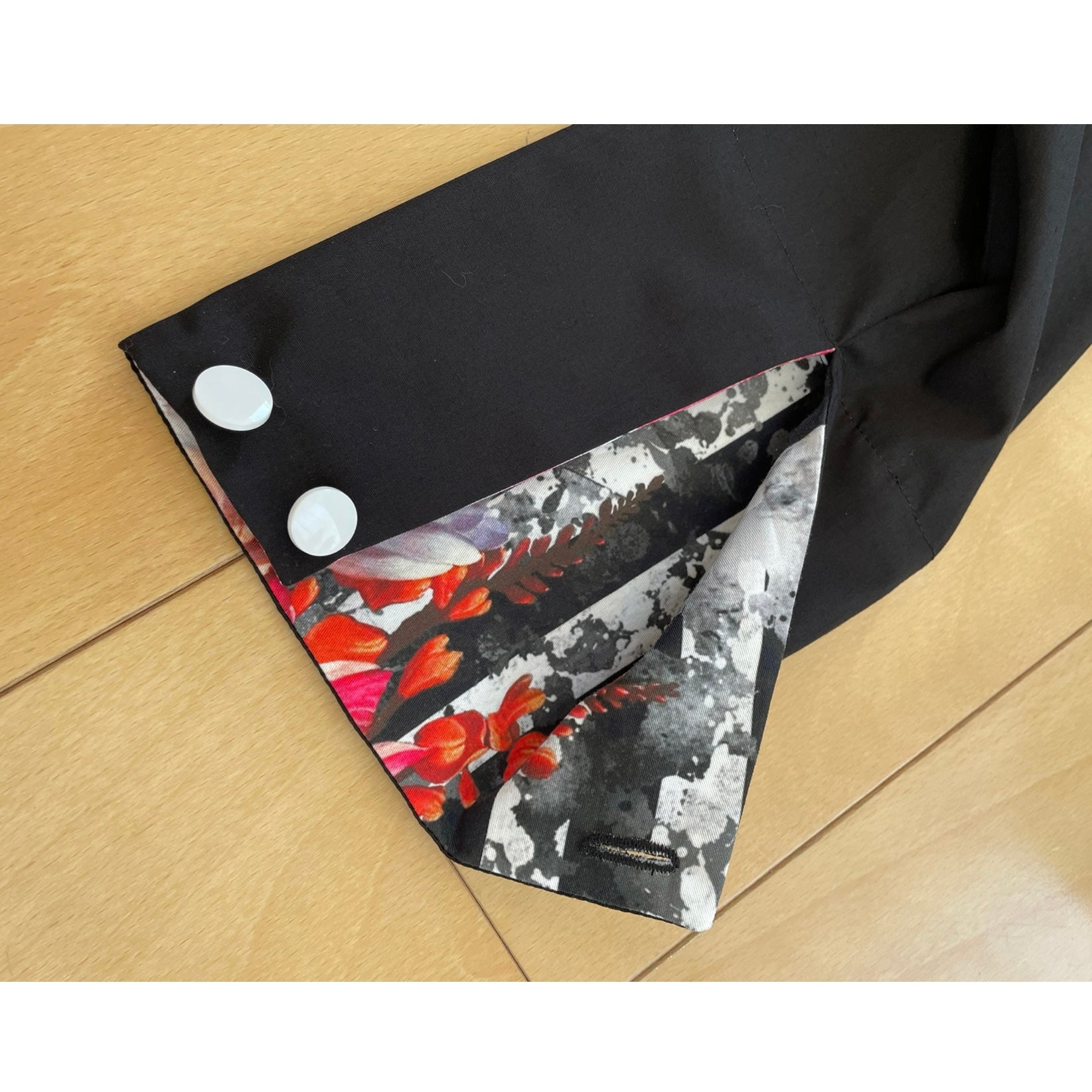 カフスのボタンは留めずに開いたスタイルで着てもよし、袖見返しを大きく付けたので、カフスを折って柄を見せても◎。