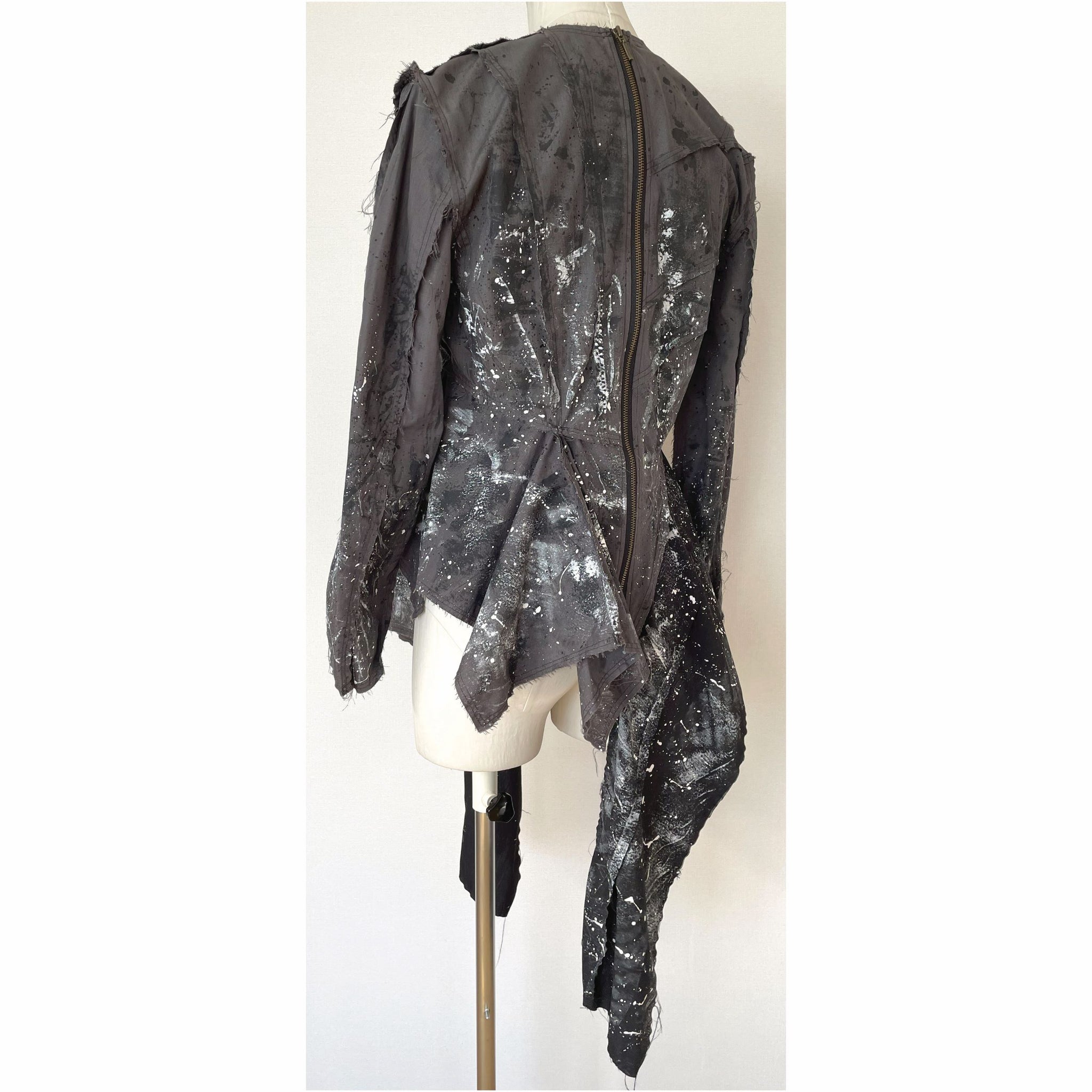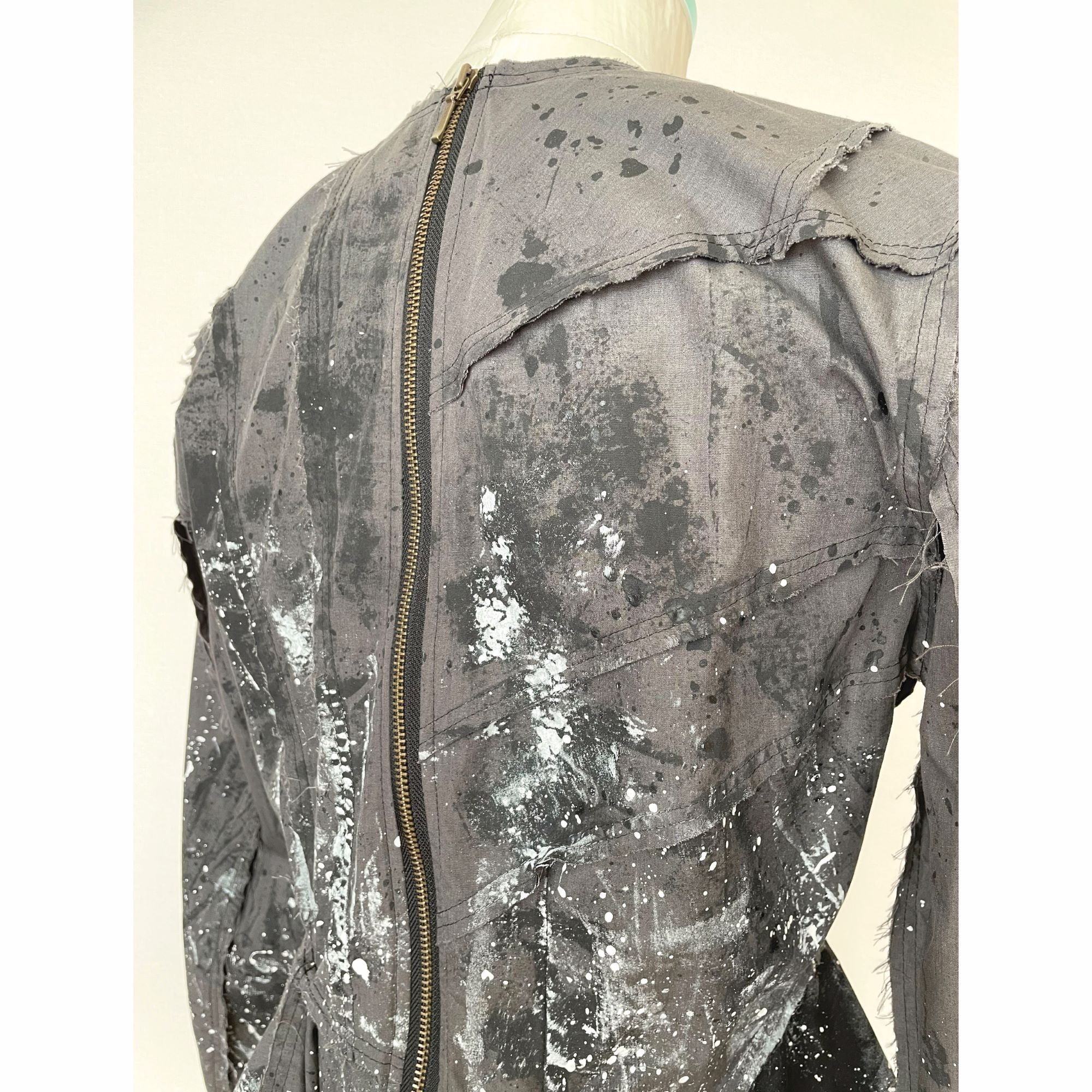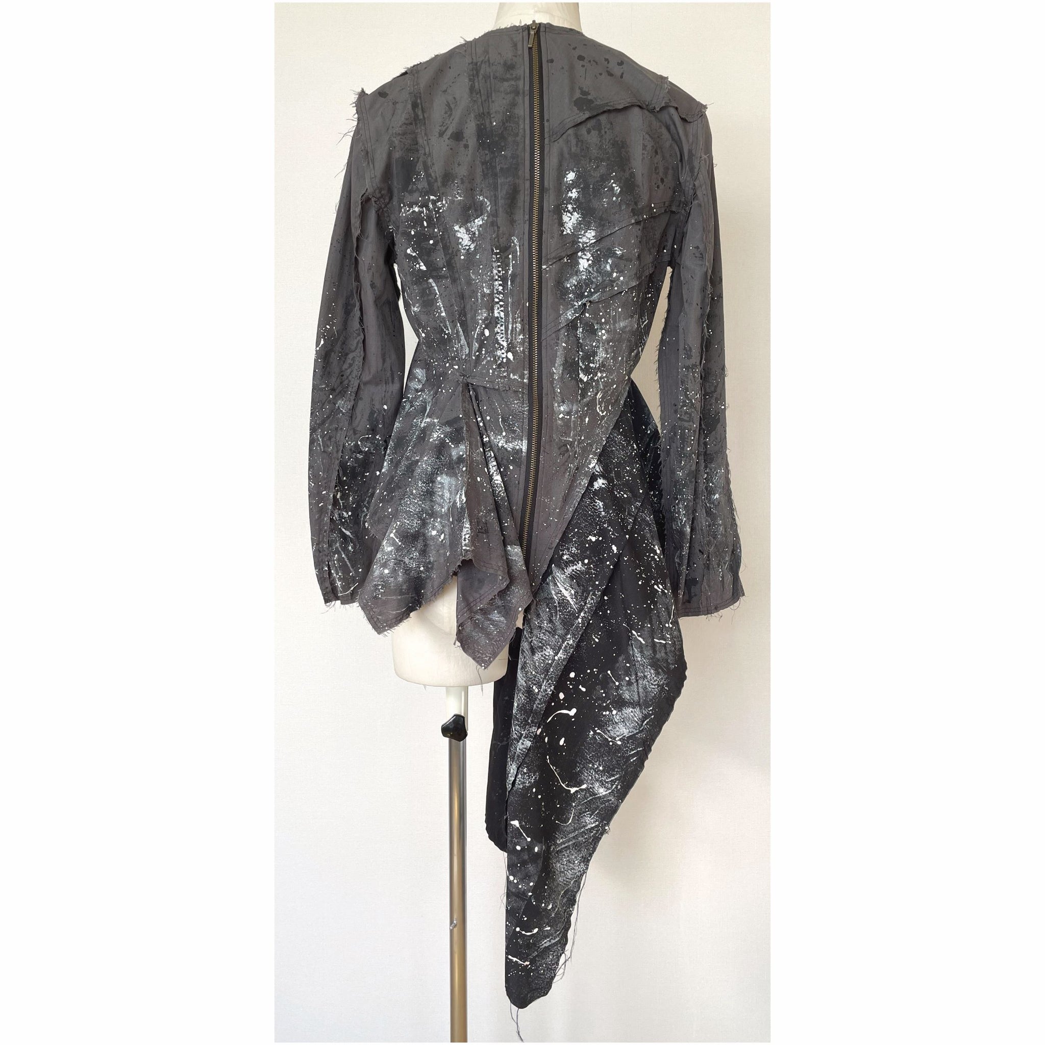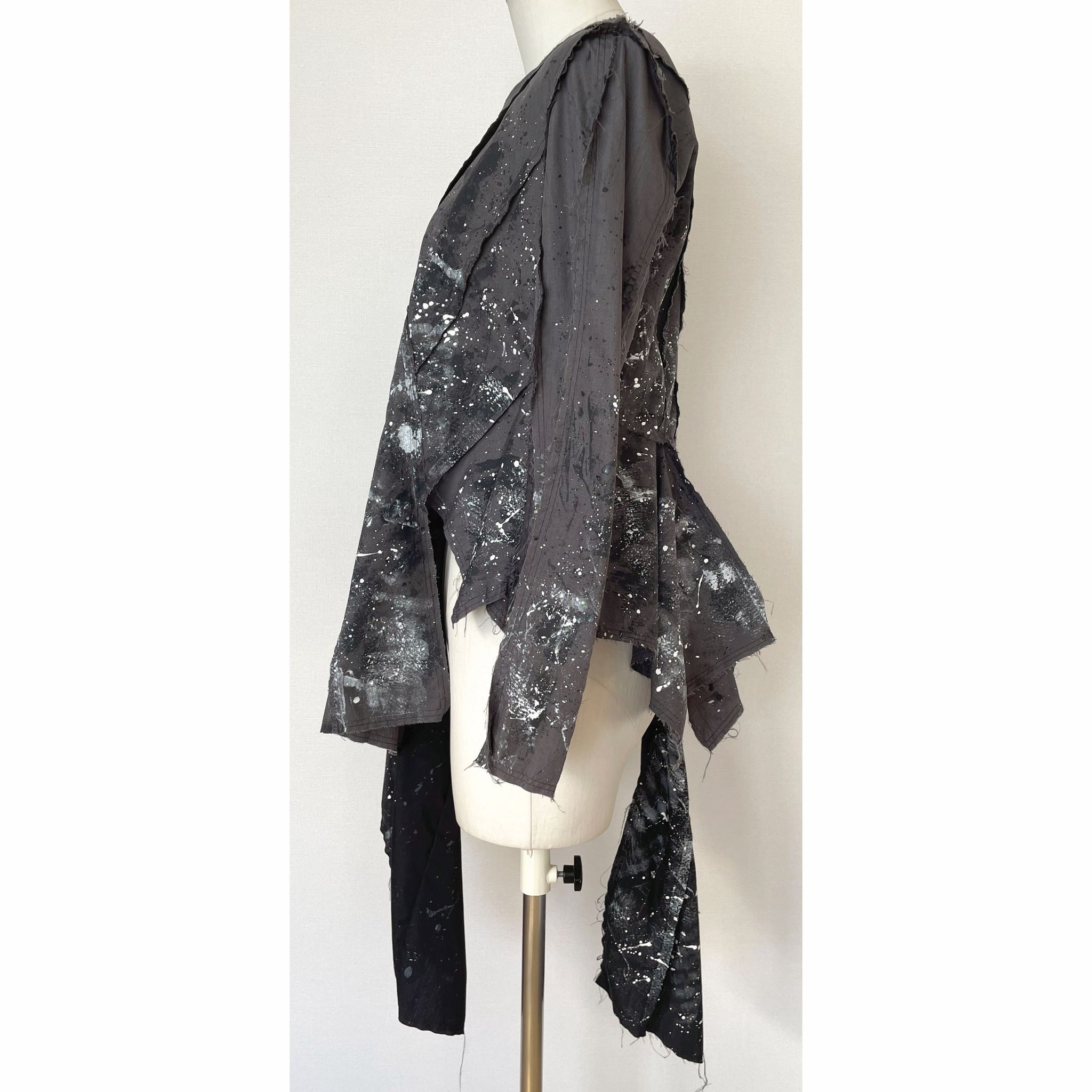 生地用の絵の具を使い、直接生地にペイントしており、デザイン、型紙、縫製まですべての工程をデザイナー自身が一人で行った1点物です。