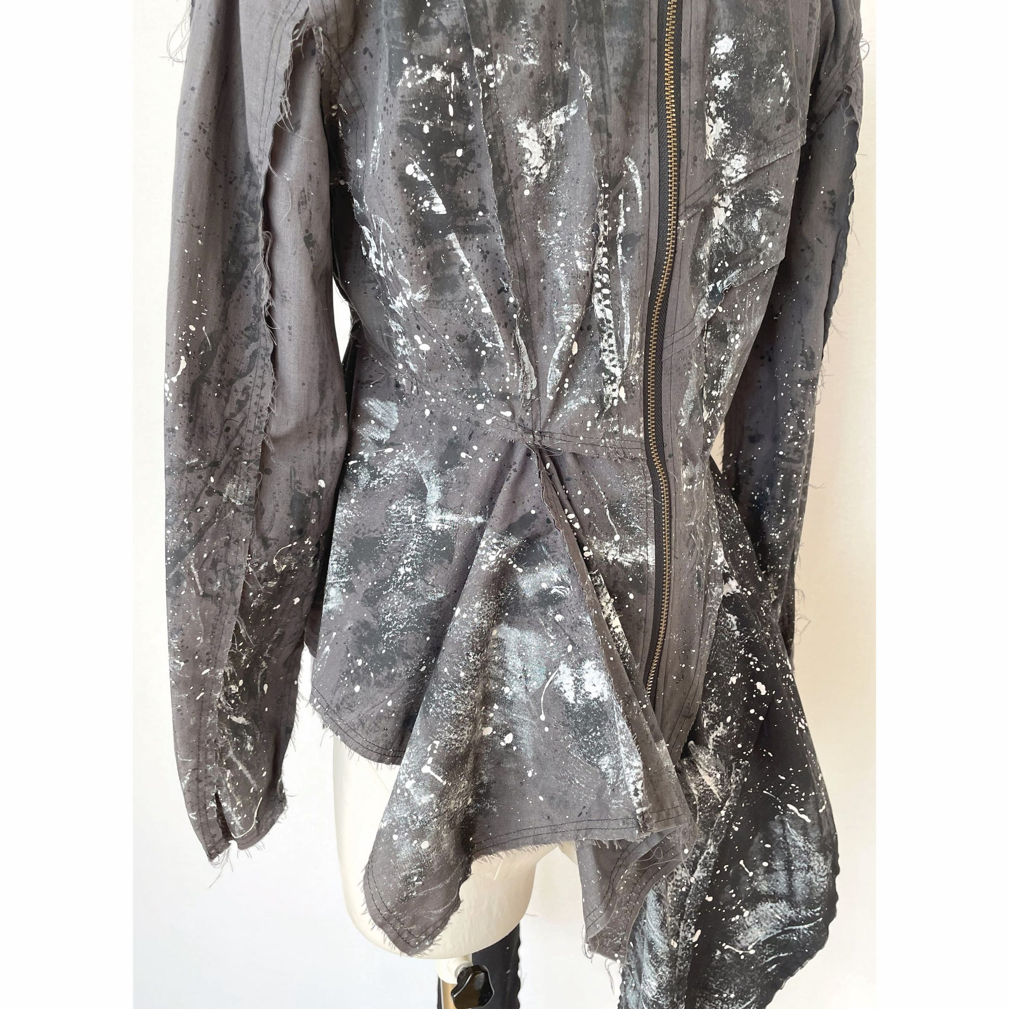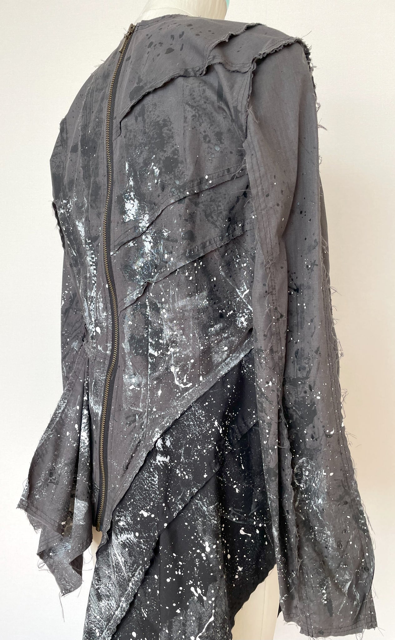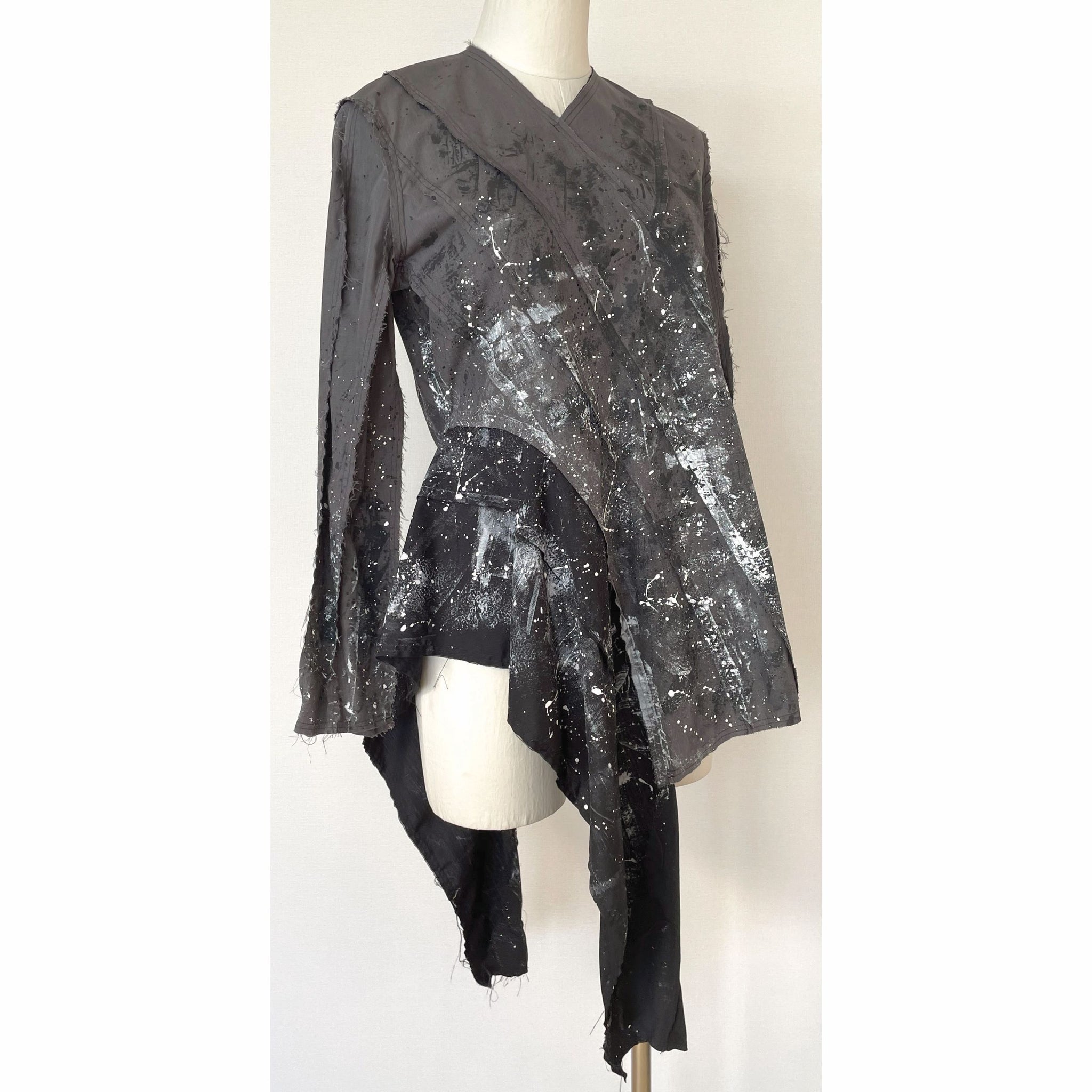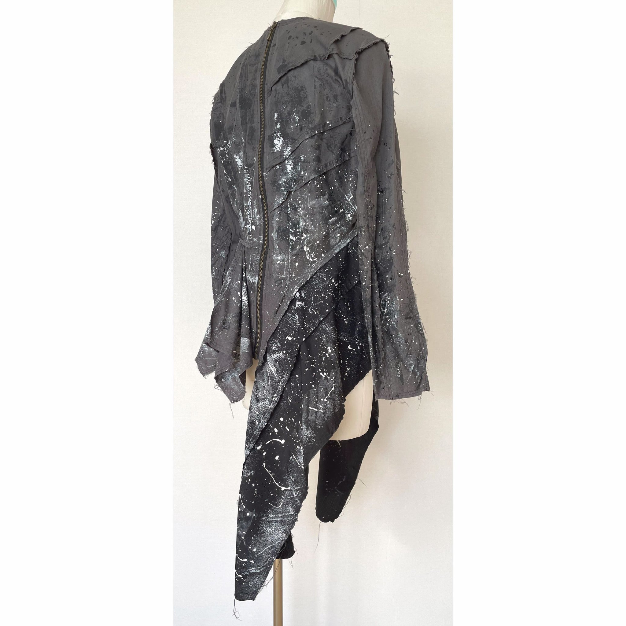 生地用の絵の具を使い、直接生地にペイントしており、デザイン、型紙、縫製まですべての工程をデザイナー自身が一人で行った1点物です。