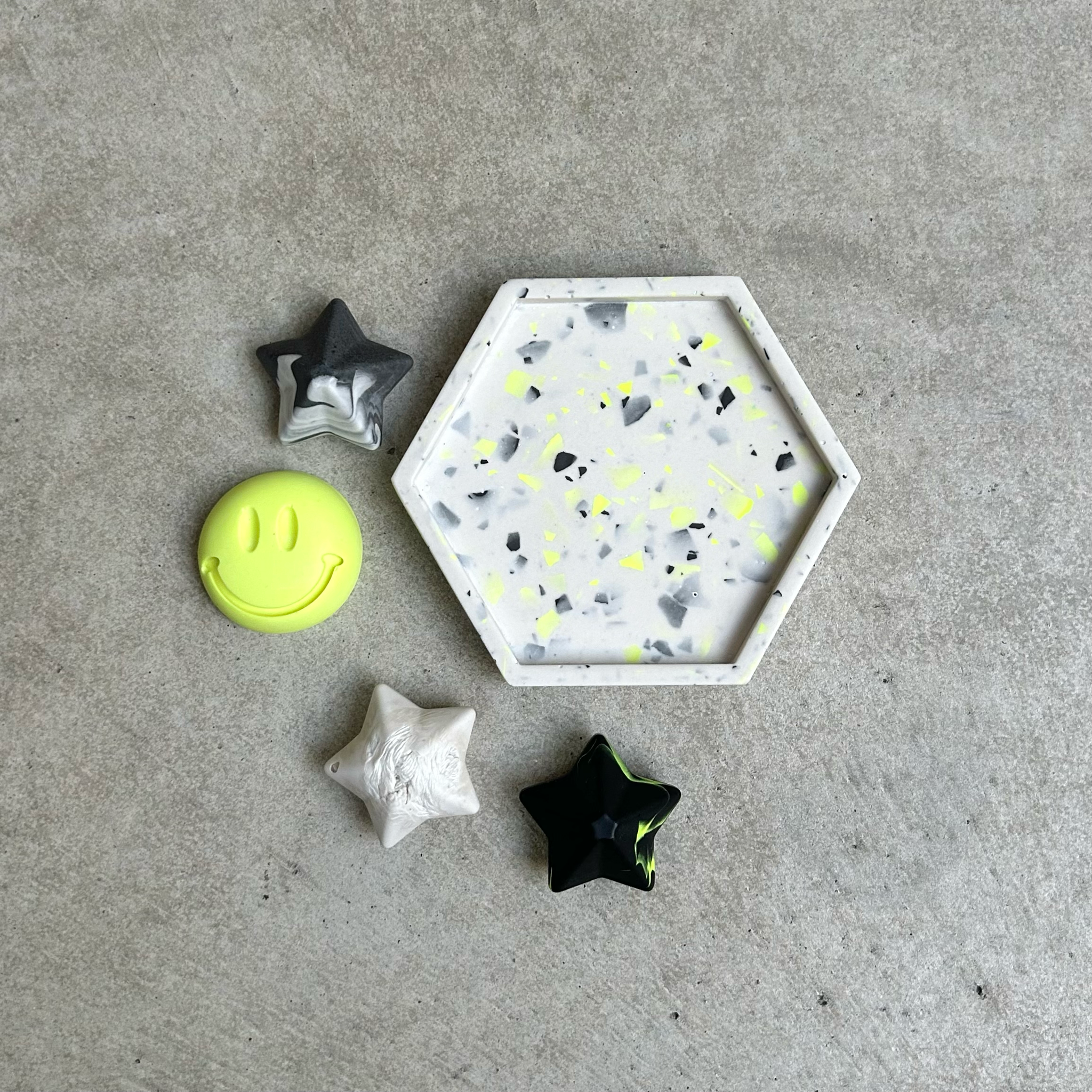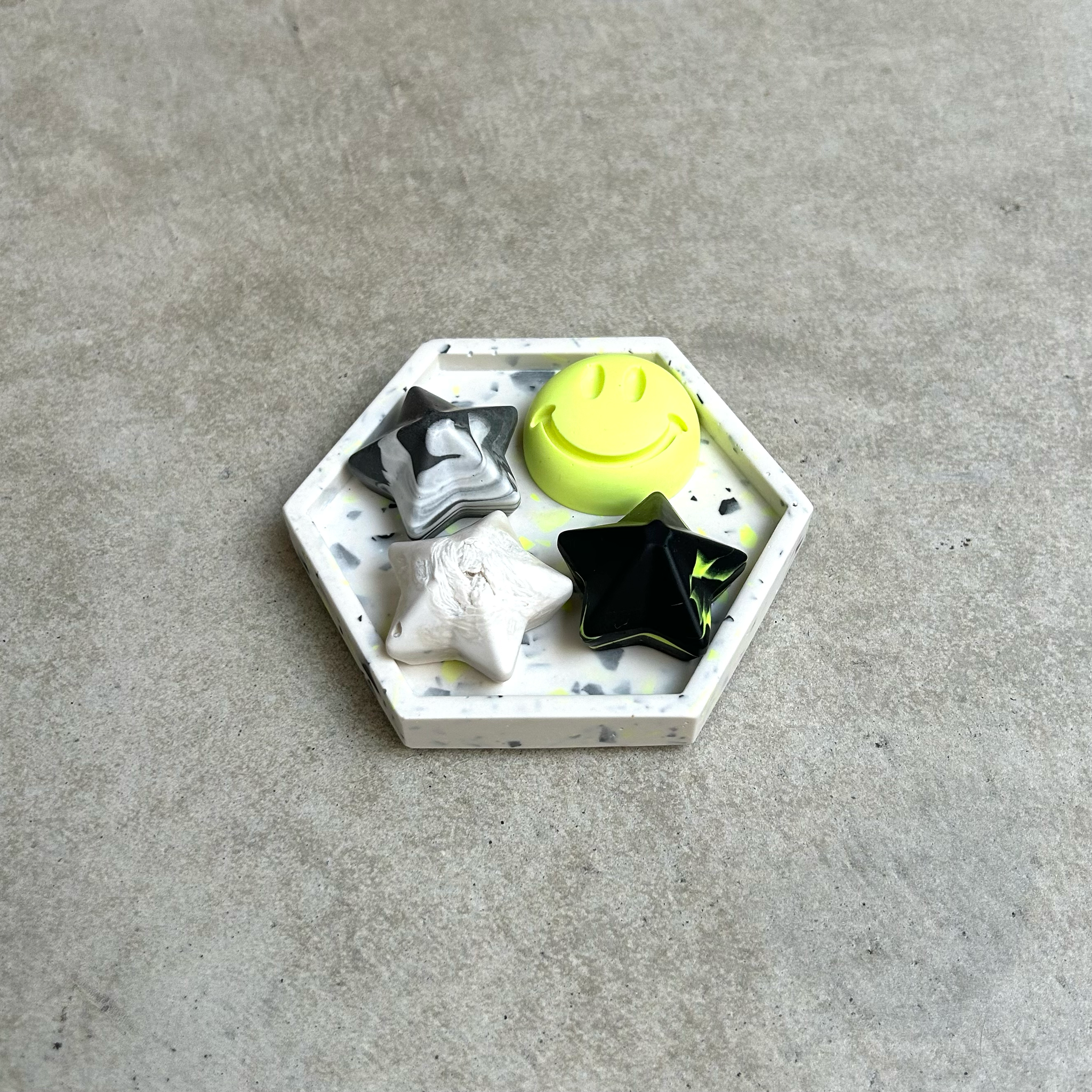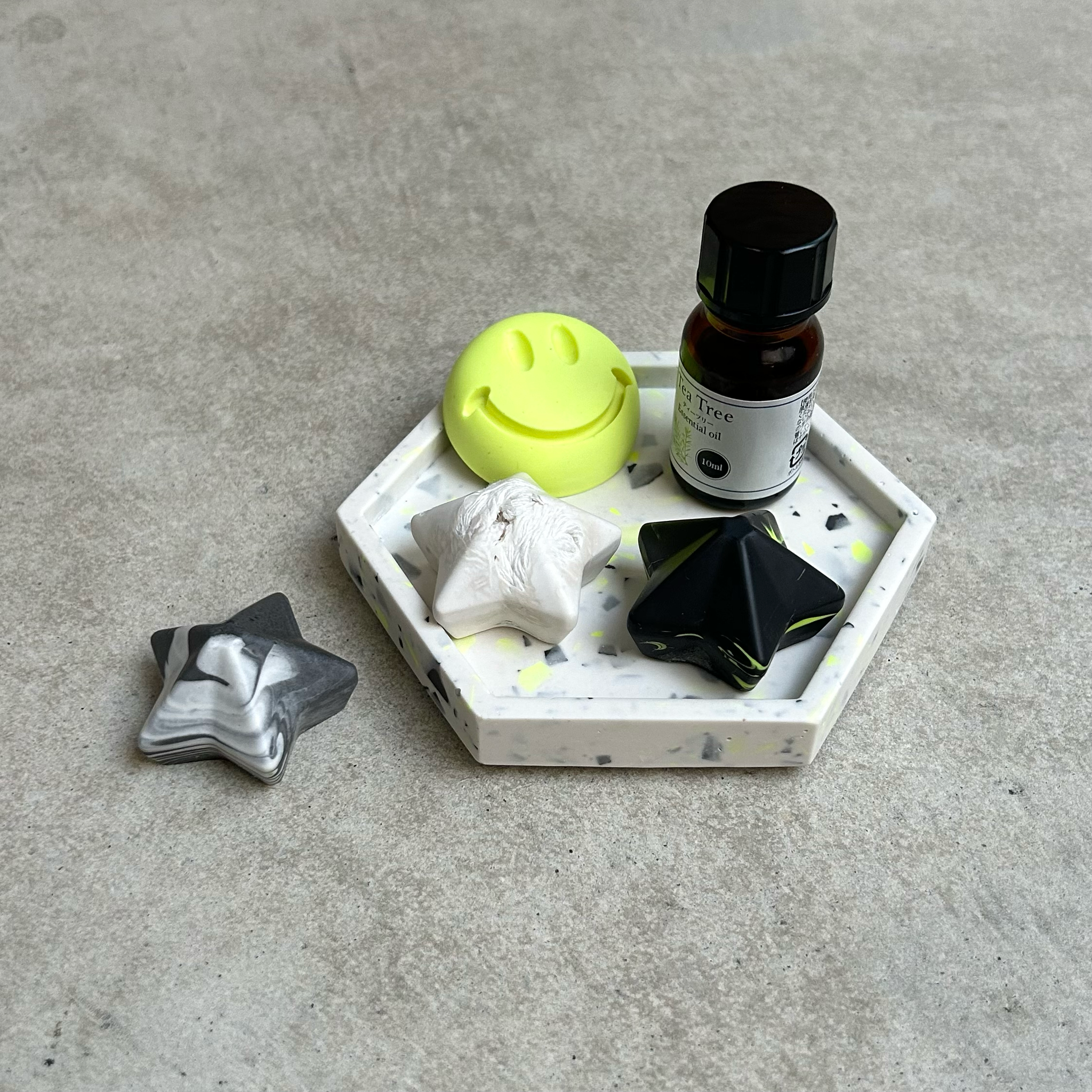アロマを垂らして使うには香りが消えてしまいやすいJesmoniteに、その紐を混ぜ込んでみたところ、紐はより香りを放ち、長い時間楽しめ、エコにもなったので今回白い星形のみに採用しています。