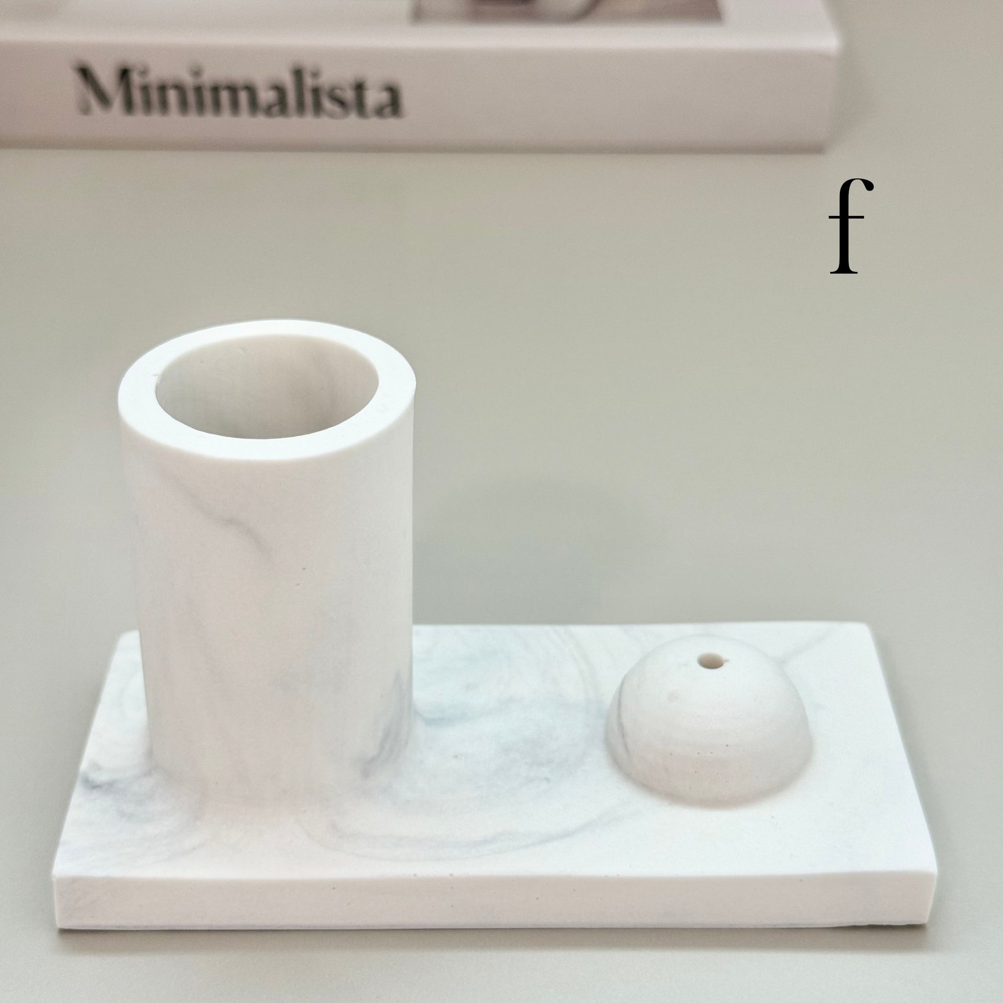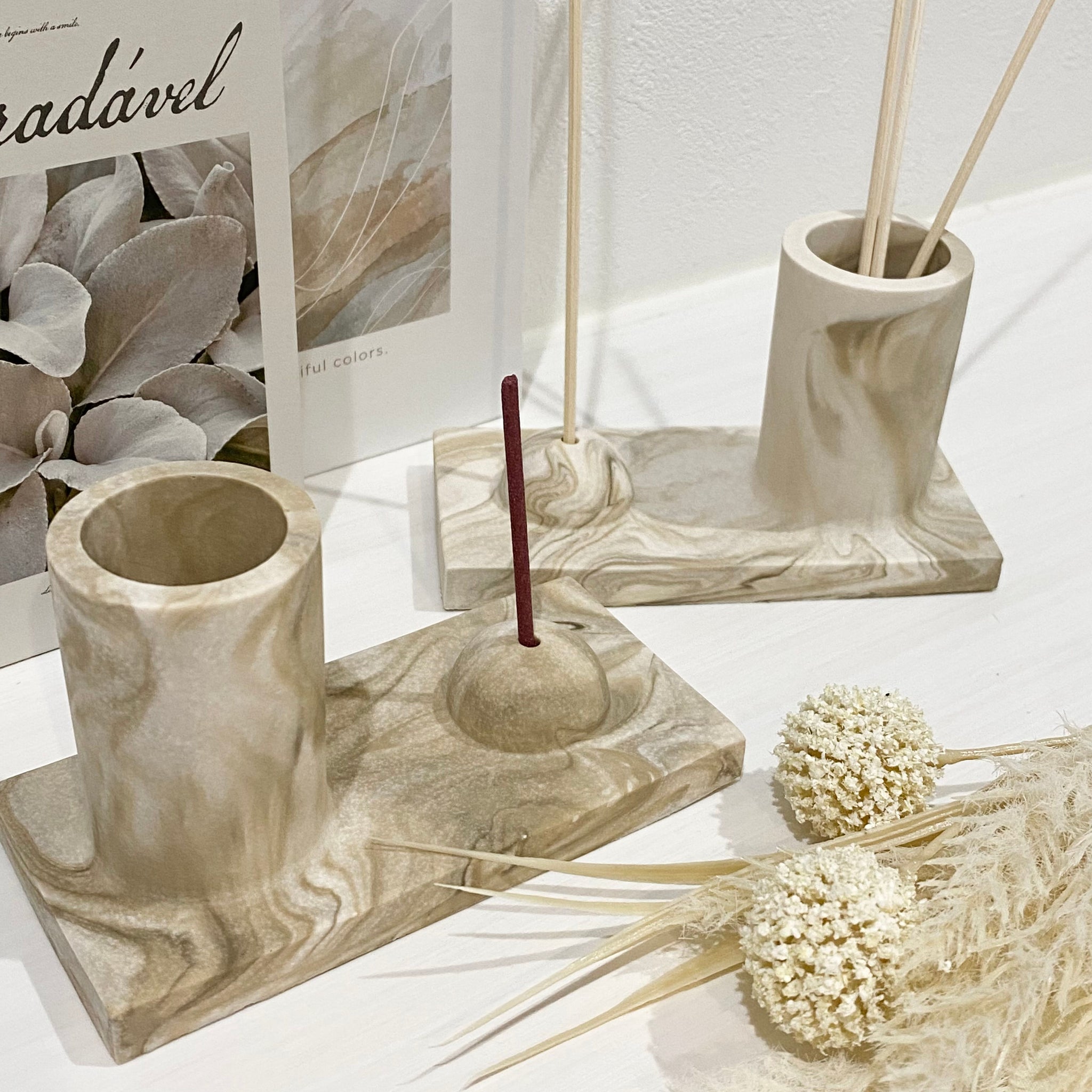 お香をまとめておけるホルダーと一体になっていて、マーブル模様が引き立つインパクトのある作品になっています。